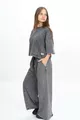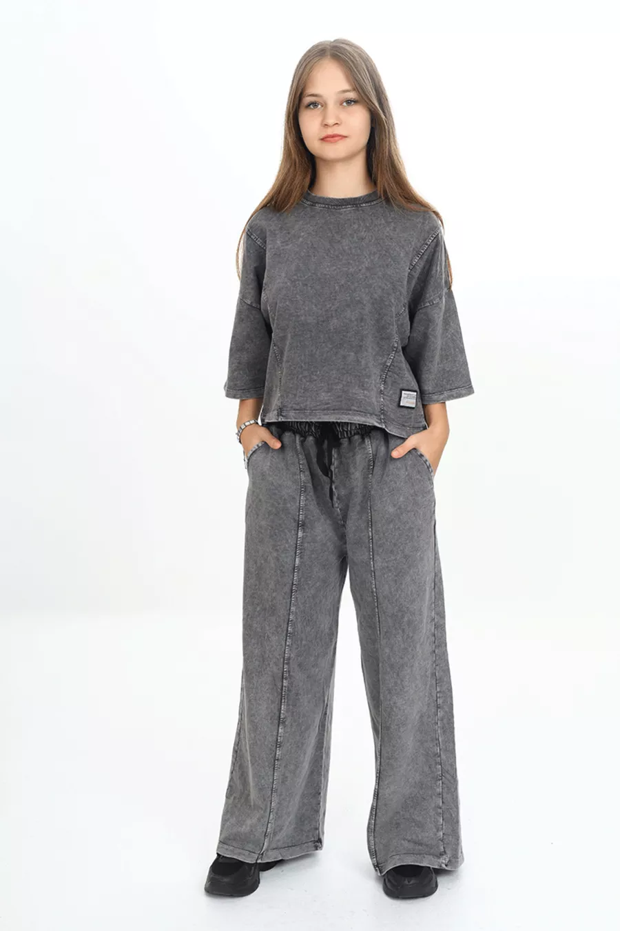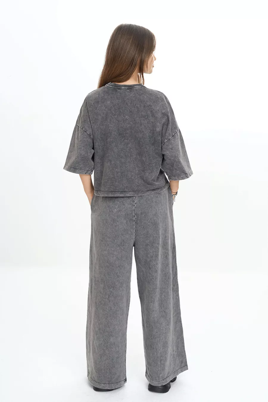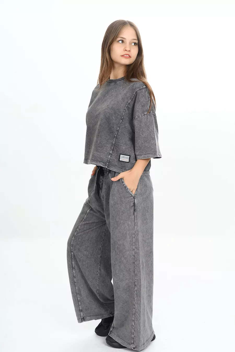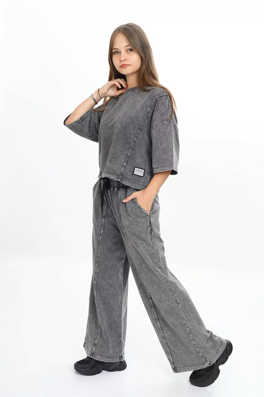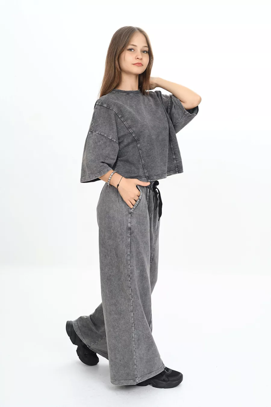 Material: Cotton Polyester Closure Type: Open Leg Length: Long Leg Style: Wide Leg Sleeve Type: Short Sleeve Fit: Regular Color: Gray Sleeve Length: Short Pattern: Solid Pocket: No Pockets Collection: Sportswear Package Content: Set of 2 Fabric Type: Knitted Additional Feature: Washable Print/Embroidery Technique: No Print Weave Type: 2-Ply Without Carding Sustainability Detail: No Persona: Fashion Forward Waist: Regular Waist Environment: Sportswear Height: Standard Silhouette: Basic Material Composition: 70% Cotton, 24% Polyester, 6% Spandex Neck Type: Crew Neck Top-Bottom Set: Sweatshirt-Pants Washing Instruction: T01 Season: Spring / Autumn Origin: TR Number of Pieces: 2