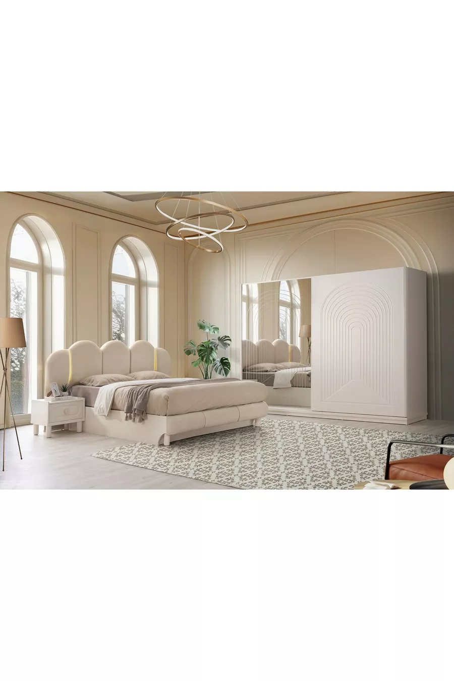 Color: Multicolor Warranty Period: 2 Years Bed/Base Size: 160 x 202 cm Bed Function: With Base Wardrobe Function: Sliding Wardrobe Body Material: MDF Number of Doors: 6 Set Contents: Bed with Base + 2 Nightstands + Dresser + Wardrobe Style: Modern Theme / Style: Modern Country of Origin: TR