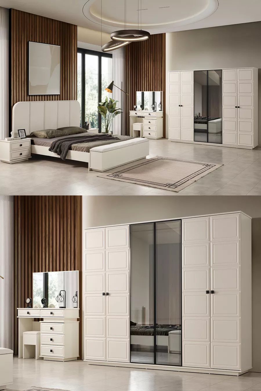 Color: White Warranty Period: 2 Years Bed/Base Size: 160 x 200 Bed Function: With Storage Base Wardrobe Function: With Doors Wardrobe Body Material: MDF Number of Doors: 6 Set Contents: Bed with Storage Base + 2 Nightstands + Dresser + Wardrobe Style: Modern Theme / Style: Modern Origin: Turkey
