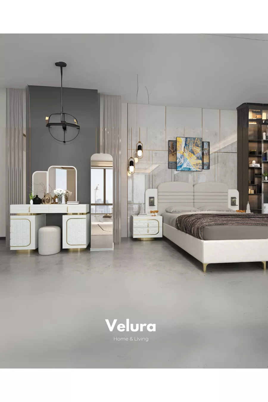 Set Contents: Bed + 2 Nightstands + Dresser + Wardrobe + Mirror