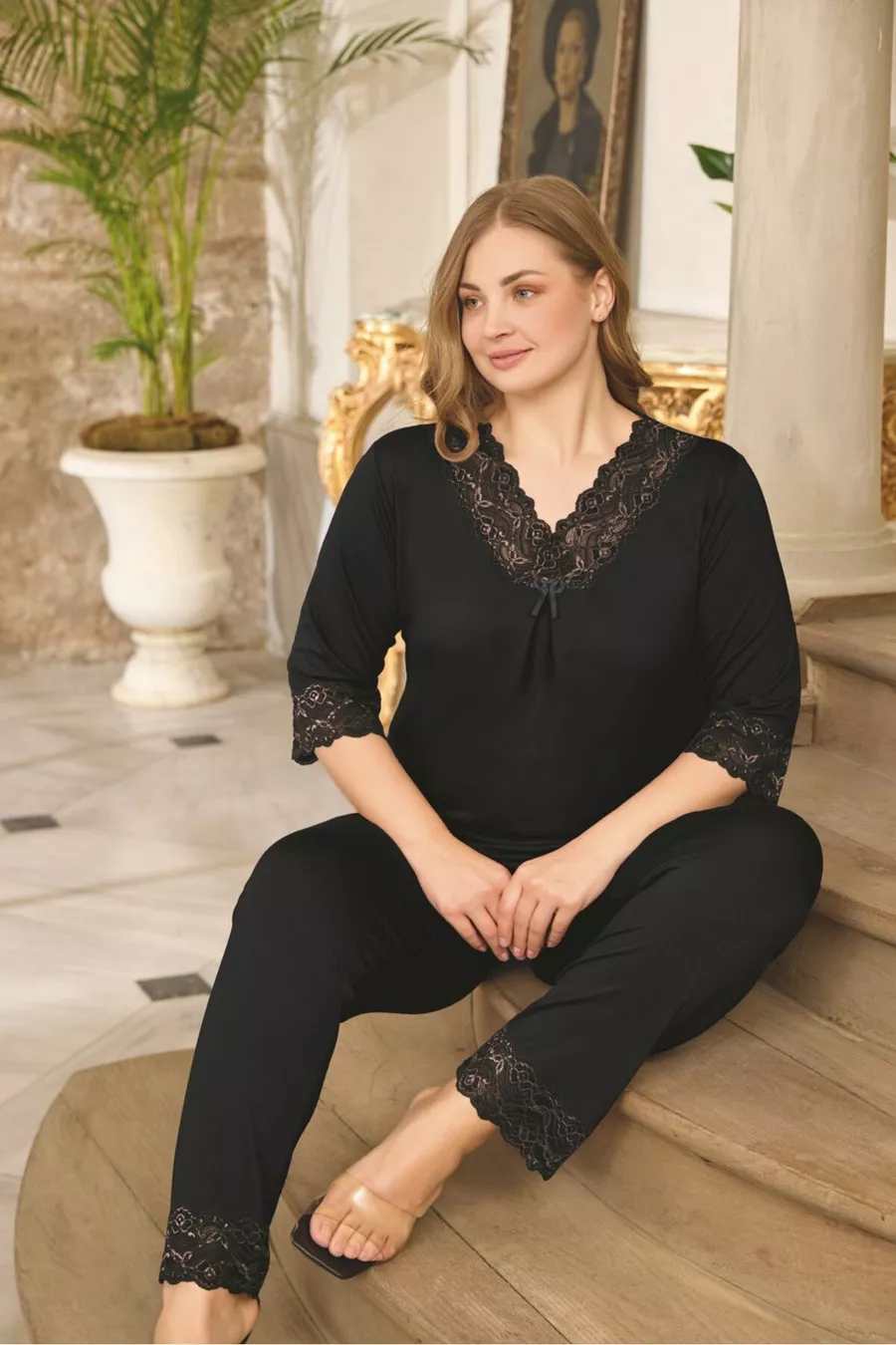 Additional Feature: Does not pill Color: Multicolor Sleeve Type: Short Sleeve Pattern: Solid Neck Type: Lace Collar Pant Length: Long Material: Viscose Fit: Regular Fabric Type: Not Specified Occasion: Homewear Sustainability Detail: No Silhouette: Regular Sleeve Length: Short Weave Type: Lace Waist: Regular Waist Set: T-shirt-Pants Persona: Cool & Comfort Material Composition: 100% Ring Viscose Number of Pieces: 2 Pieces Washing Instructions: Wash gently at a maximum temperature of 30 °C. Do not use bleach. Do not tumble dry. Iron at low temperature. Dry cleaning is not allowed Pant Type: Non-elastic Hem Collection: Plus Size Package Contents: 2-piece Length: Long Season: All Seasons Origin: TR