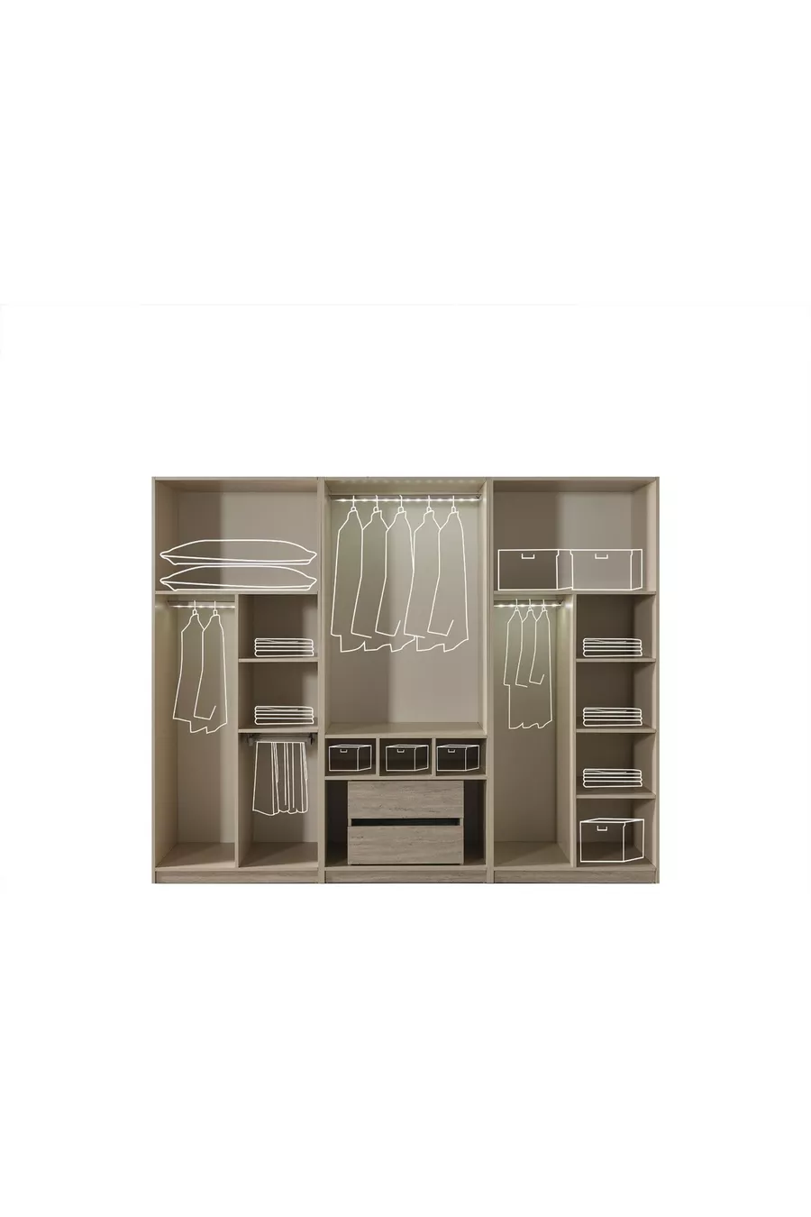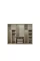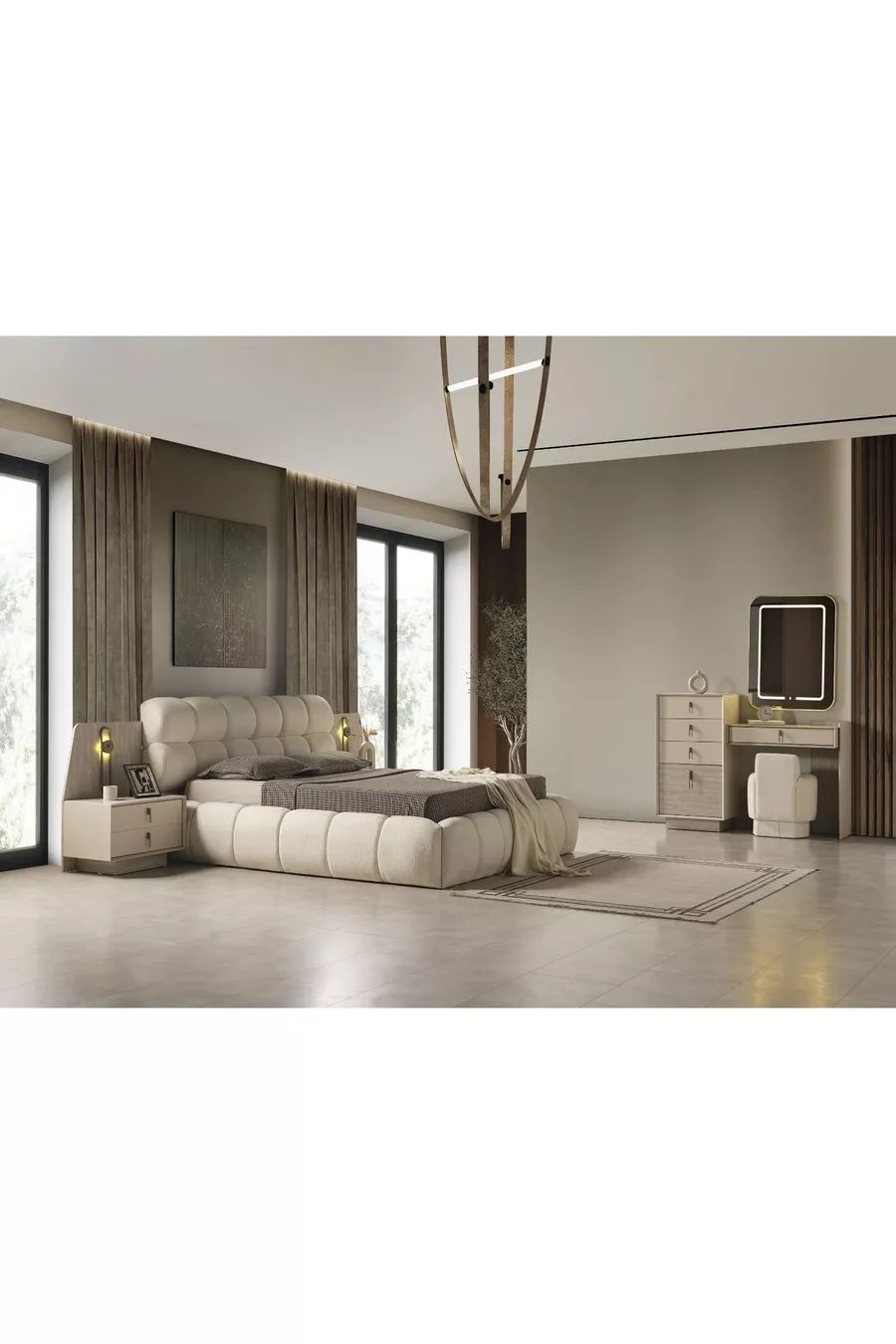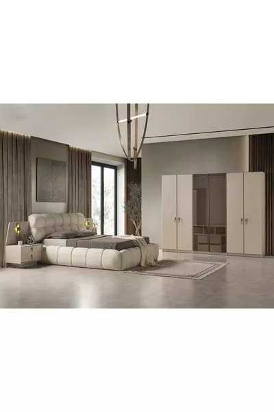 Color: Ecru Warranty Period: 2 Years Bed/Base Size: 160 x 202 Bed Function: With Base Wardrobe Function: With Glass Wardrobe Body Material: Wood Number of Doors: 6 Set Contents: Bed with Base + 2 Nightstands + Dresser + Wardrobe Style: Modern Theme / Style: Modern Origin: TR