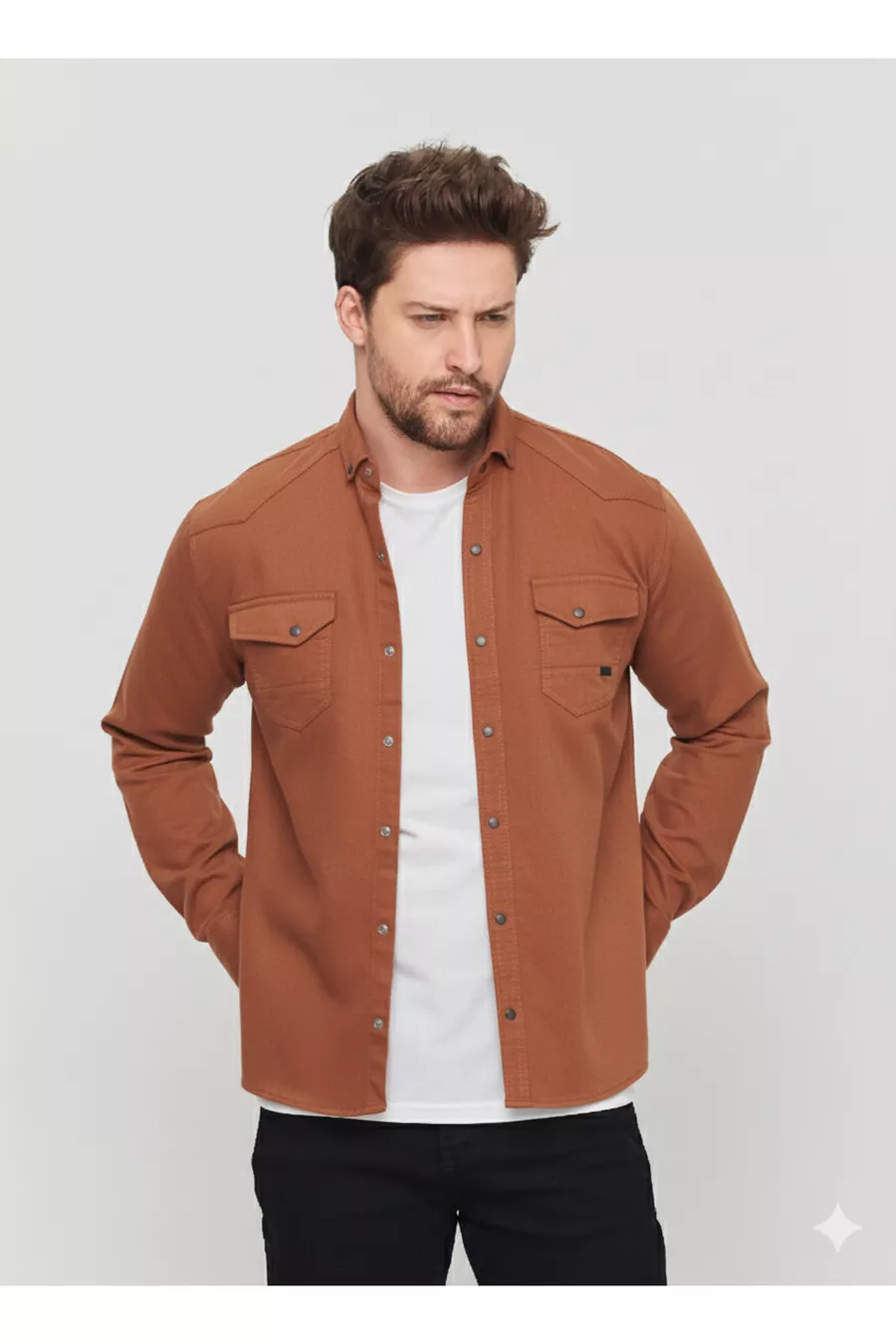 Pattern: Plain Fit: Slim Fit Collar Type: Buttoned Collar Fabric Type: Denim Sleeve Type: Long Sleeve Color: Orange Material: Cotton Closure Type: Snap Button Product Detail: Snap Button Pocket: Double Flap Sleeve Length: Long Collection: Sportswear Length: Regular Occasion: Casual/Daily Silhouette: Slim Additional Feature: No Additional Feature Weave Type: Gabardine Print/Embroidery Technique: No Print Persona: None Sustainability Detail: No Belt/Strap Status: Without Belt Material Composition: 95% Cotton, 5% Elastane Washing Instructions: TYPE 1 Season: All Seasons Origin: TR Box Status: No Box
