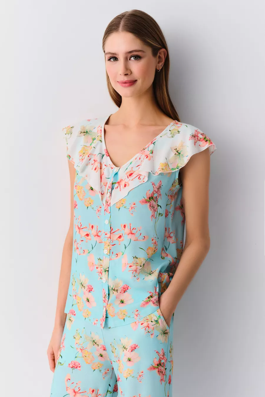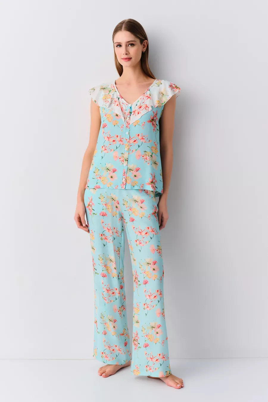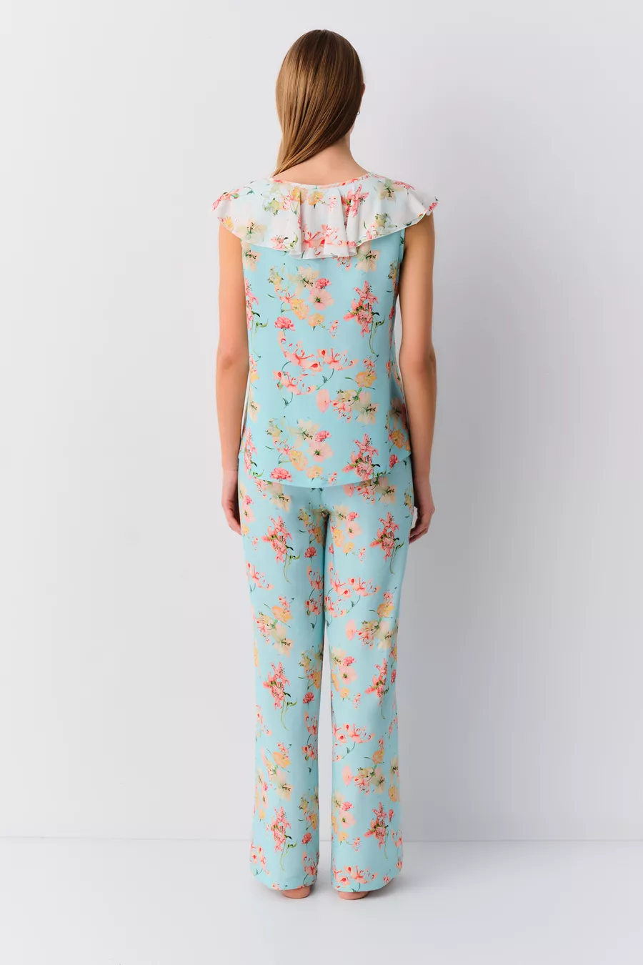 Sustainability Detail: No Sleeve Type: Strappy Pattern: Floral Neckline Type: V-Neck Pant Length: Long Color: Blue Material: Viscose Product Type: Printed Sleeve Length: Strappy Fit: Regular Fabric Type: Woven Waist: Regular Waist Number of Pieces: 2 Occasion: Homewear Washing Instructions: Type 1 Pant Style: Straight Leg Length: Standard Origin: TR