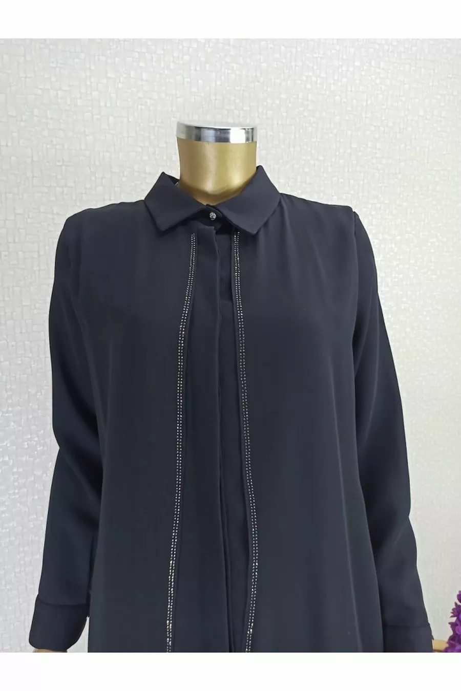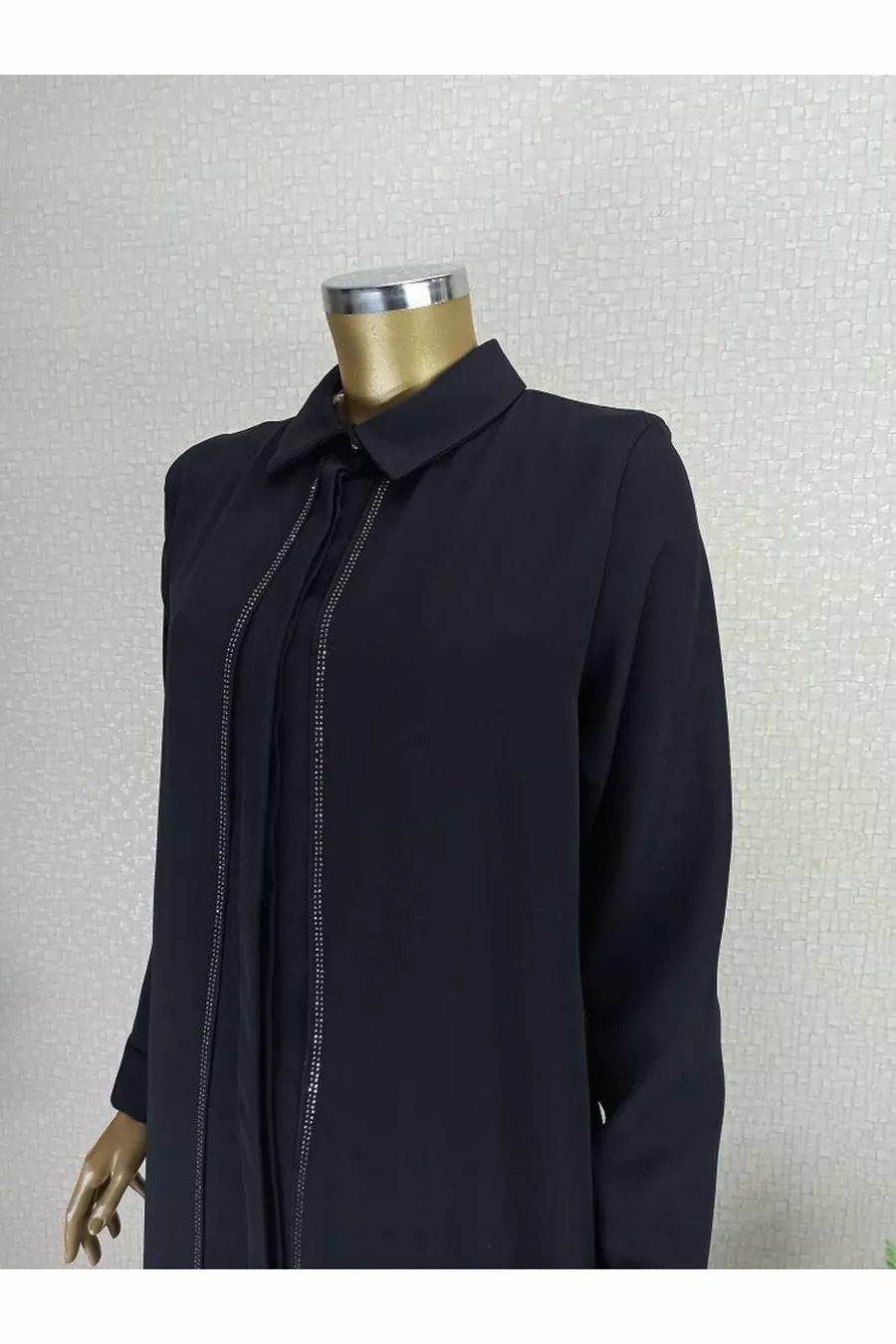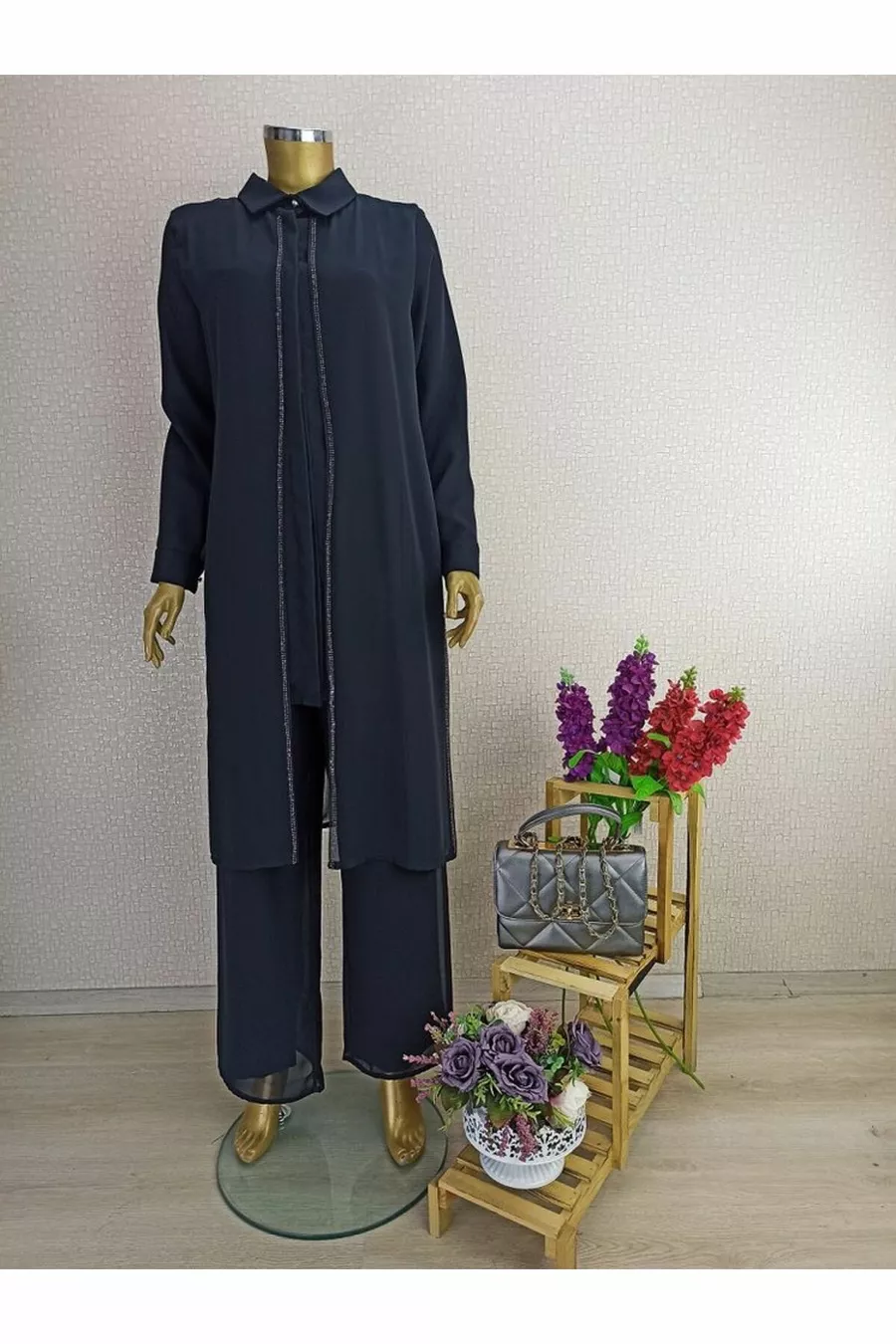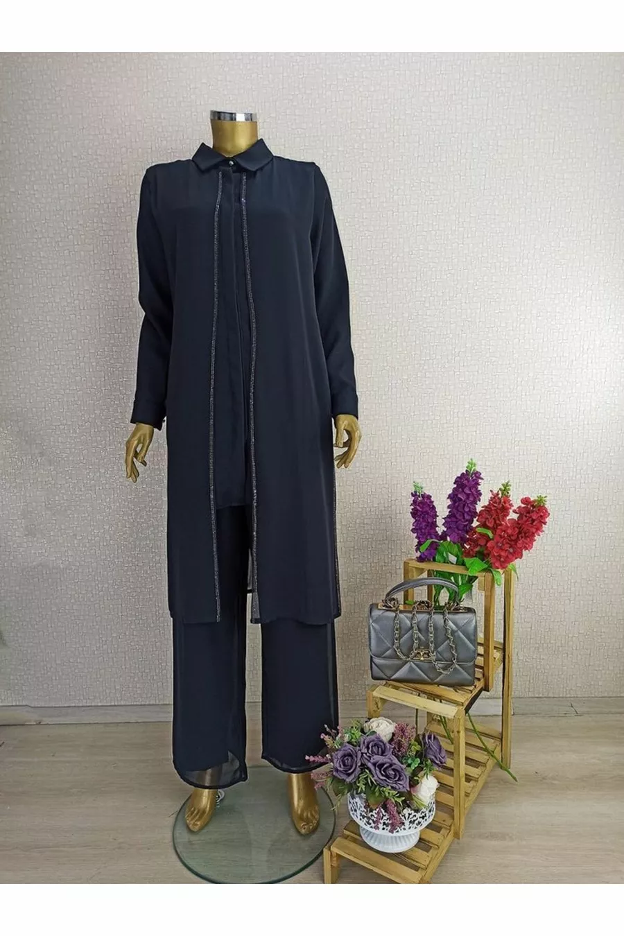 Front Detailed Stone Sleeve Ends Buttoned Shirt Collar Evening Dress Set Qks Suit ##