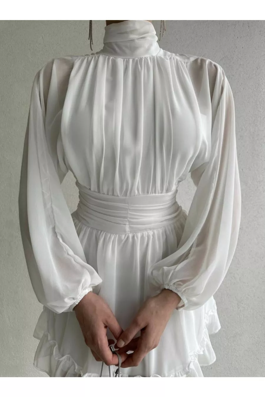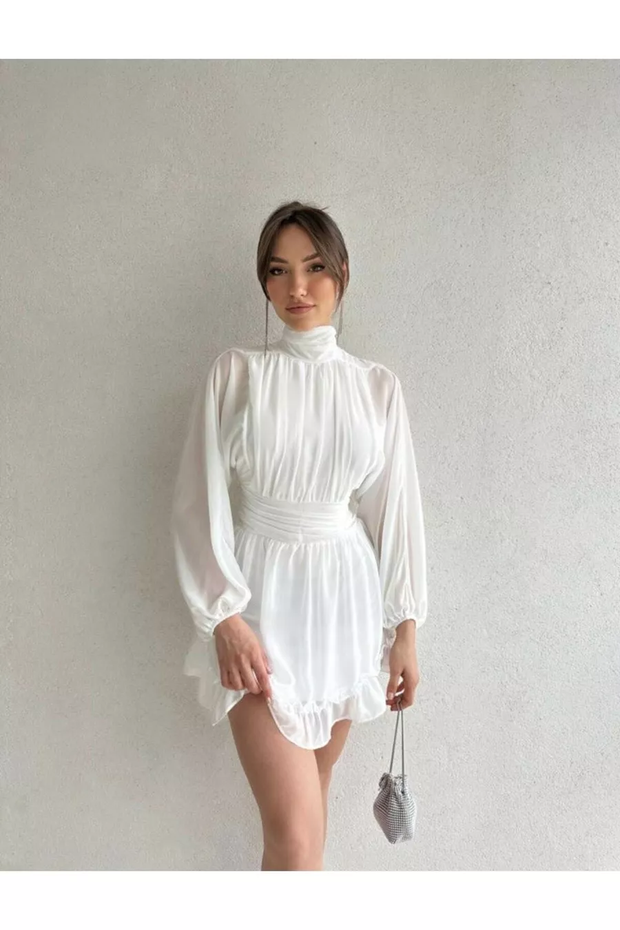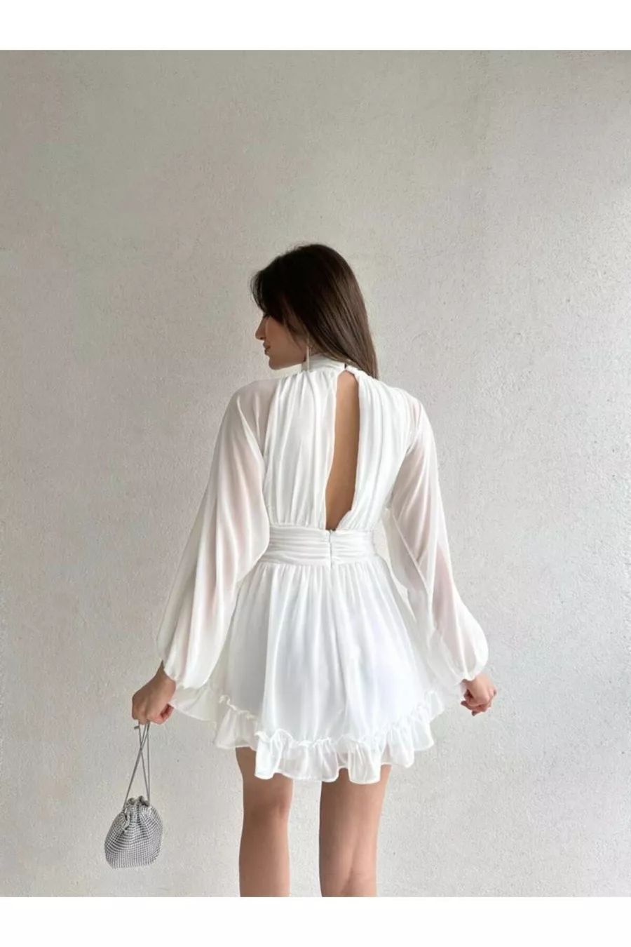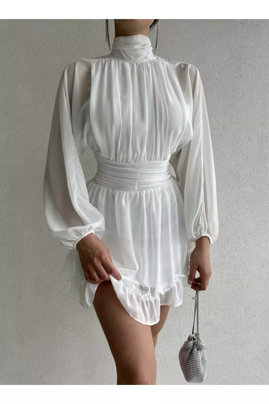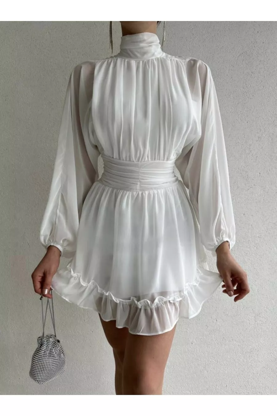 High Neck, Back Cutout, Pleated, Tulle Sleeve Mini Chiffon Dress