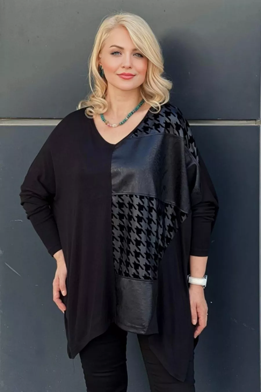 Pattern: Houndstooth Fit: Oversize Neck Type: V-Neck Fabric Type: Knit Material: Faux Leather Sleeve Type: Batwing Sleeve Color: Black Occasion: Casual/Everyday Length: Long Sleeve Length: Long Print/Embroidery Technique: No Print Additional Feature: Patterned Persona: Cool & Comfort Pocket: No Pocket Weave Type: Faux Leather Belt/Strap: No Belt Sustainability Detail: No Silhouette: Basic Thickness: Medium Washing Instructions: T1 Season: Spring / Autumn Origin: TR