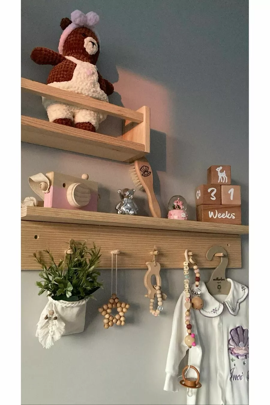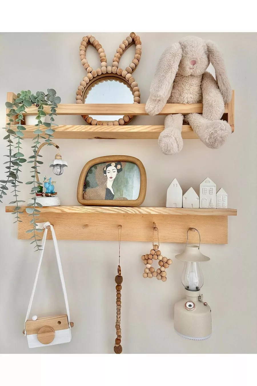 Theme / Style: Scandinavian Material: Wood Depth: 9 cm Width: 50 cm Height: 12 cm Color: Beige Number of Shelves: 2 Style: Scandinavian Origin: TR Feature: Wall Mounted