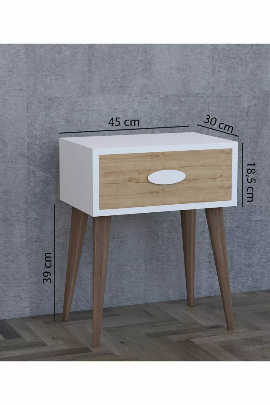 Material: Particleboard Color: White Number of Drawers: 1 Height: 57 cm Width: 45 cm Depth: 30 cm Style: Scandinavian Theme / Style: Modern Origin: Turkey