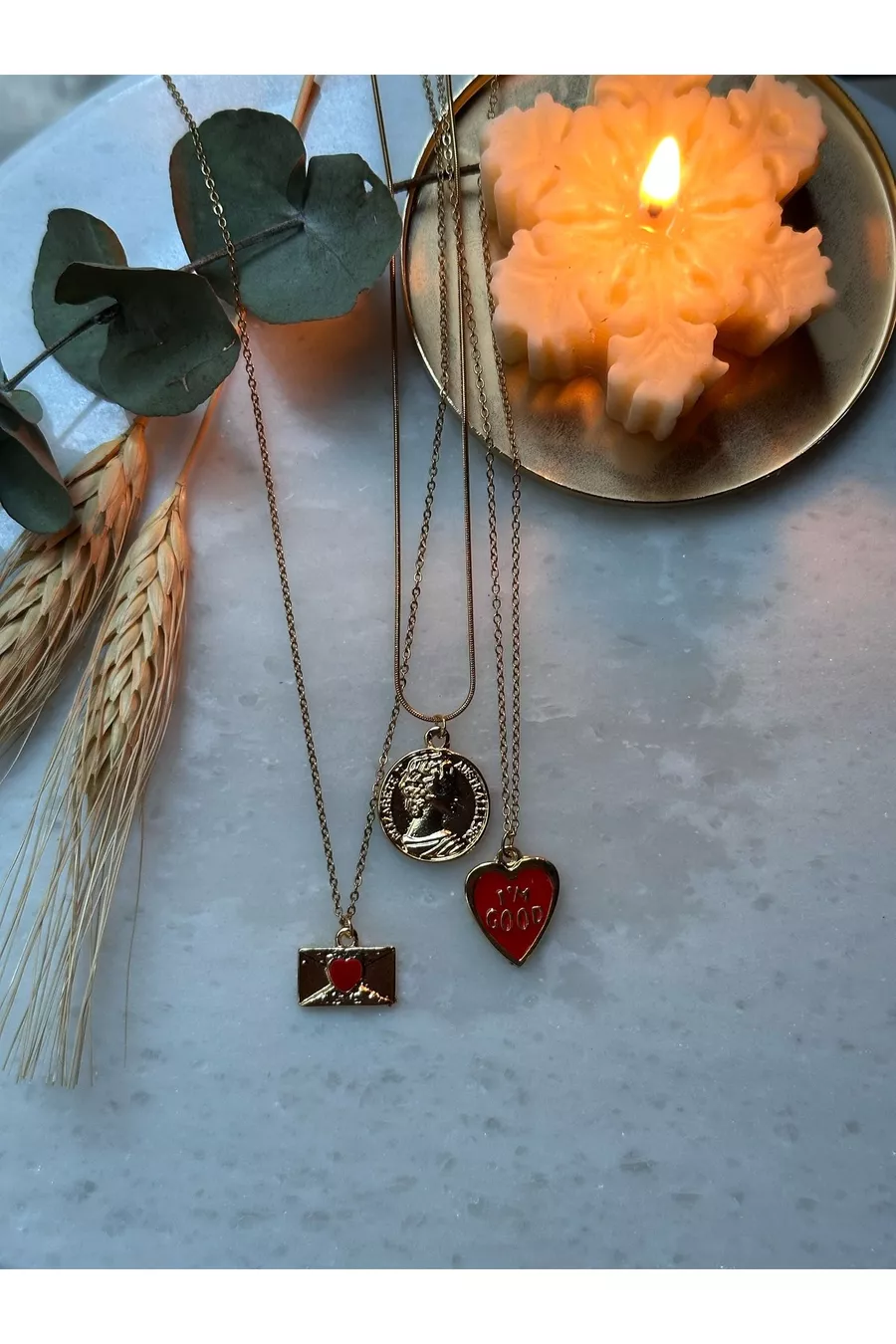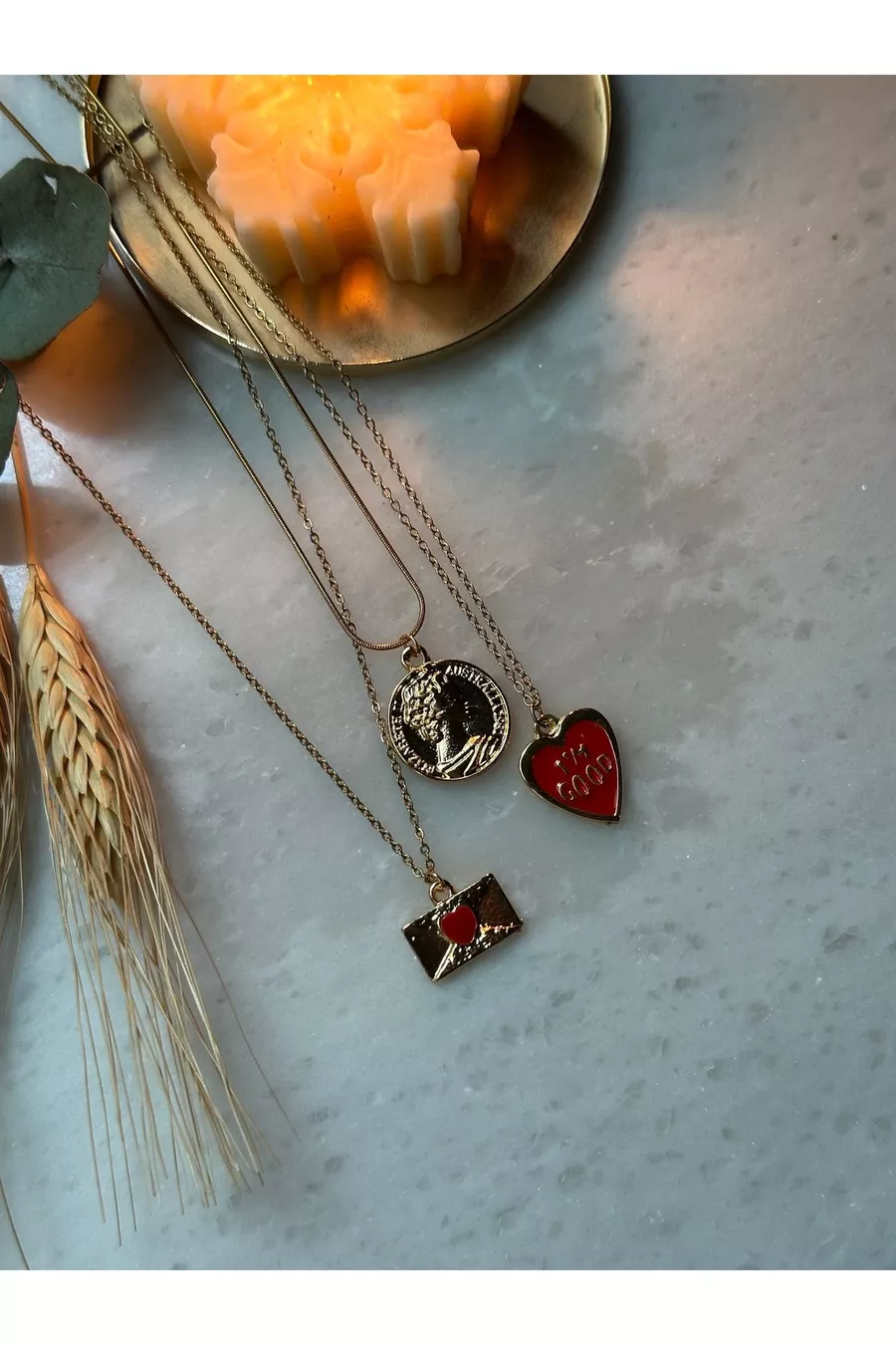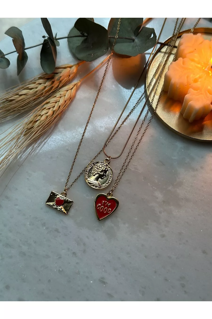 L Kararmaz Stainless Steel Gold-Plated Medallion/Letter Envelope Triple Necklace Set