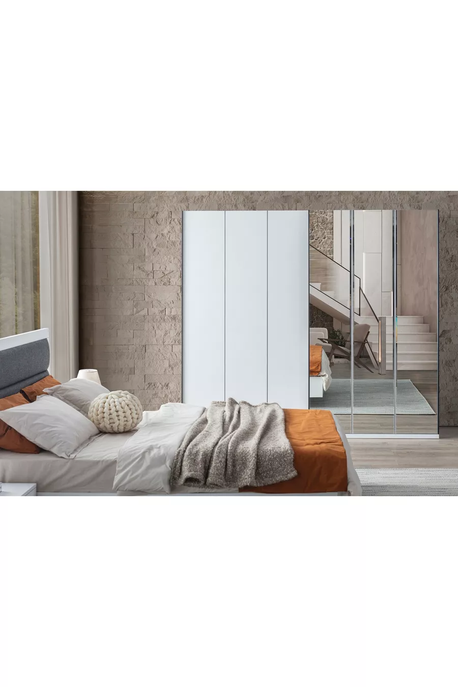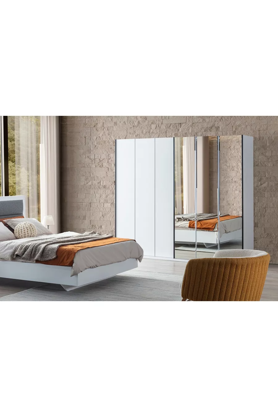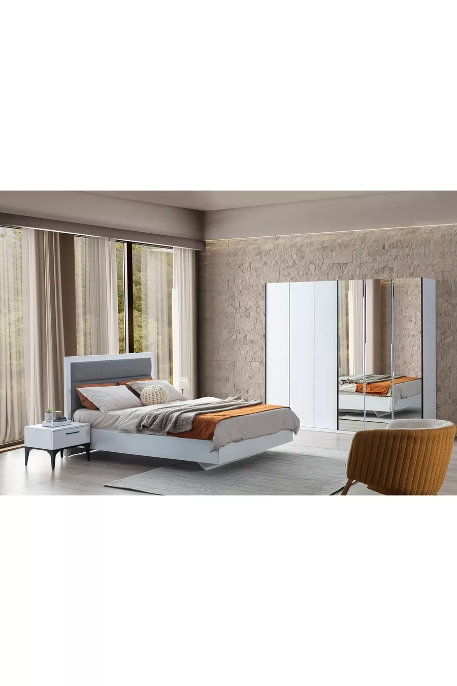 Color: Ecru Warranty Period: 2 Years Bed/Base Size: 160 x 200 Bed Function: Without Base Wardrobe Function: Sliding Wardrobe Body Material: Particleboard Number of Doors: 10 Set Contents: Bed + 2 Nightstands + Dresser + Wardrobe Style: Modern Theme/Style: Modern Origin: UM Feature: With Doors