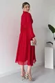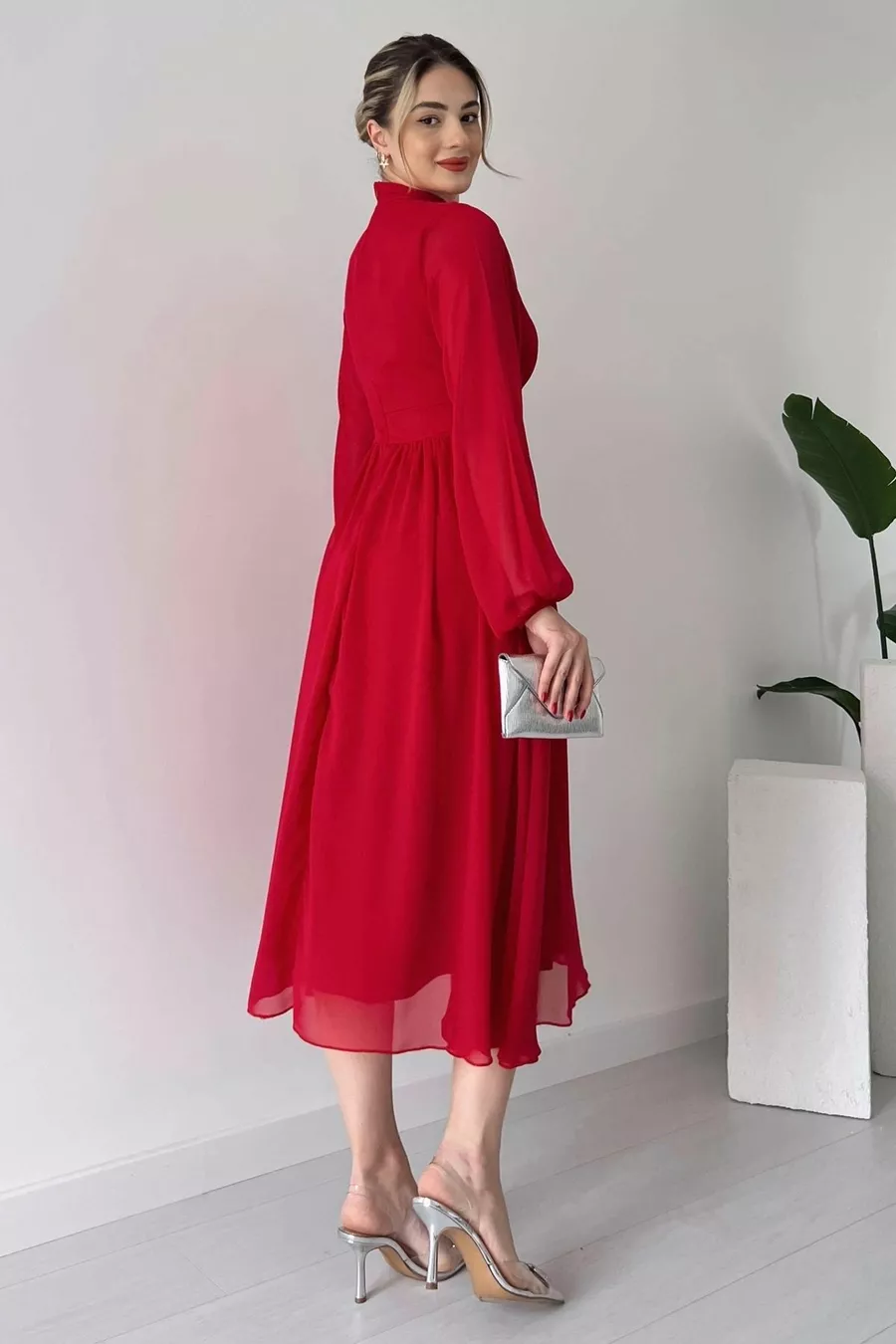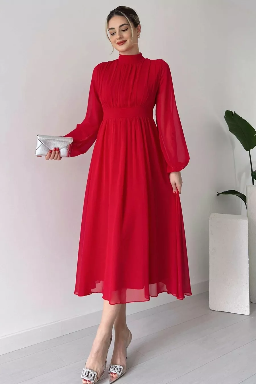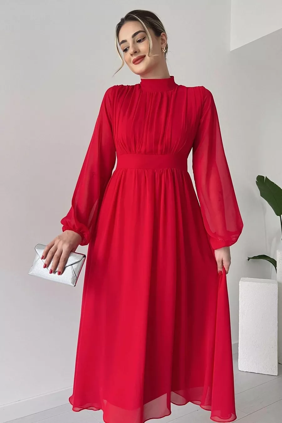 This product will be shipped by \xa0 Quenmadam clothing\xa0. More than 10 stocks are offered to be sold at the campaign price. The seller determines the sales price of the product you have examined. A product can be sold by more than one seller. The sellers of the products offered for sale by more than one seller are ranked according to the price they set for the product, the seller ratings, the delivery status, the promotions in the products, whether the shipping is free or not, and whether the products can be delivered with fast delivery, the stock and categories of the products. A maximum of \xa010 pieces of this product can be ordered.\xa010 units can be ordered by Queenmadam.\xa0This limit is not valid for corporate orders, and different limits can be set for corporate orders. Free returns within 15 days. Click \xa0 for more information. Lined Chiffon Fabric Stand-Up Collar Flared Cut Long Sleeve Midi Length Red Evening Dress 094 The product on the mannequin is made of small 36 size chiffon fabric. There is no breast filling. It is lined. It is a Full Mold in your normal size. Mannequin Height: 173 cm Model Weight: 60 kg Product Length: 125 cm (may vary between 1-3 cm) Shoulder width 40 cm Sleeve Length: 65 cm Fabric: Chiffon Fabric Content: Polyamide - Polyester The product is designed as a lined upright collar dress up to size 36-40.