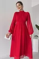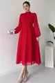 Lined Chiffon Fabric Stand Neck Flared Cut Long Sleeve Midi Length Red Evening Dress