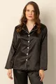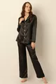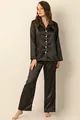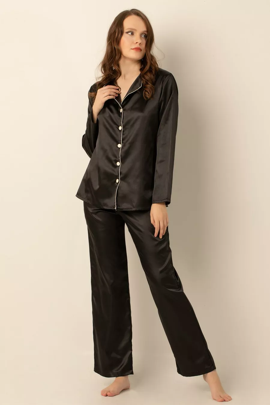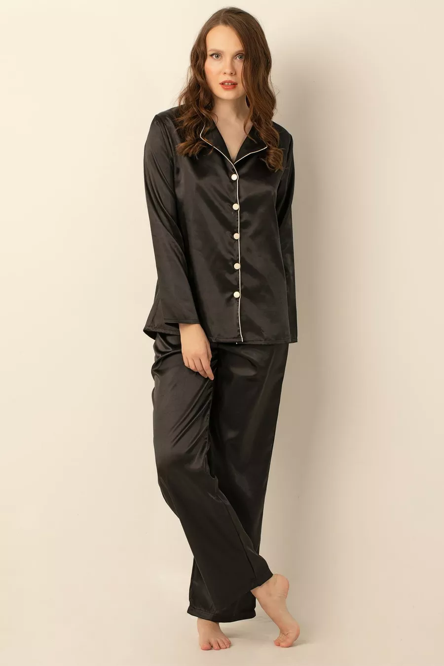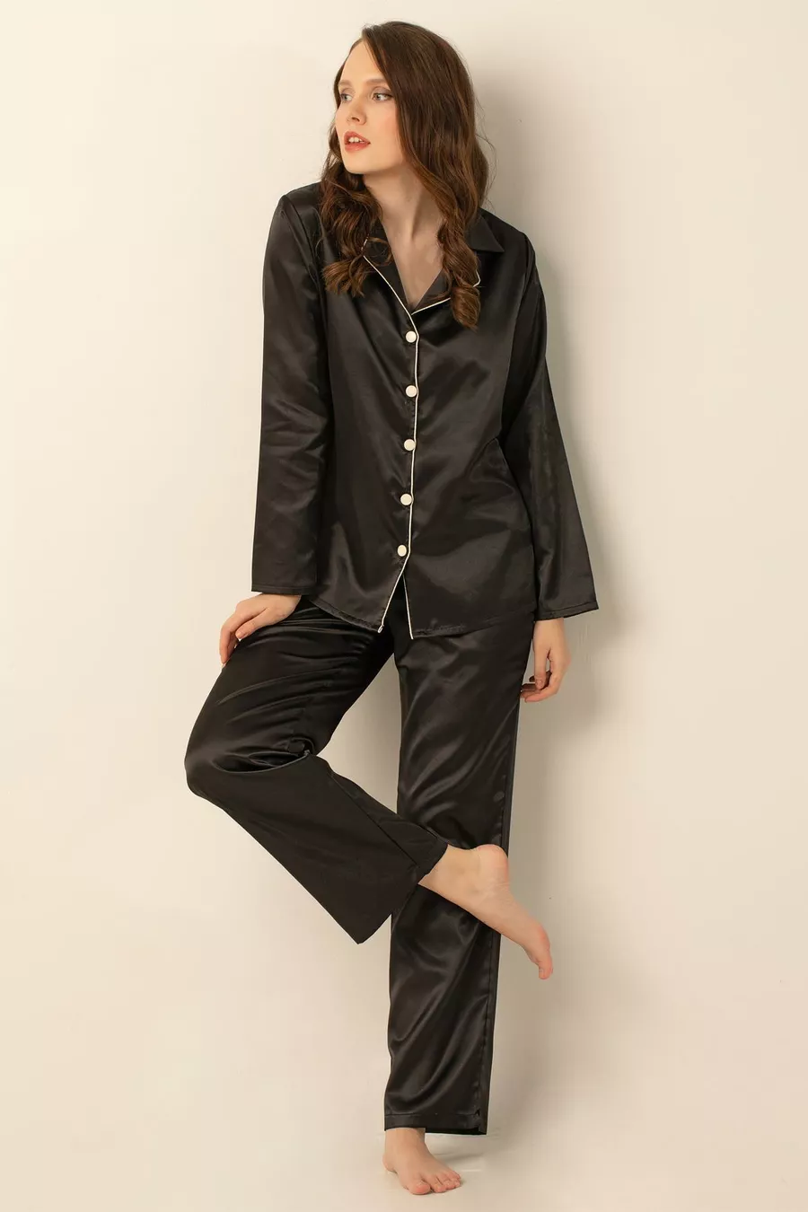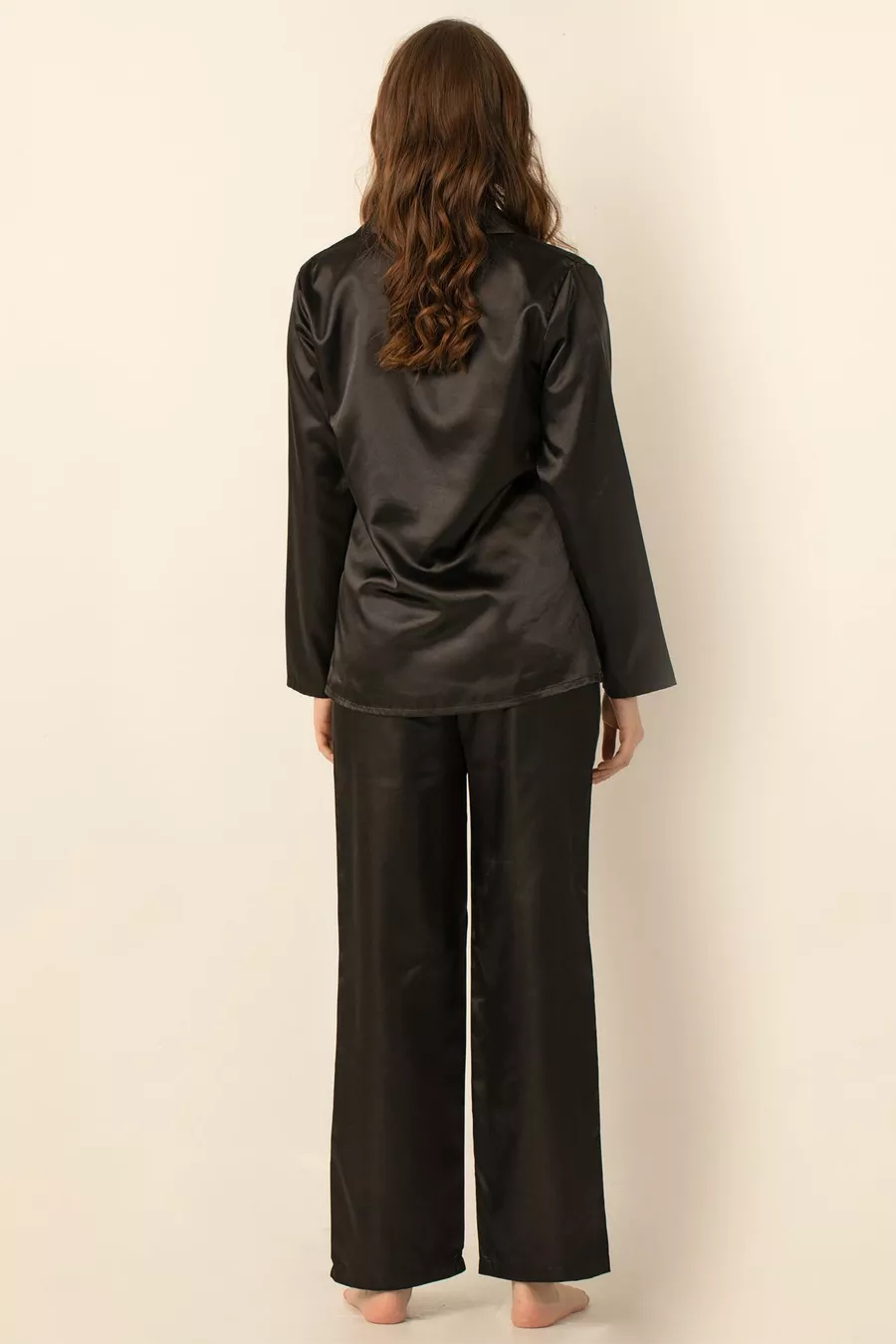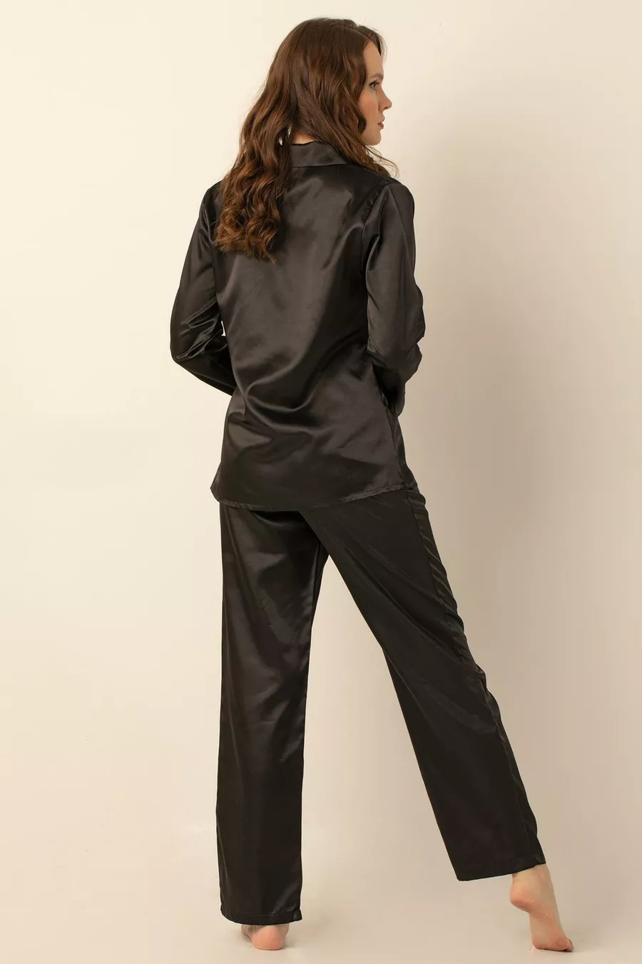 Sustainability Detail: No Sleeve Type: Standard Sleeve Pattern: Plain Neck Type: Shirt Collar Pant Length: Long Color: Black Material: Satin Product Type: Plain Product Detail: Elasticated Collection: Homewear Set: Sweatshirt-Leggings Sleeve Length: Long Technical: None Fit: Relaxed Fabric Type: Woven Waist: Regular Waist Weave Type: Satin Number of Pieces: 2 Pieces Silhouette: Regular Persona: Cool & Comfort Occasion: Homewear Additional Feature: No Additional Feature Material Composition: 100% Satin Washing Instructions: Wash on a delicate cycle. Can be washed at a maximum of 30 degrees. We recommend not using fabric softener. Pant Type: Short Pant Package Contents: Single Length: Long Season: All Seasons Origin: TR Closure Type: Mono Closure