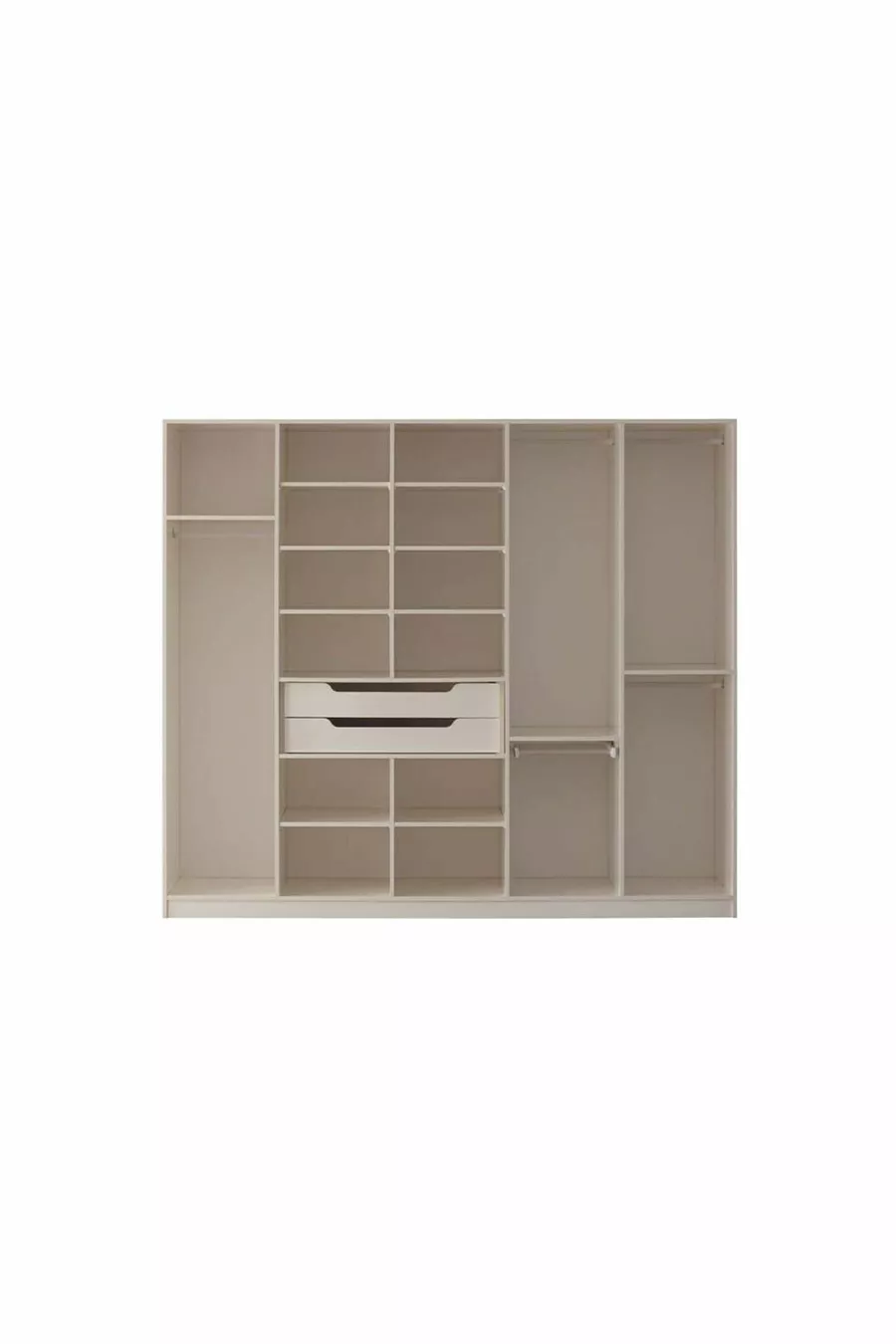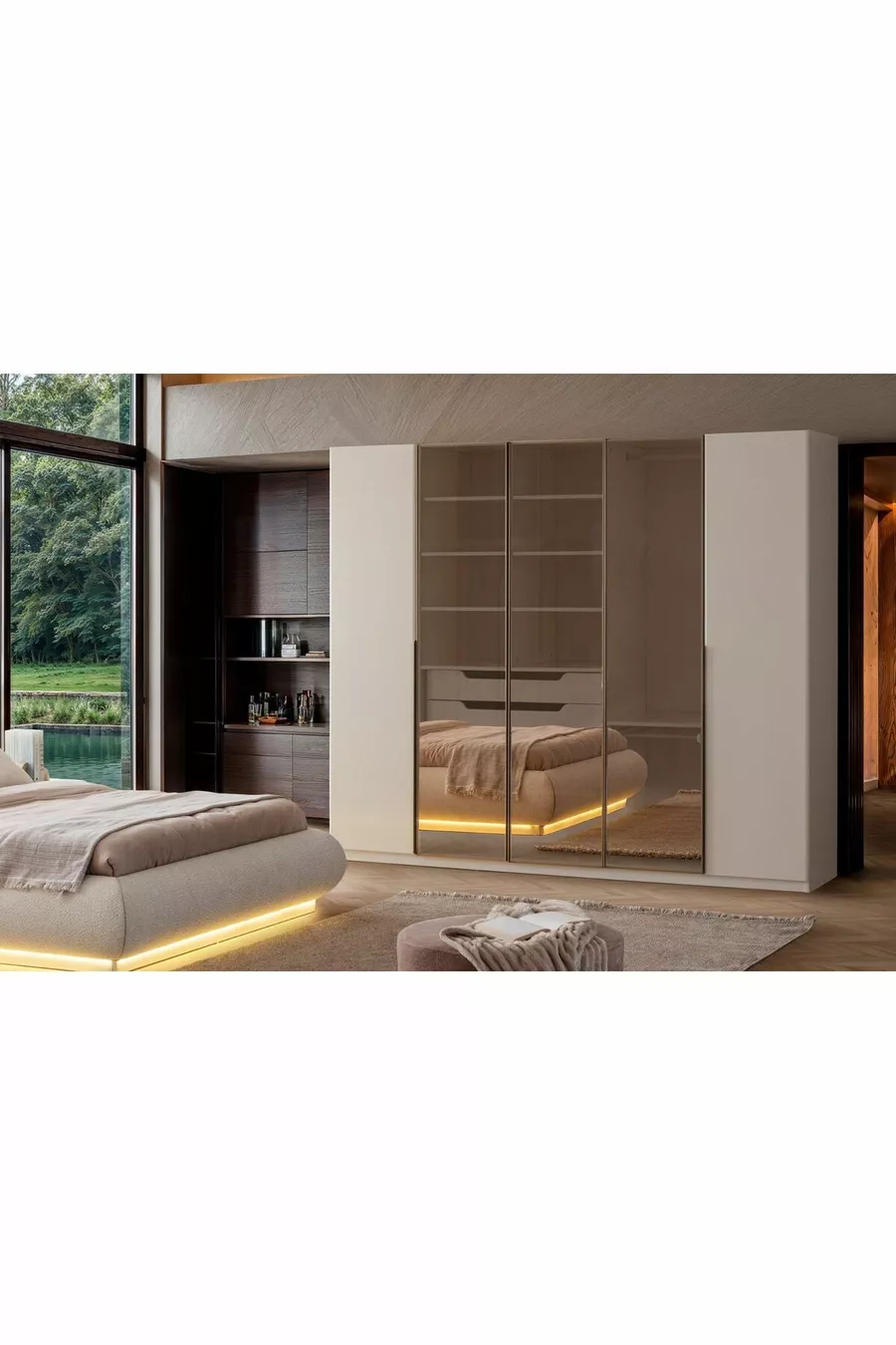 Color: Beige Warranty Period: 2 Years Bed/Base Size: 160 x 200 Bed Function: With Base Wardrobe Function: With Doors Wardrobe Body Material: Chipboard Number of Doors: 5 Set Contents: Bed with Base + 2 Nightstands + Dresser + Wardrobe Style: Modern Theme / Style: Modern Origin: Turkey Feature: With Legs