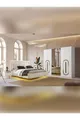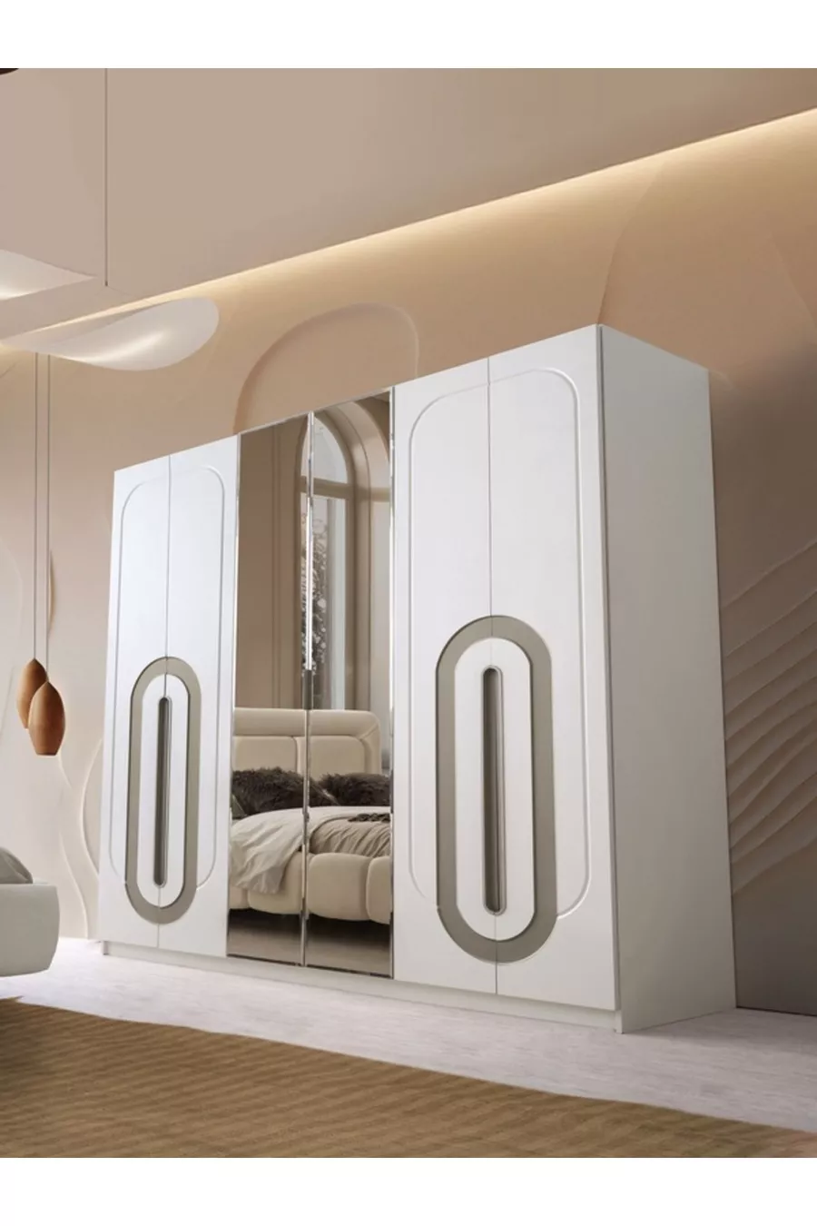Color: White Warranty Period: 2 Years Bed/Base Size: 160 x 202 Bed Function: Without Base Wardrobe Function: With Doors Wardrobe Body Material: MDF Number of Doors: 6 Set Contents: Wardrobe + 2 Nightstands + Dresser + Bed Headboard Style: Scandinavian Theme / Style: Scandinavian Origin: TR Feature: Water Resistant