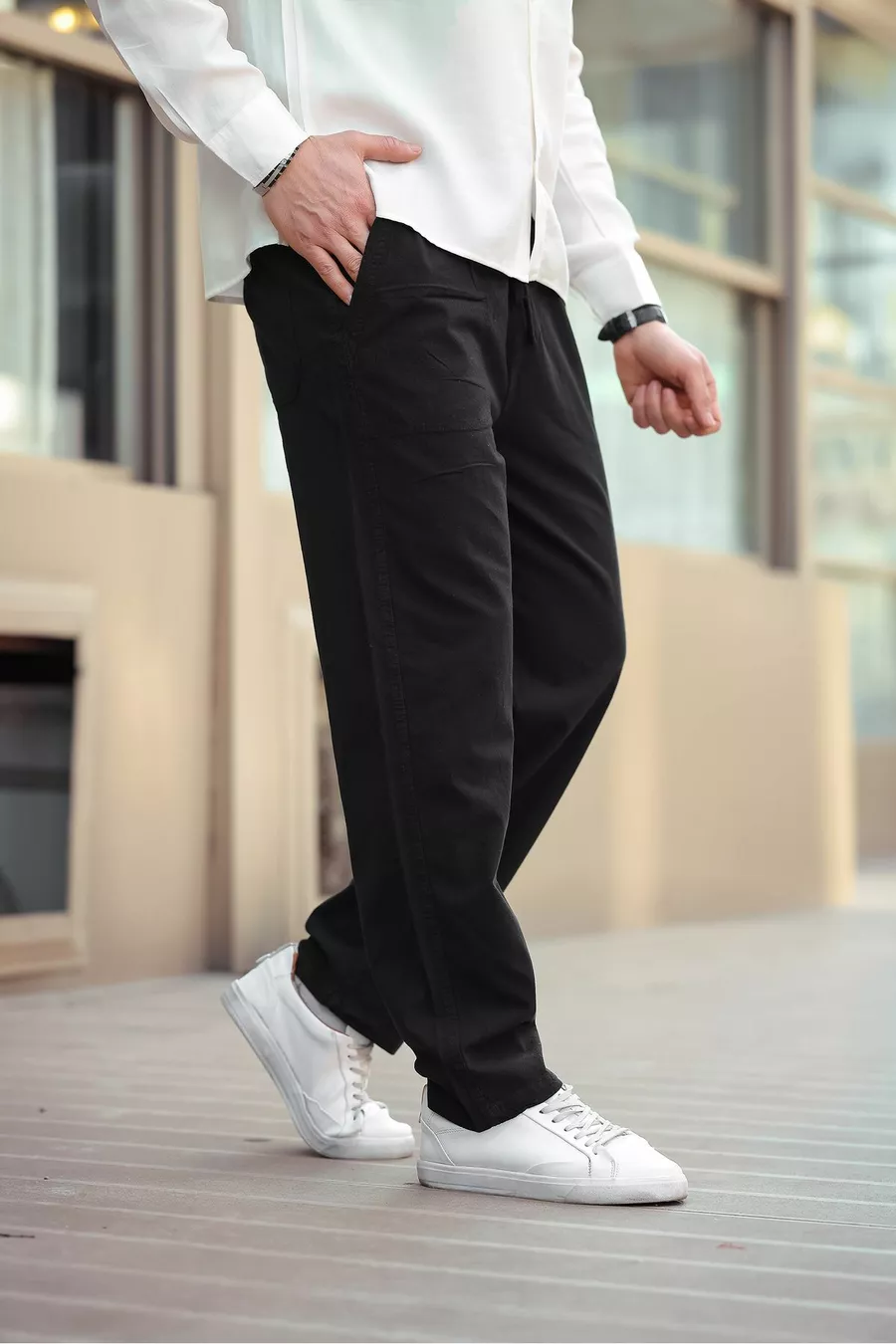 Material: Linen Blend Fabric Type: Linen Leg Type: Wide Leg Waist: Regular Waist Pattern: Plain Color: Black Pocket: Double Pocket Product Detail: Elastic Waist Collection: Linen Thickness: Medium Lining: Unlined Length: Regular Silhouette: Asymmetrical Occasion: Casual/Daily Fit: Loose Additional Feature: Elastic Waist Weave Type: Linen Blend Persona: Young Print/Embroidery Technique: Plain Belt/Sash: No Belt Sustainability Detail: Organic Material Composition: NaN% undefined Washing Instructions: 30 Degrees Gentle Wash Season: Summer Origin: TR Box Status: No Box Closure Type: Single Closure Package Content: Single