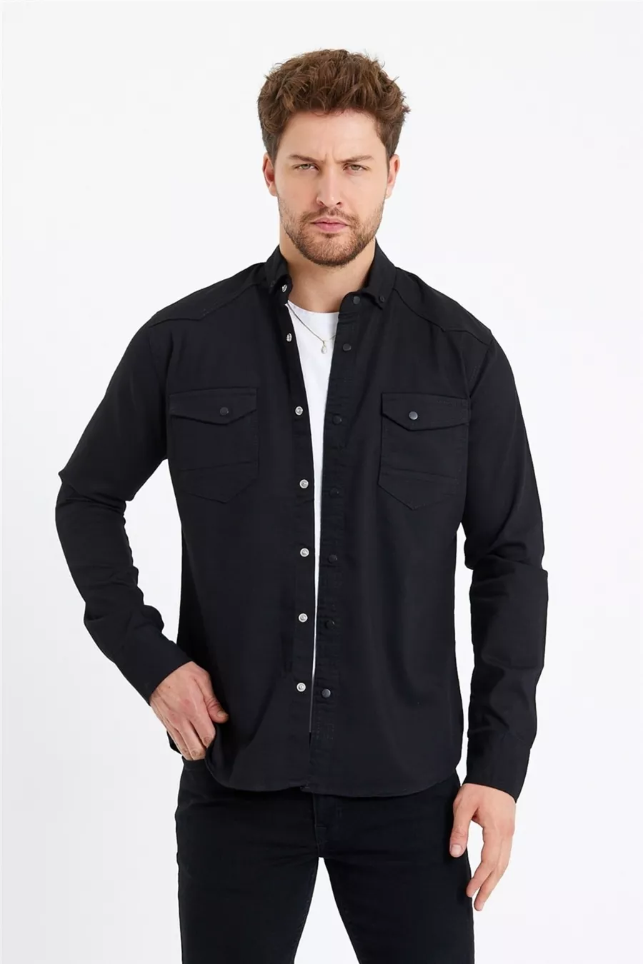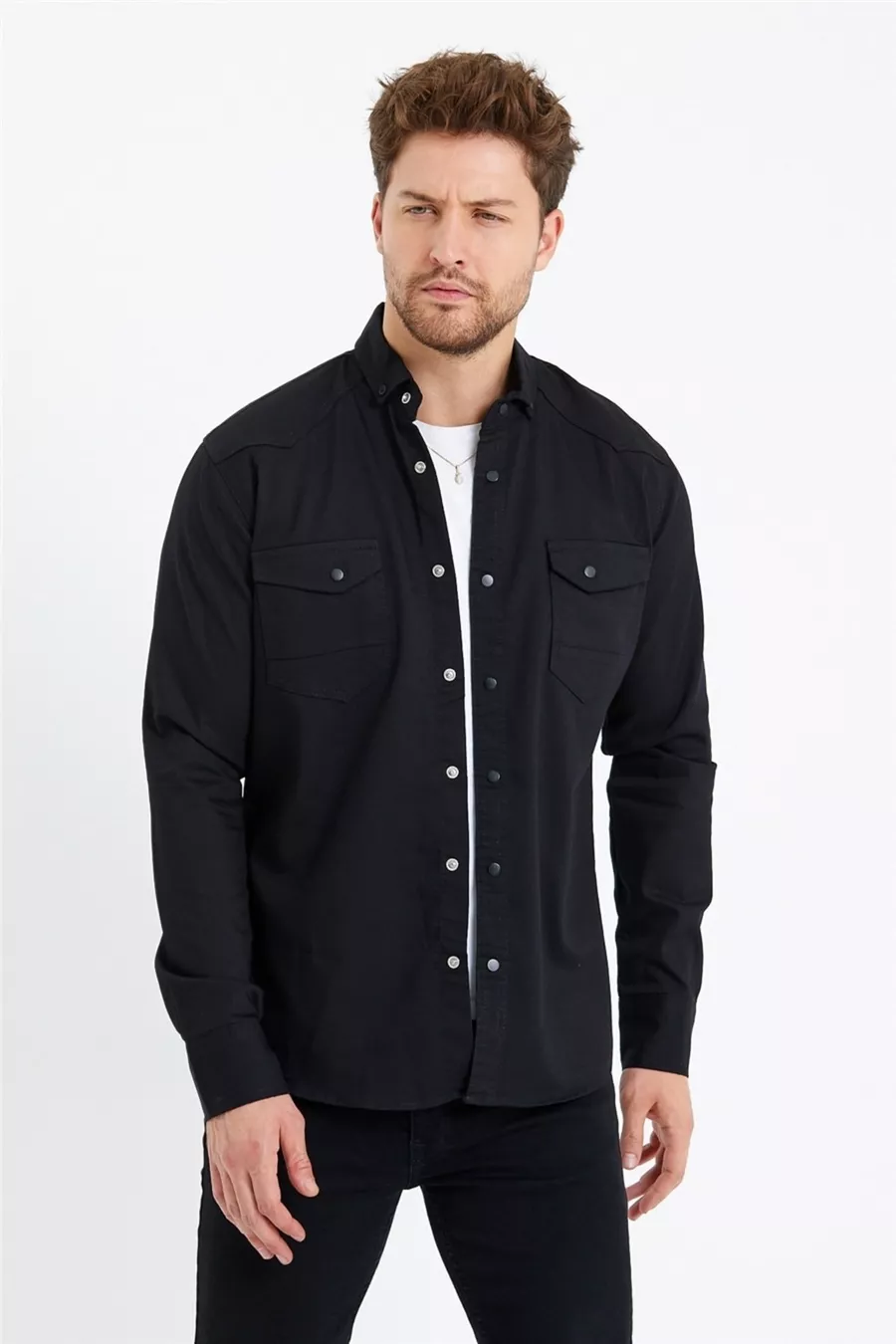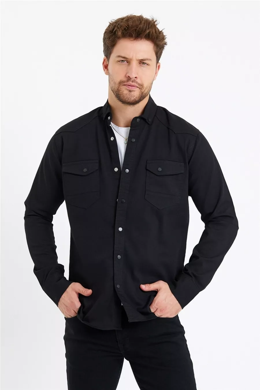 Pattern: Plain Fit: Slim Fit Collar Type: Shirt Collar Fabric Type: Denim Sleeve Type: Long Sleeve Color: Black Material: Cotton Closure Type: Snap Button Product Detail: With Pocket Detail Pocket: Double Pocket Sleeve Length: Long Length: Regular Occasion: Casual Silhouette: Slim Additional Feature: Stretchy Weave Type: Fleece Sustainability Detail: No Belt/Strap Status: No Belt Material Composition: 97% Cotton, 3% Lycra Washing Instruction: type 1 Box Status: No Box