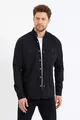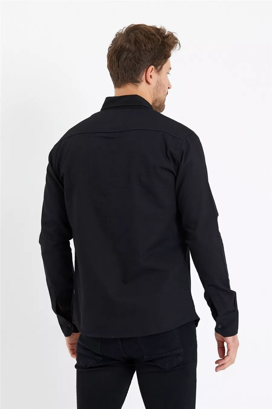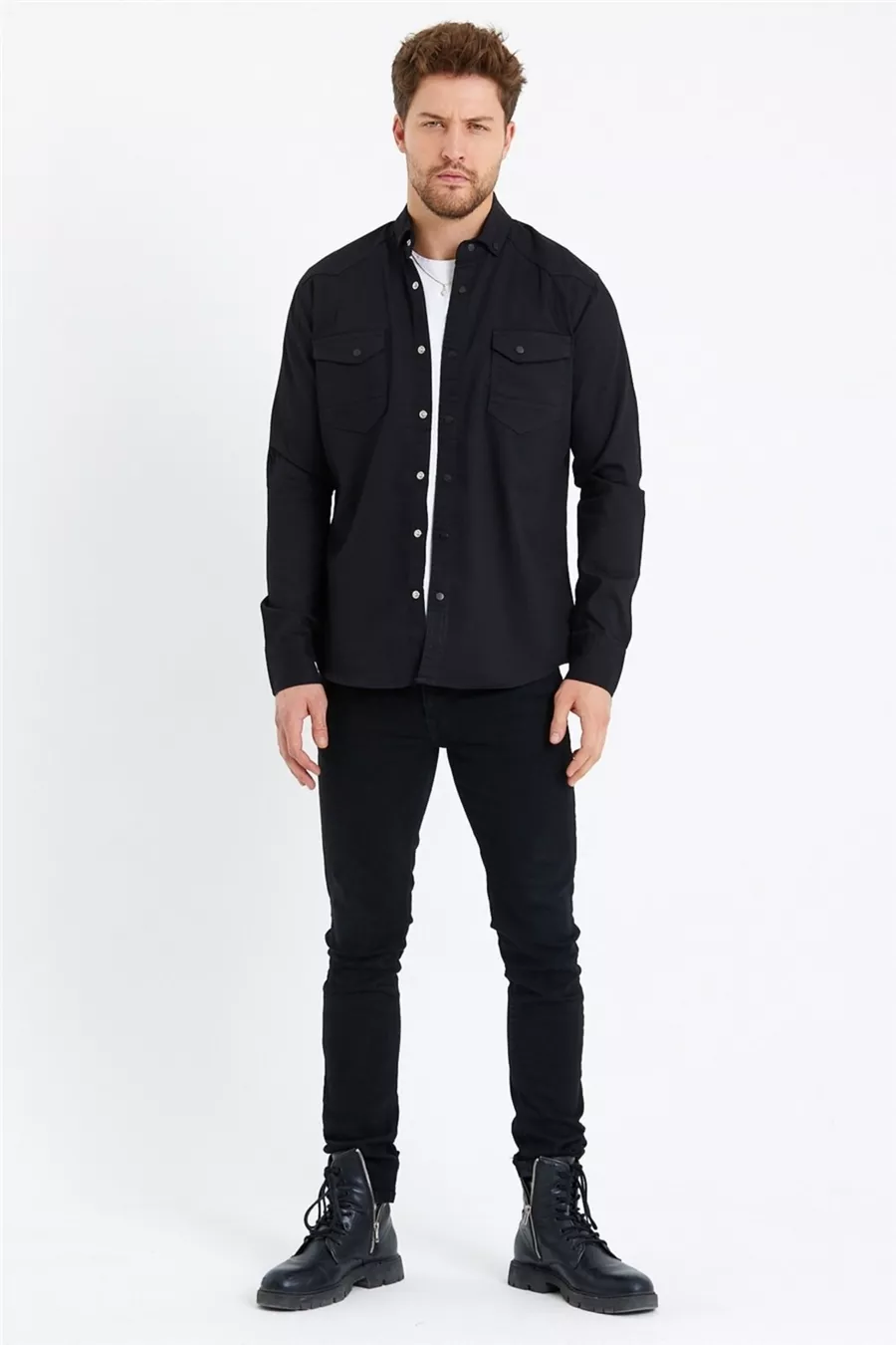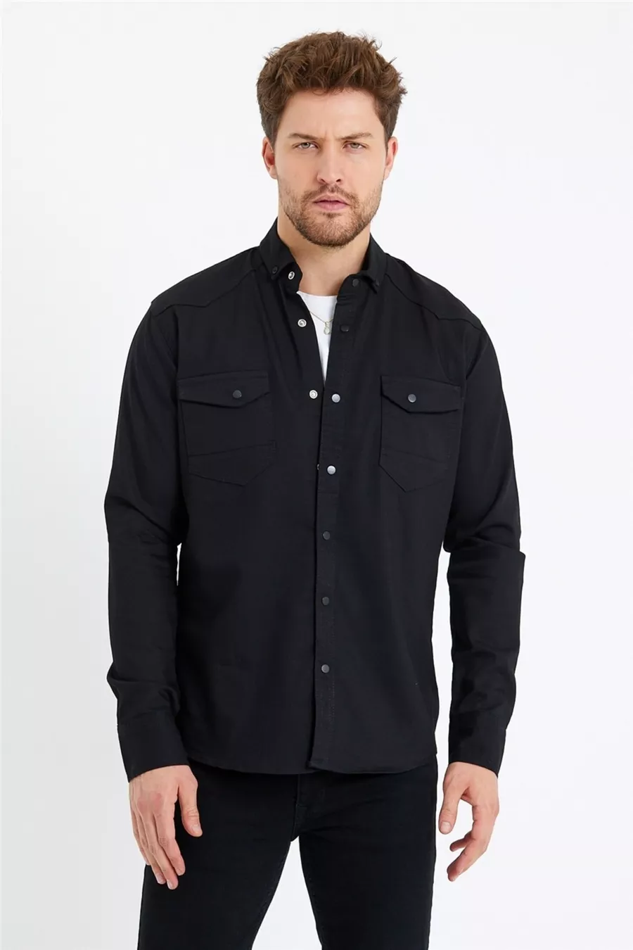 Pattern: Plain Fit: Slim Fit Collar Type: Shirt Collar Fabric Type: Denim Sleeve Type: Long Sleeve Color: Black Material: Cotton Closure Type: Snap Button Product Detail: With Pocket Detail Pocket: Double Pocket Sleeve Length: Long Length: Regular Occasion: Casual Silhouette: Slim Additional Feature: Stretchy Weave Type: Fleece Sustainability Detail: No Belt/Strap Status: No Belt Material Composition: 97% Cotton, 3% Lycra Washing Instruction: type 1 Box Status: No Box