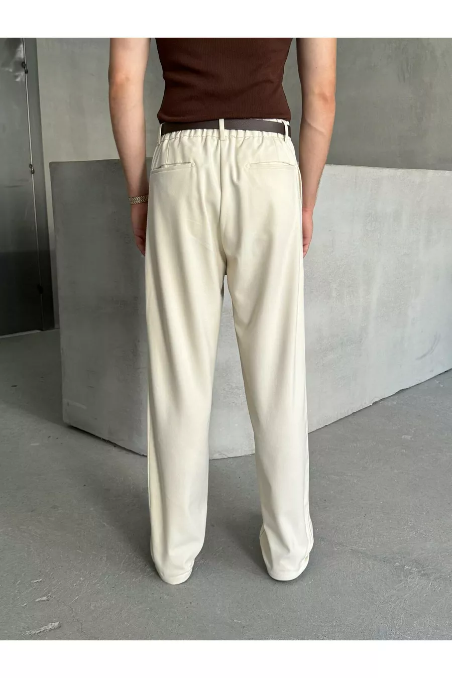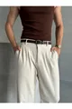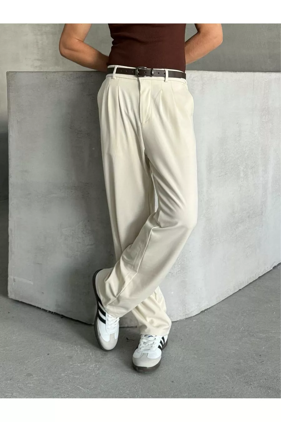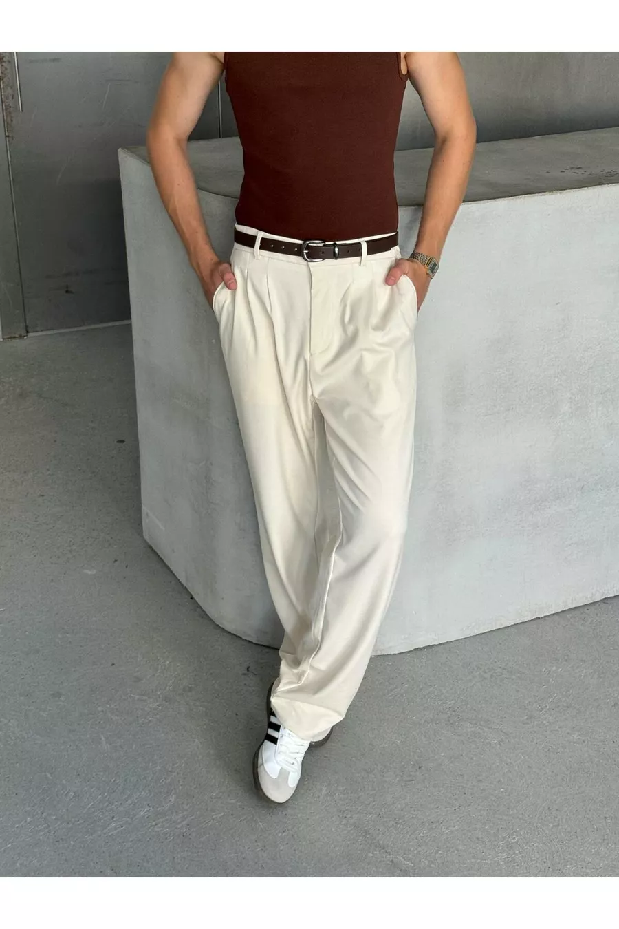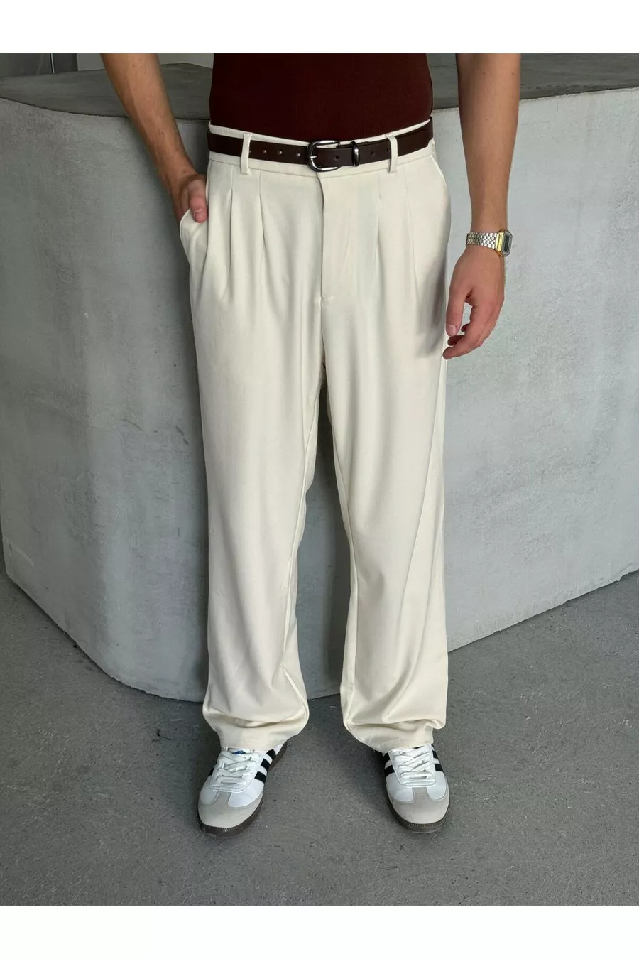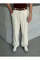 Material: Cotton Polyester Fabric Type: Not specified Leg Type: Wide Leg Waist: Regular Waist Pattern: Solid Color: Ecru Pocket: Double Pocket Product Detail: Pleated Collection: Basic Thickness: Medium Lining: Unlined Length: Regular Silhouette: Loose Occasion: Casual/Daily Fit: Baggy Fit Additional Feature: Adjustable Waist Weave Type: Slub Cotton Persona: Cool & Comfort Print/Embroidery Technique: No Print Belt/Strap: With Belt Sustainability Detail: No Material Composition: 63% Polyester, 34% Viscose, 3% Lycra Washing Instructions: Wash at 30°C. Season: All Seasons Origin: TR Box Status: No box Closure Type: Mono Closure Package Contents: Single