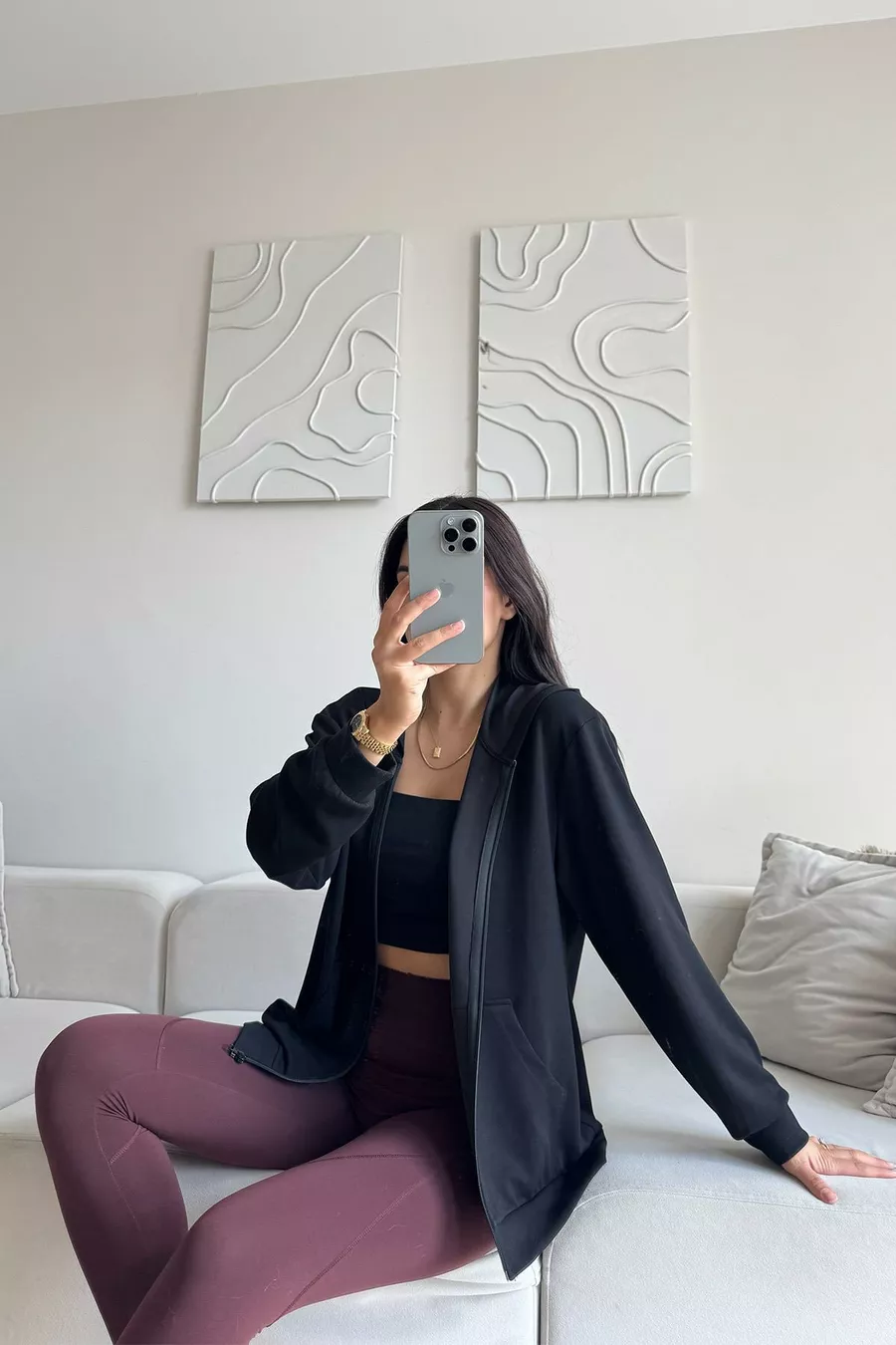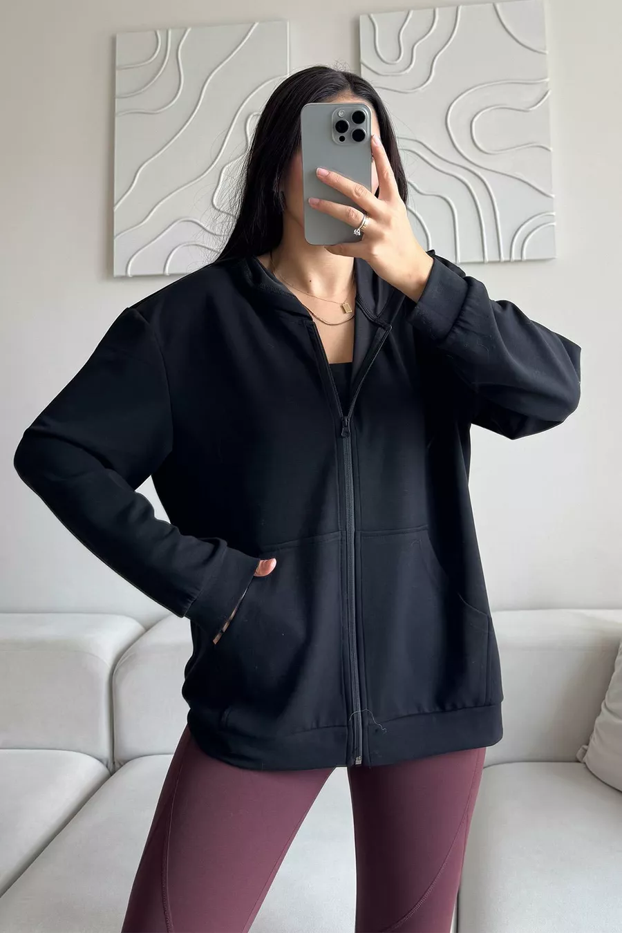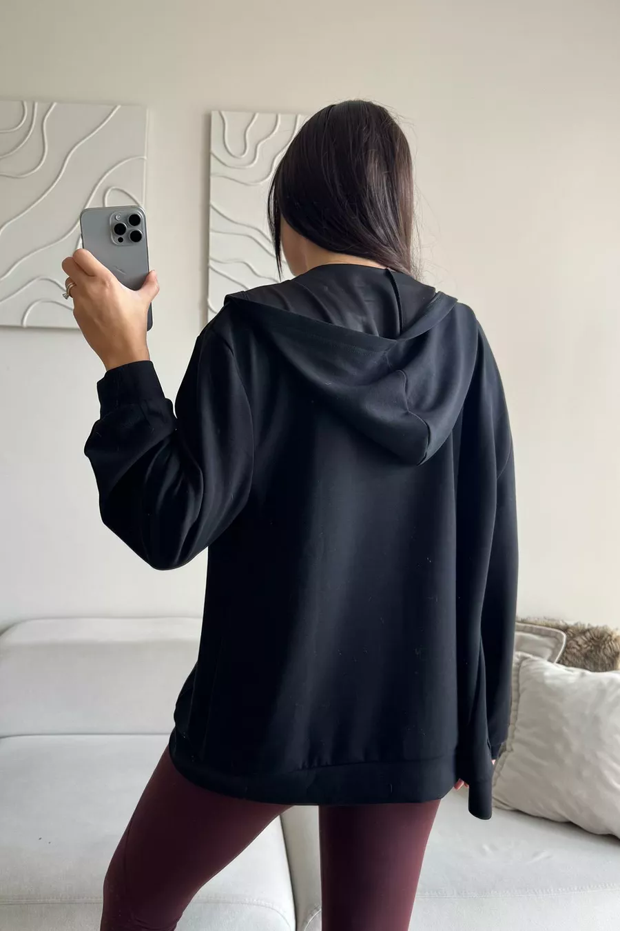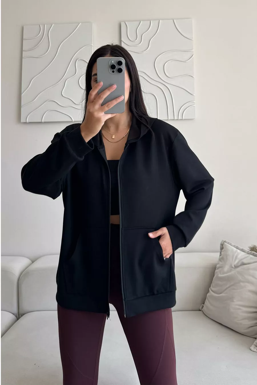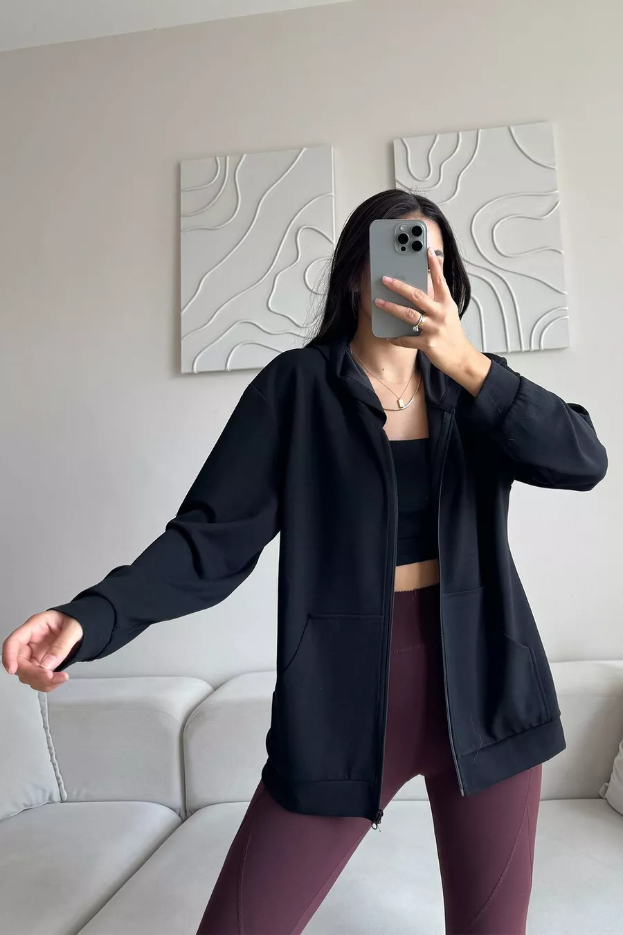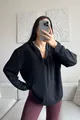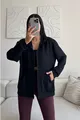 Modal Fabric Relax Fit Long Sleeve Hooded Zip-Up Black Women's Sweatshirt and T-Shirt Set