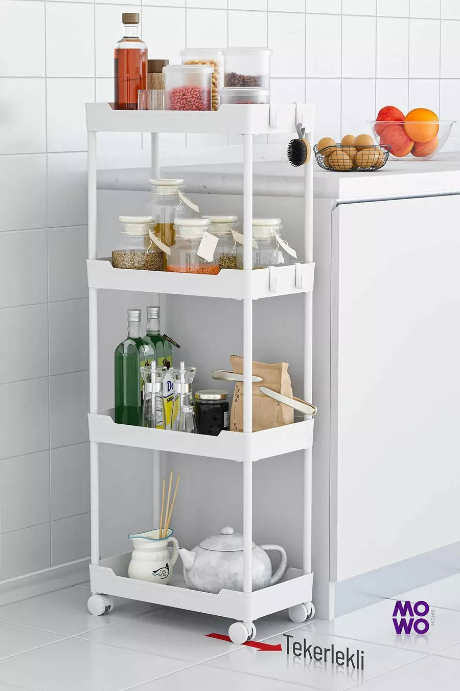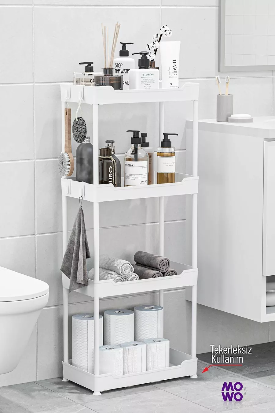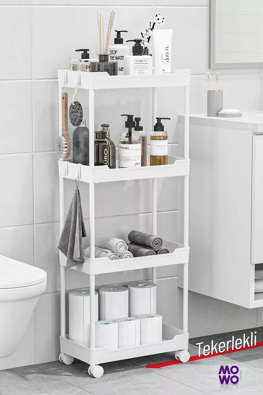 Mowo 4-Tier White Wheeled Bathroom Shelf, Kitchen Rack, Towel Holder, Detergent and Makeup Organizer Vesken