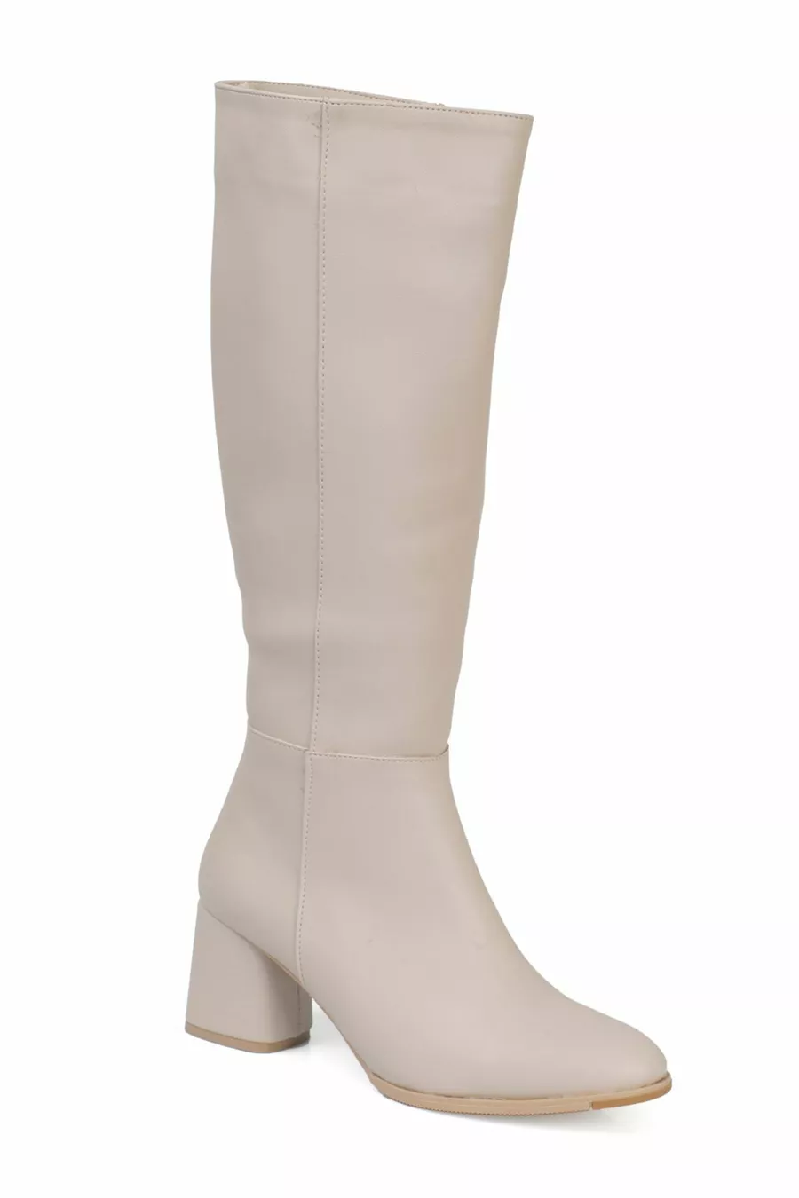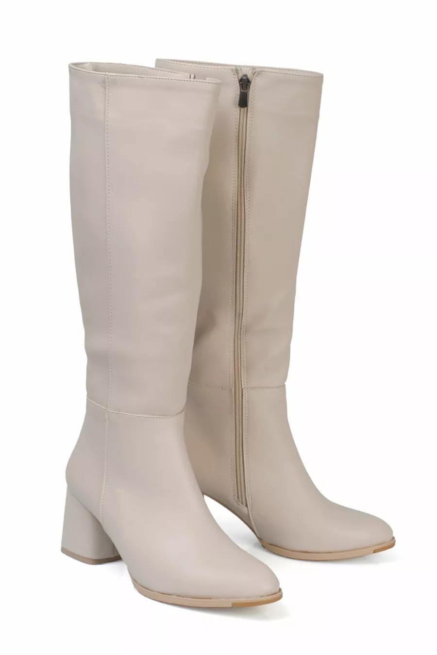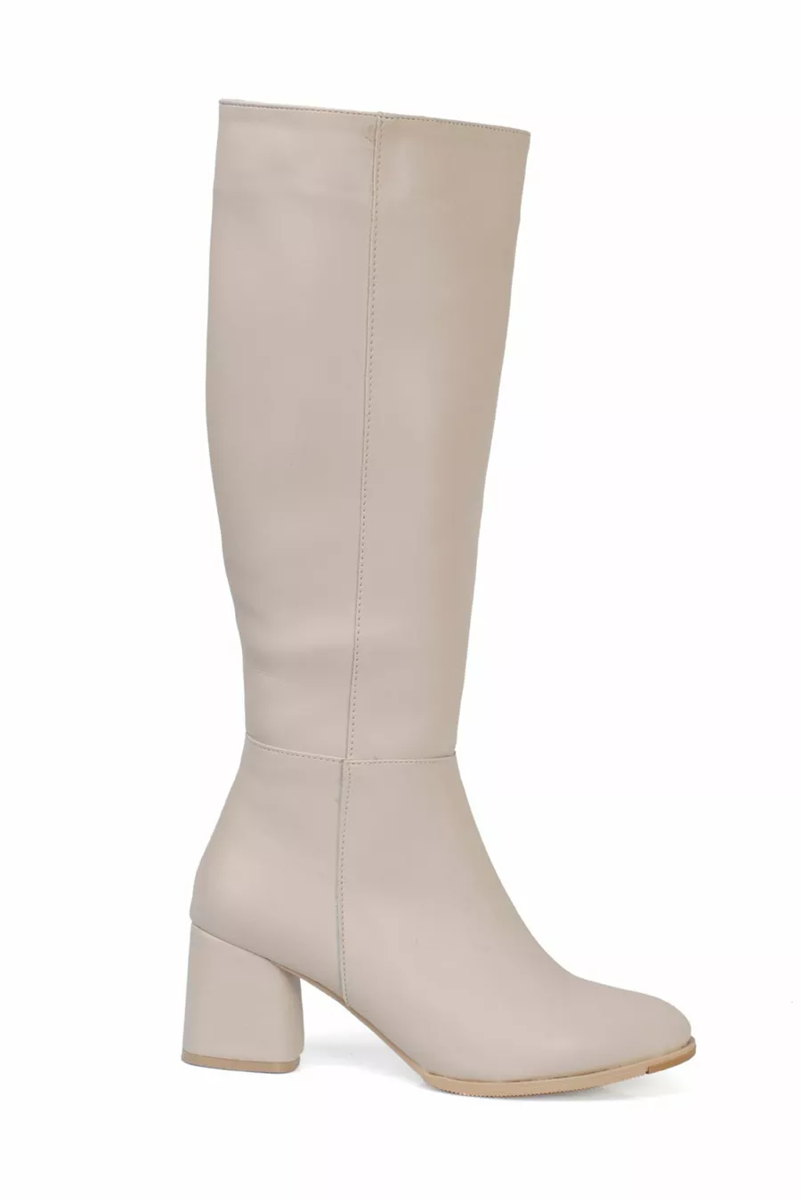 Oval Toe Side Zipper Ecru Beige Heeled Women's Boots