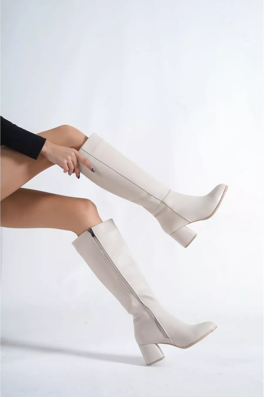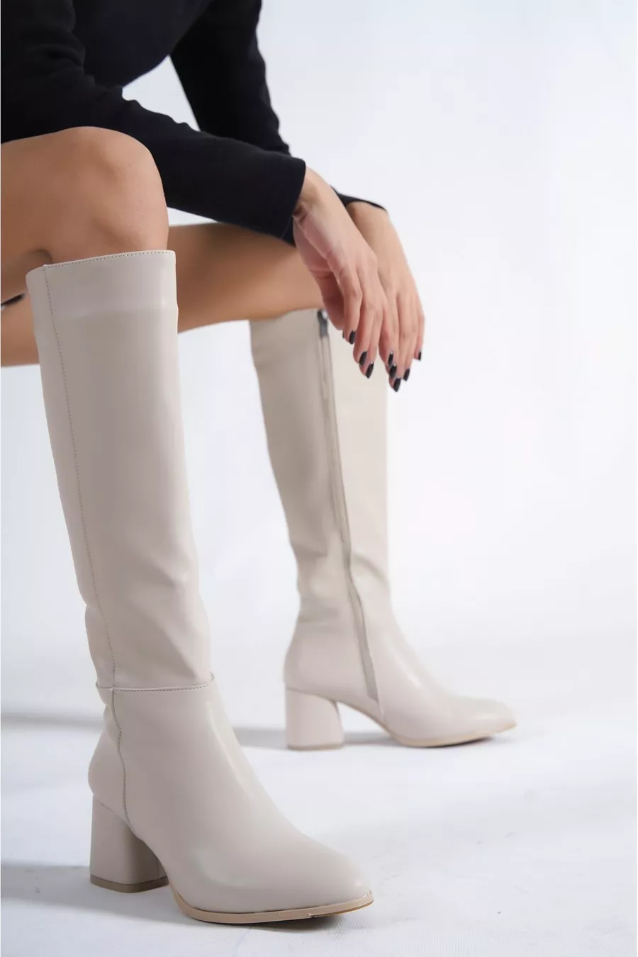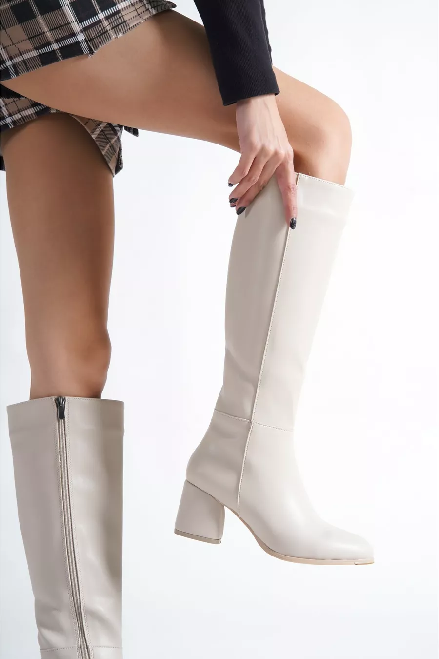 Oval Toe Side Zipper Ecru Beige Heeled Women's Boots