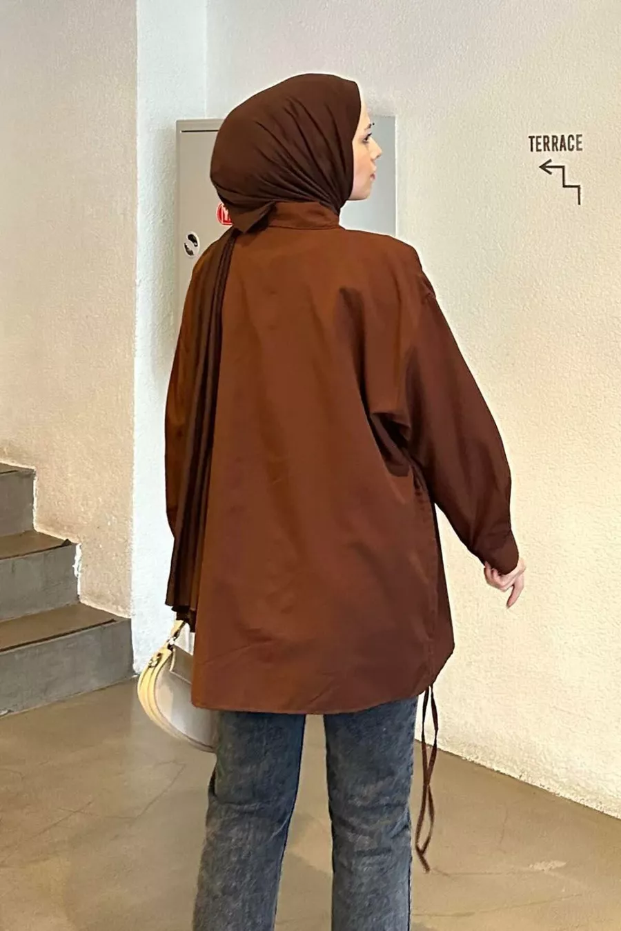 Collar Type: Shirt Collar Collection: Modest Wear Fabric Type: Woven Sleeve Type: Standard Sleeve Pocket: No Pocket Pattern: Plain Fit: Oversize Color: Brown Product Detail: Buttoned Sleeve Length: Long Material: Cotton Polyester Weave Type: Poplin Belt/Strap Status: Without Belt Occasion: Casual Persona: Fashion Forward Closure Type: Buttoned Length: Long Sustainability Detail: No Material Composition: Cotton Washing Instructions: T09 Silhouette: Oversize Origin: TR Box Status: No Box