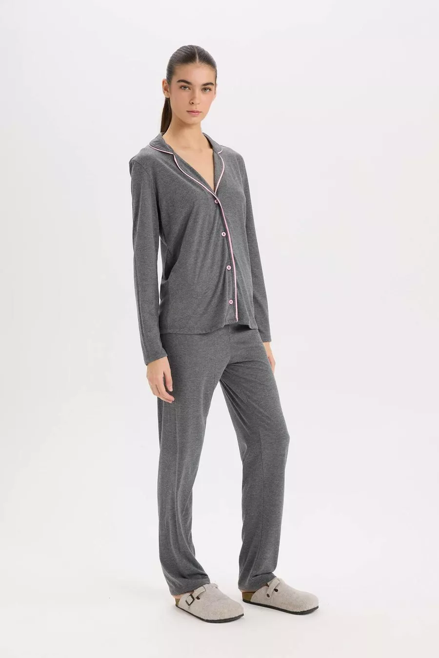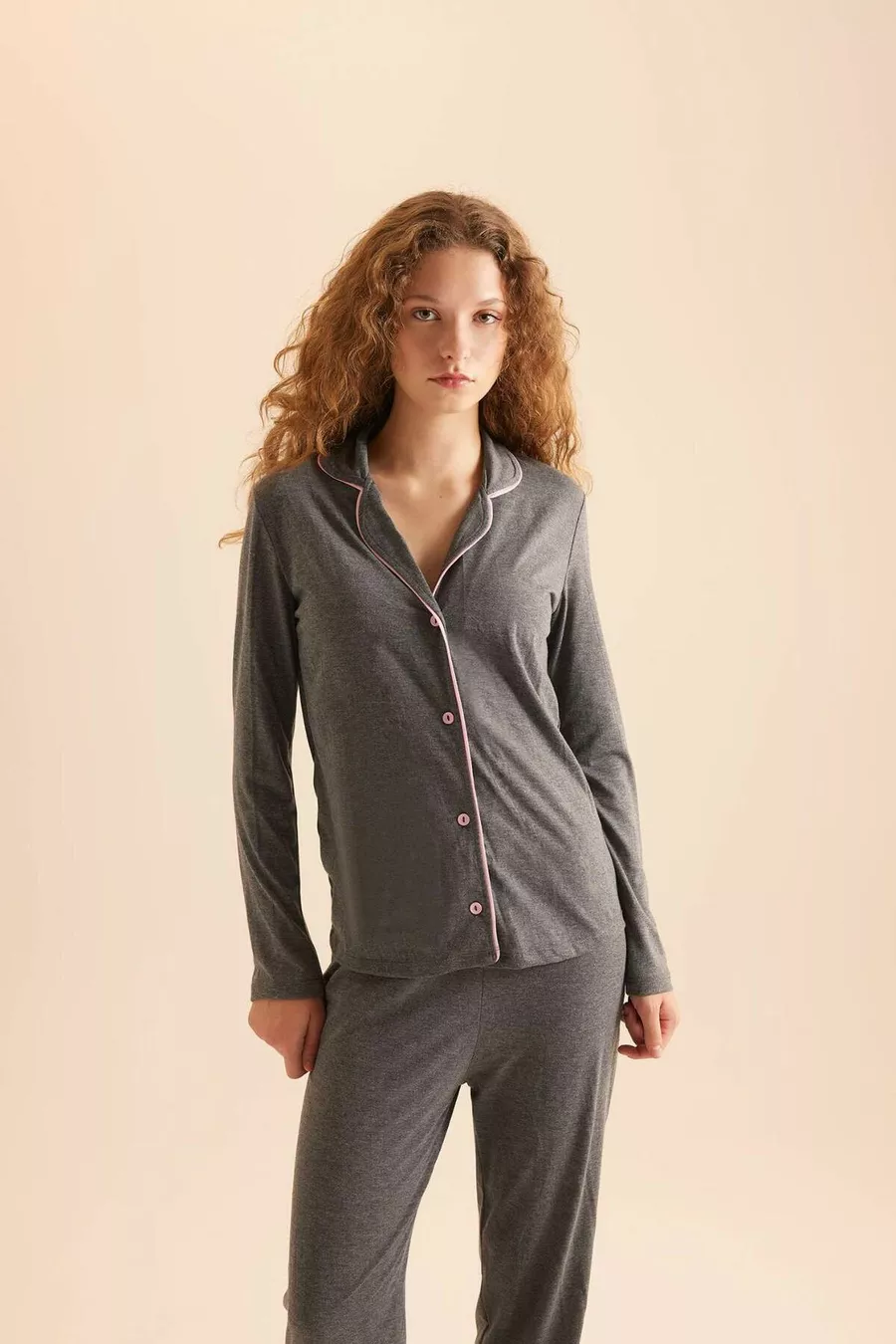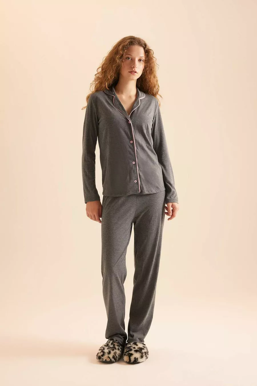 Sustainability Detail: No Sleeve Type: Standard Sleeve Pattern: Plain Collar Type: Shirt Collar Leg Length: Long Color: Grey Material: Polyester Blend Product Type: Plain Collection: Homewear Sleeve Length: Long Fit: Regular Fabric Type: Knitted Waist: Regular Waist Weave Type: Soft Number of Pieces: 2 Pieces Silhouette: Regular Setting: Lounge/Home Material Composition: 18% Cotton, 82% Polyester Washing Instructions: T09 Leg Type: Regular Package Contents: 2 Pieces Length: Full Length Origin: TR