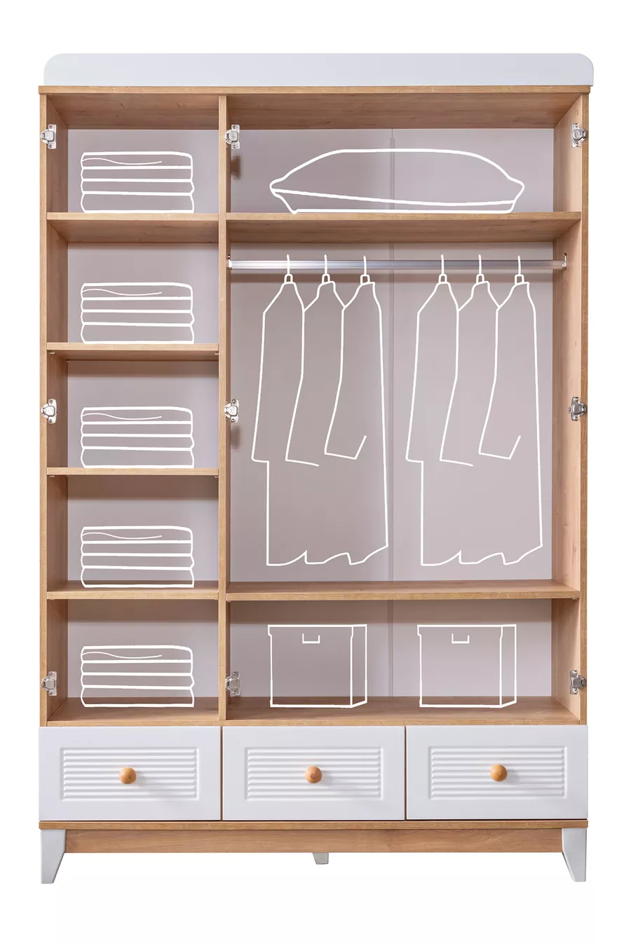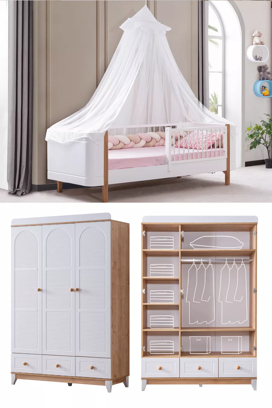 Perla Oak Children's Room, Walnut Perla 3-Door Wardrobe Lidya Bed