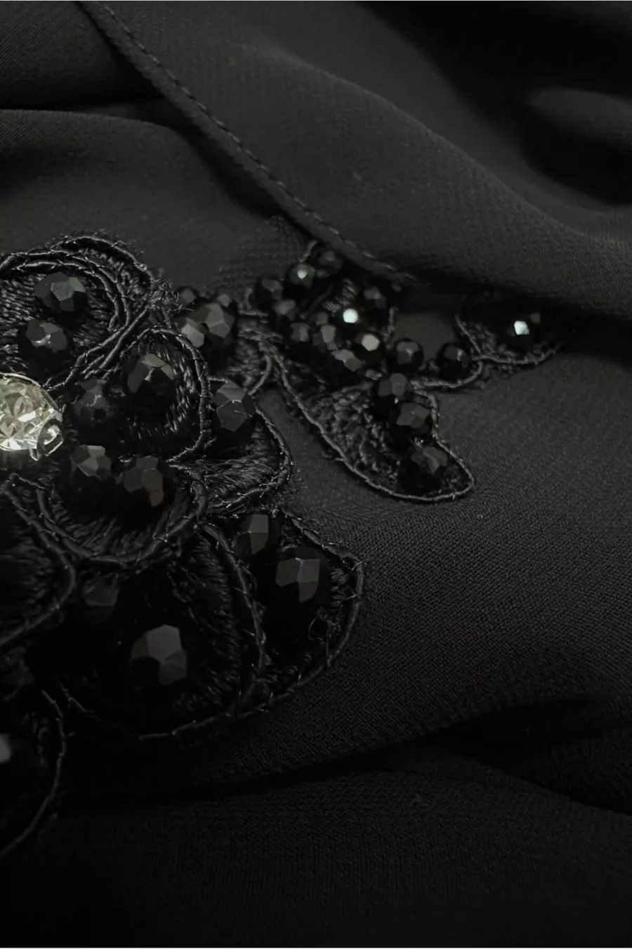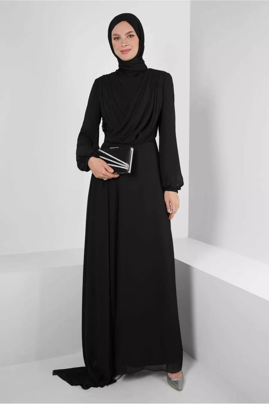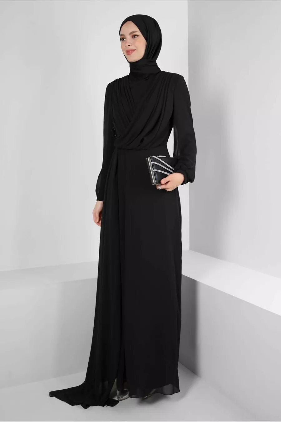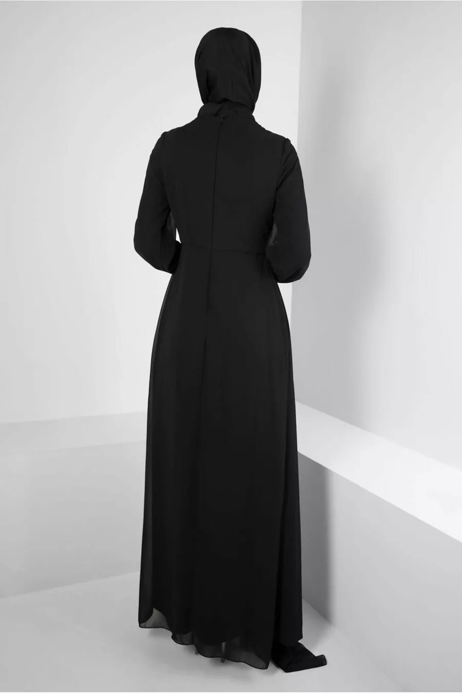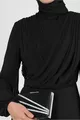 Collar Type:Crew Neck Material:Polyester Mold:Regular Fabric Type:Woven Color:Black Pattern:Plain Ambient:Chic/night Weaving Type:Chiffon Height:Long Additional Feature:No additional features available Persona:Fashion Forward Silhouette:Asymmetrical Sleeve Length:Long Collection:Hijab Clothing Package Includes: Single Product Details:Pearl/Stone Liner Condition:Lined