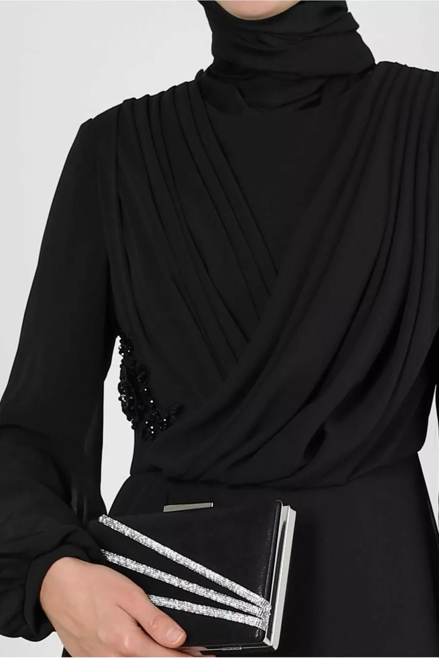PLEATED CHIFFON EVENING DRESS WITH EMBROIDERY AND STONE DETAILS
