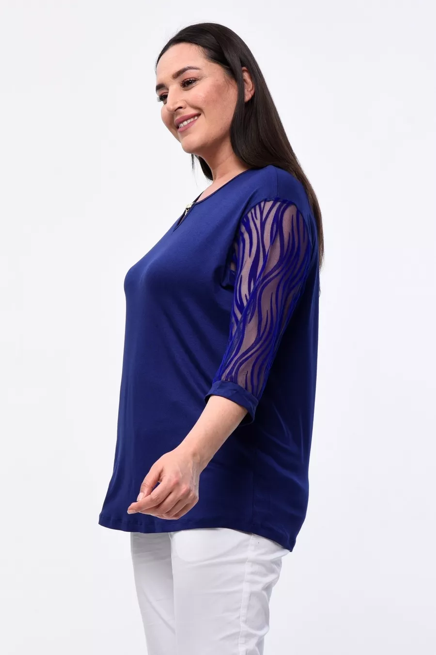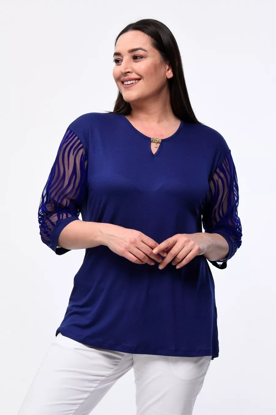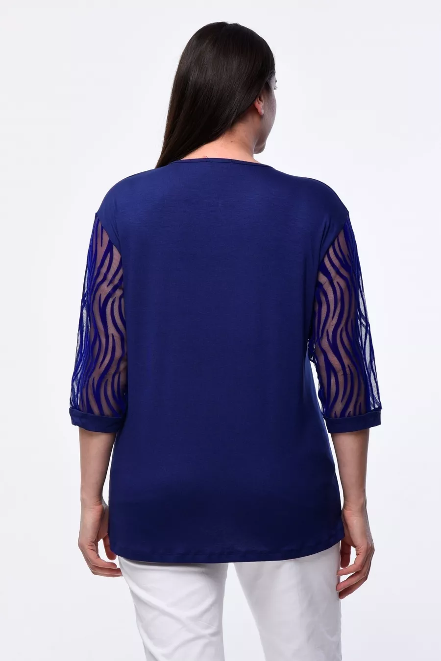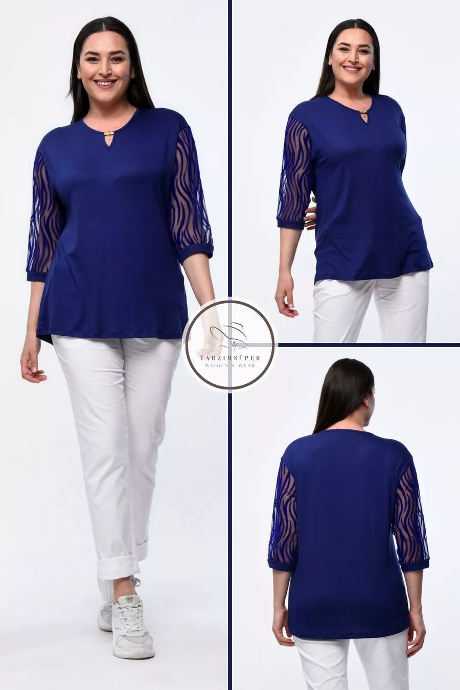 Plus Size New Season Short Sleeve Evening Dress Model with Lace Sleeves, All-Season Tulle Detailed Elegant Mother's Blouse