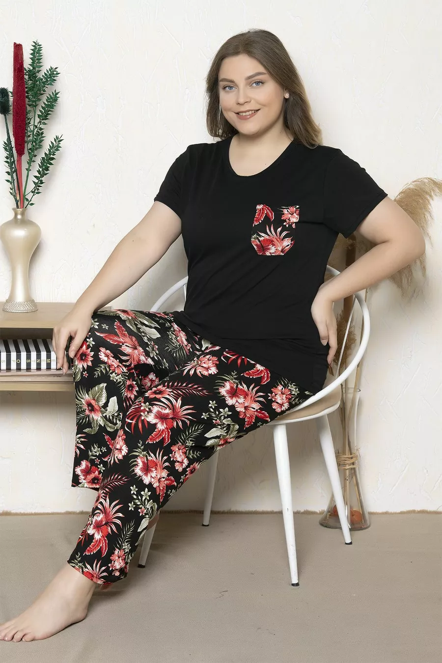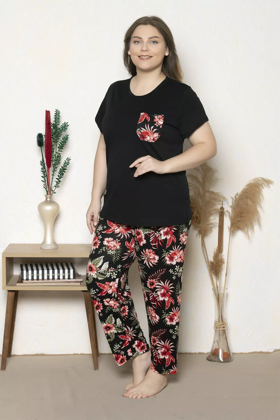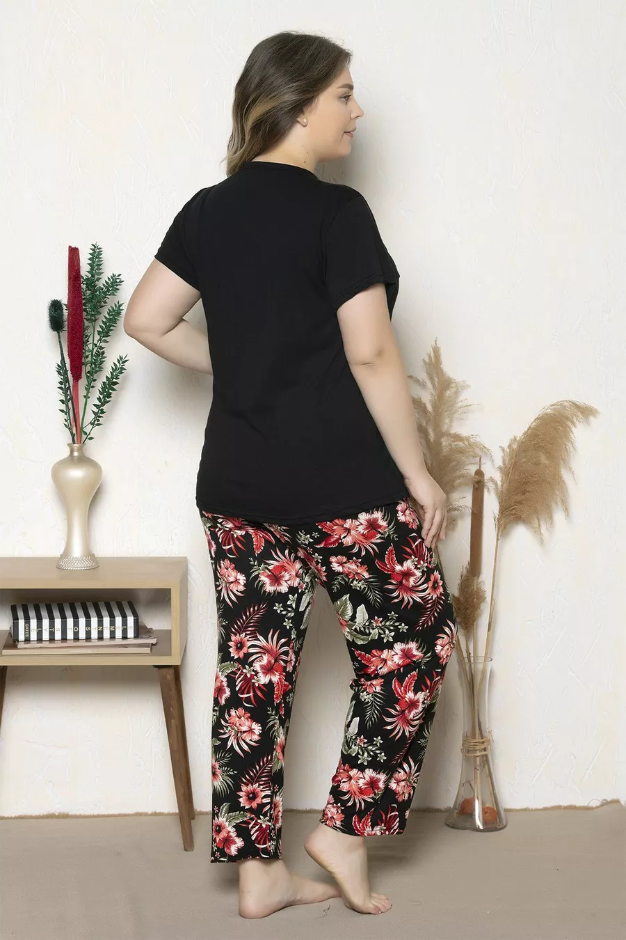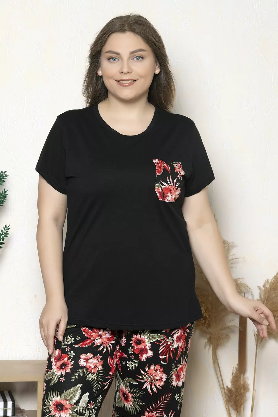 Plus Size Black Floral Pattern Short Sleeve Oversized Pajama Set