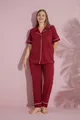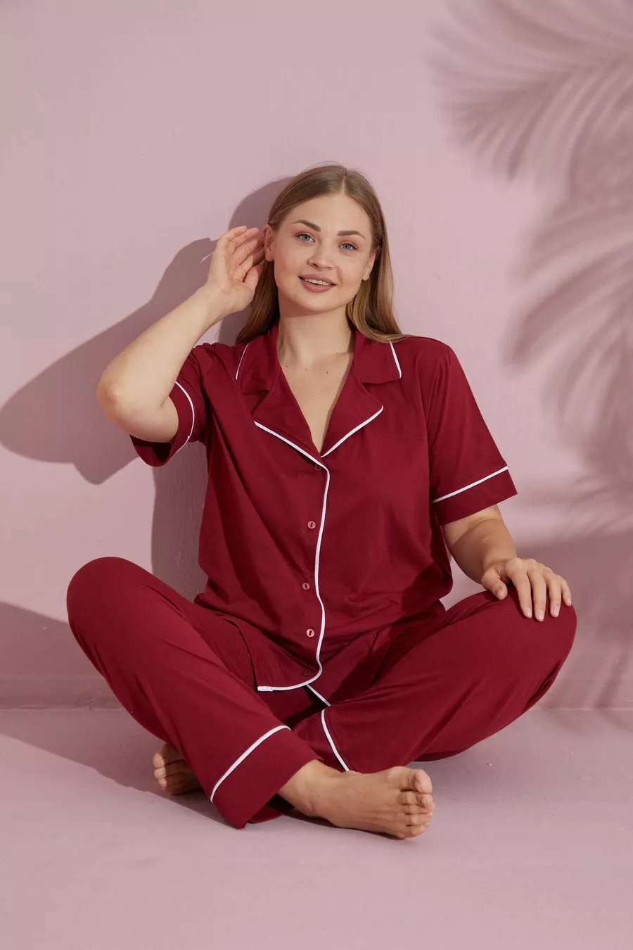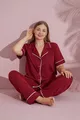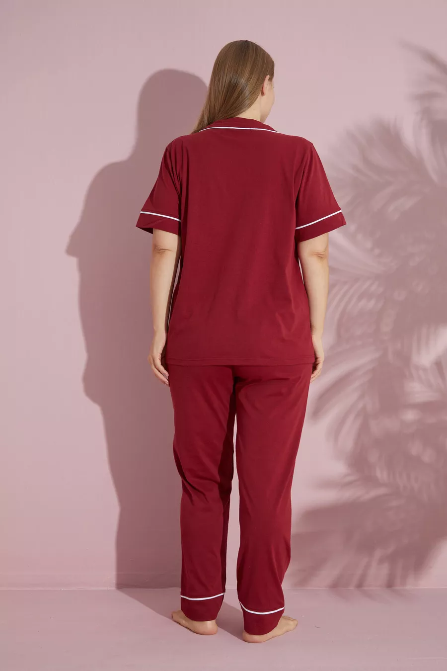 Plus Size Women's Burgundy Short Sleeve Cotton Button-Front Piped Pajama Set