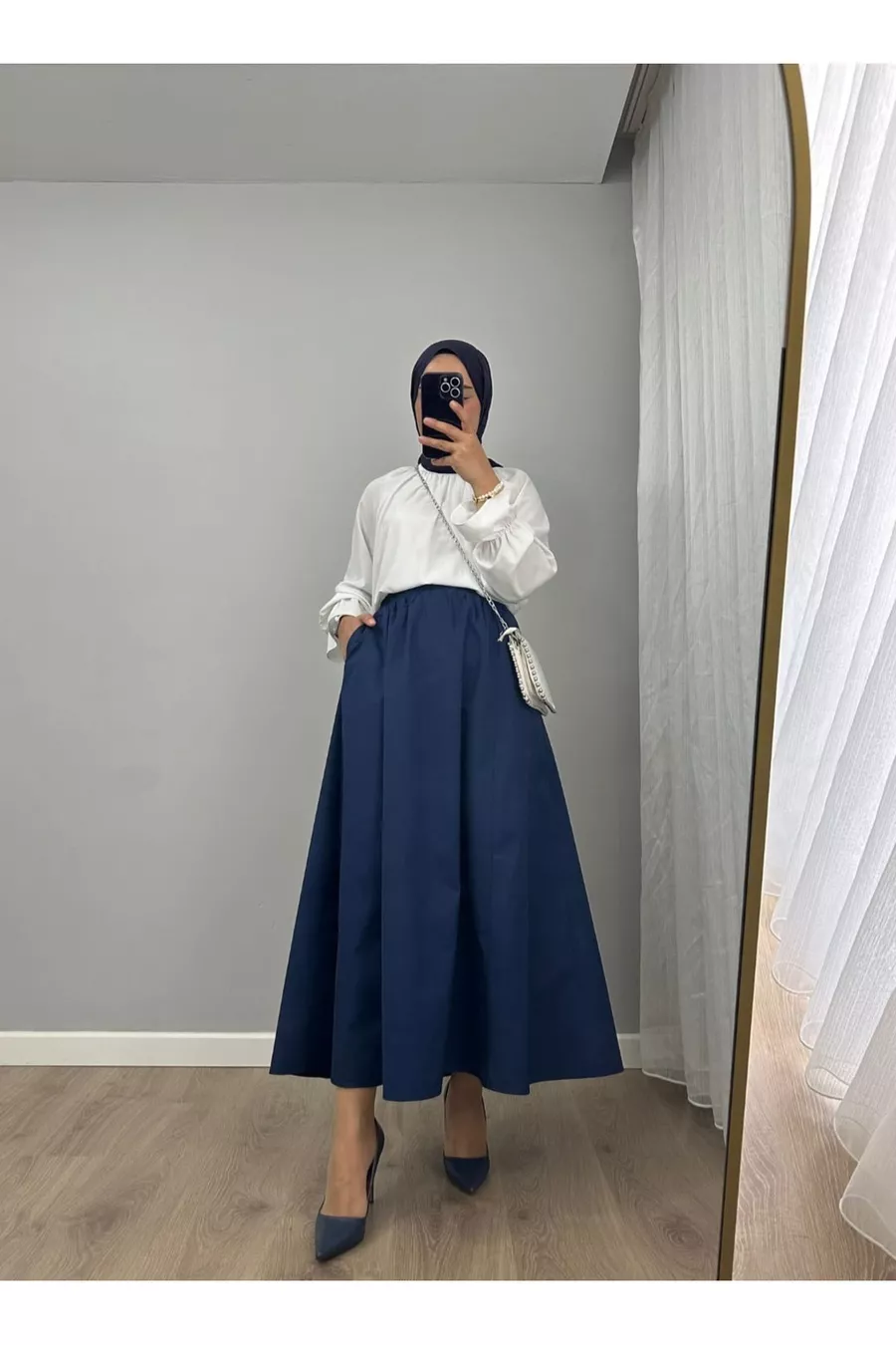 Silhouette: Flared Fit: Elastic Waist Thickness: Thin Pattern: Plain Fabric Type: Woven Material: Fabric Color: Navy Blue Product Detail: Elastic Collection: Modest Wear Waist: High Waist Pocket: Hidden Additional Feature: Elastic Waist Weave Type: Poplin Length: Long Belt/Strap: No Belt Closure Type: Elastic Sustainability Detail: Yes Lining: Unlined Persona: Young Occasion: Casual Material Composition: 100% Polyester Washing Instructions: T44 Season: Summer Origin: TR Box Condition: No Box Package Contents: Single
