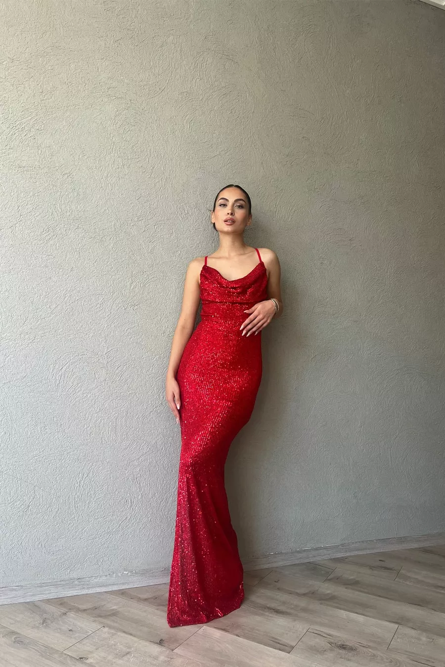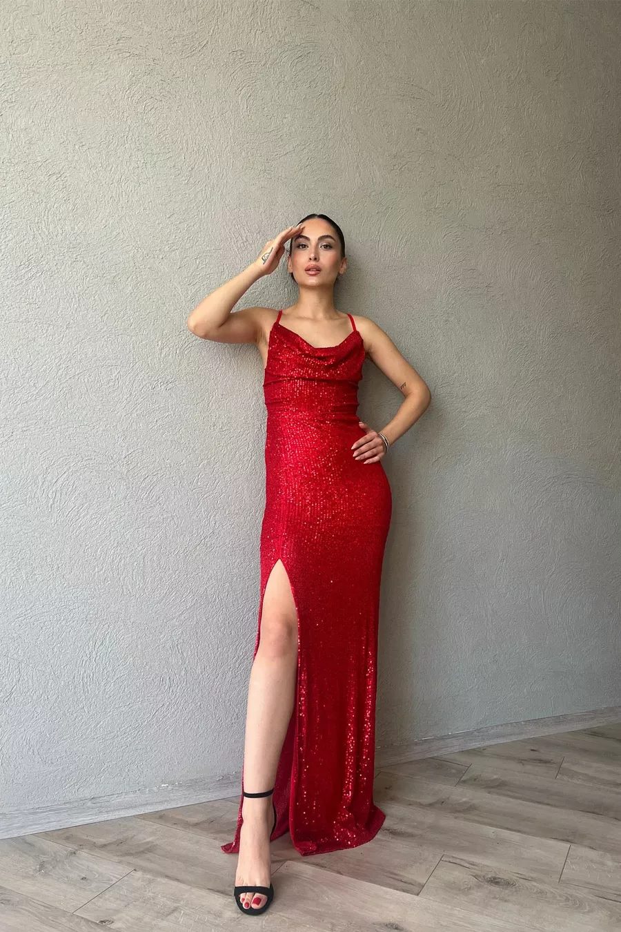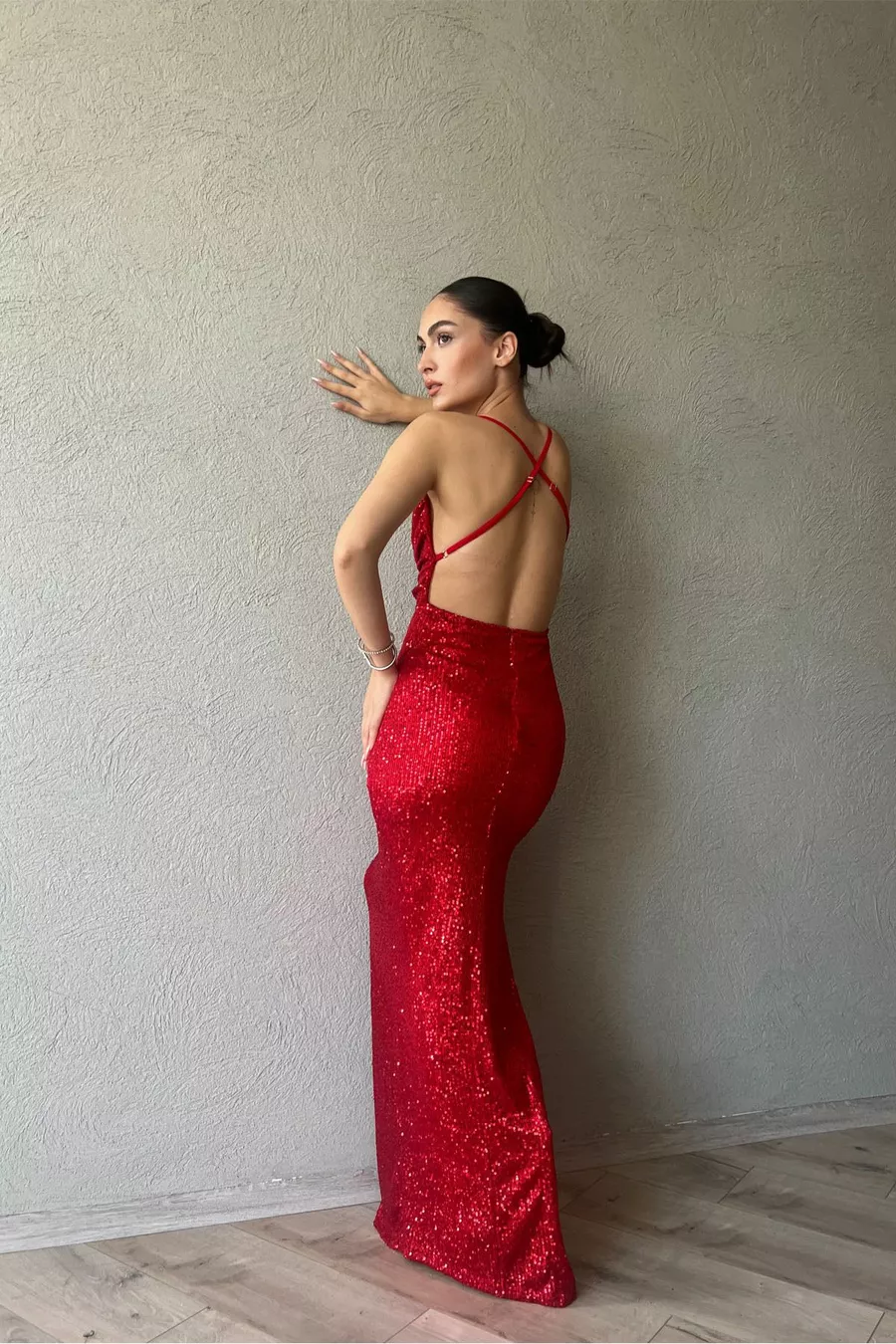 Red Strait Slit Detailed Low-Cut Sequin Dress