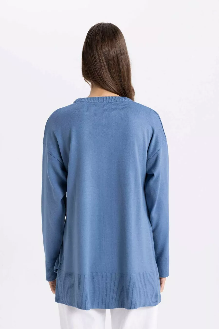 Regular Fit Crew Neck Side Slit Basic Plain Knit Sweater Tunic AU