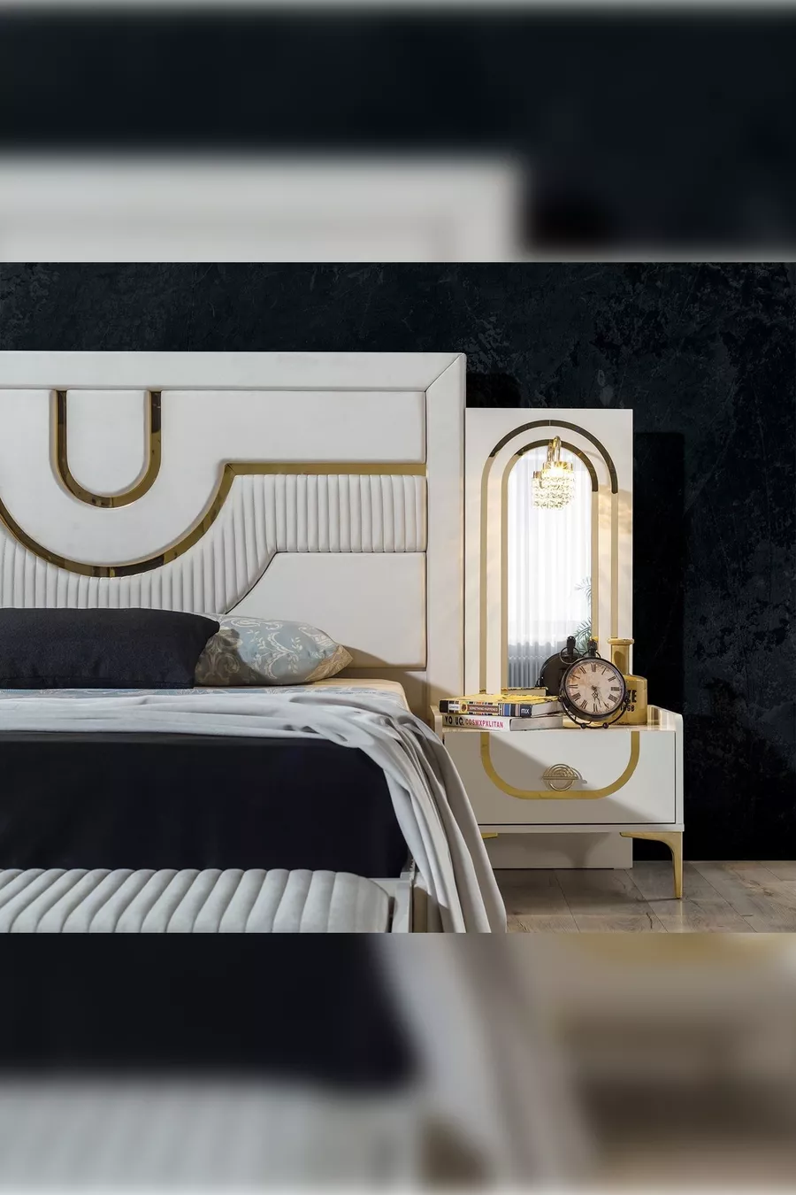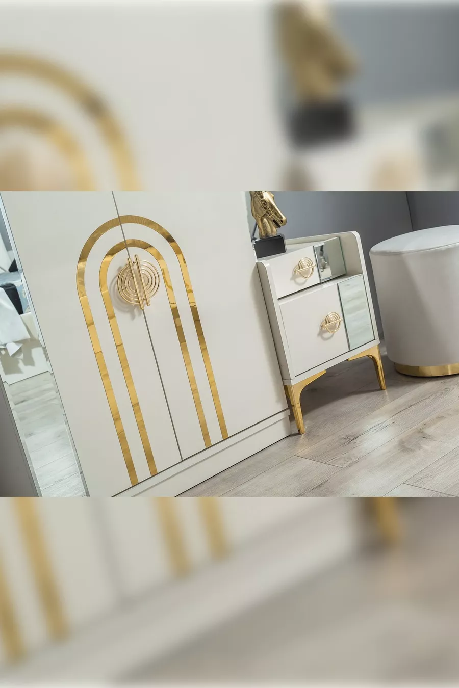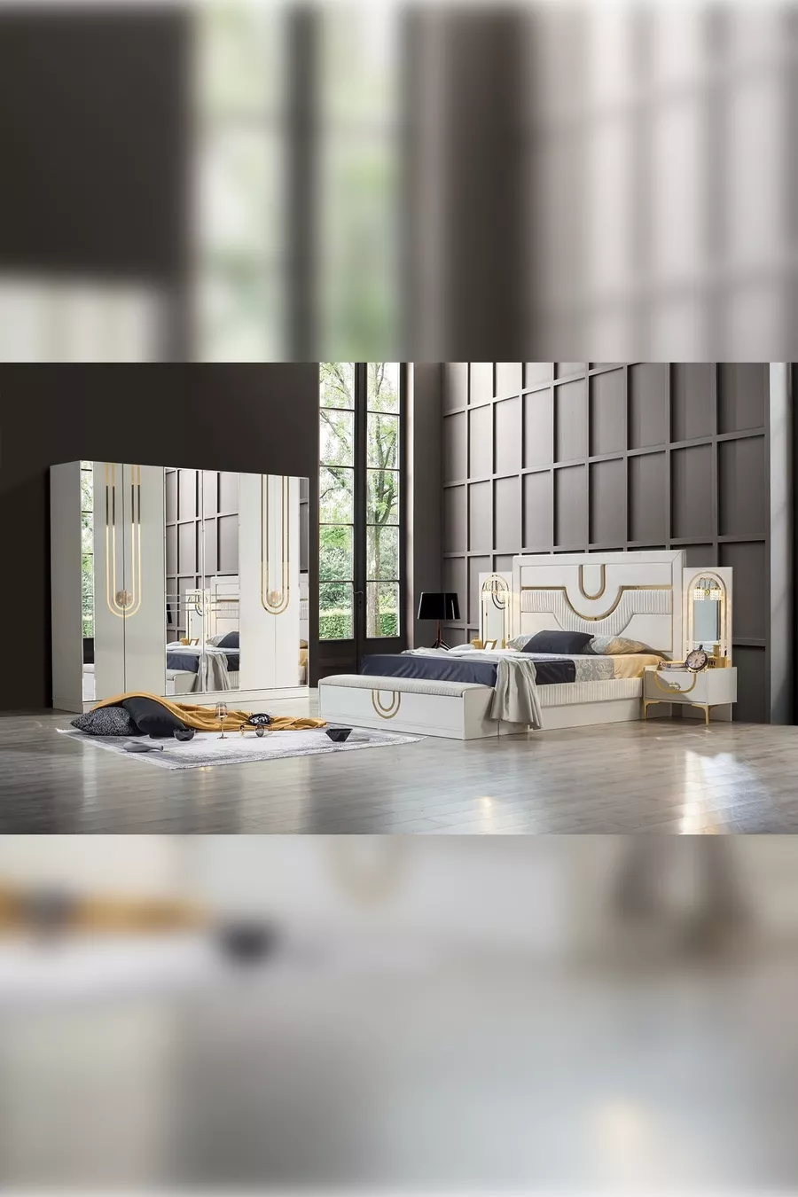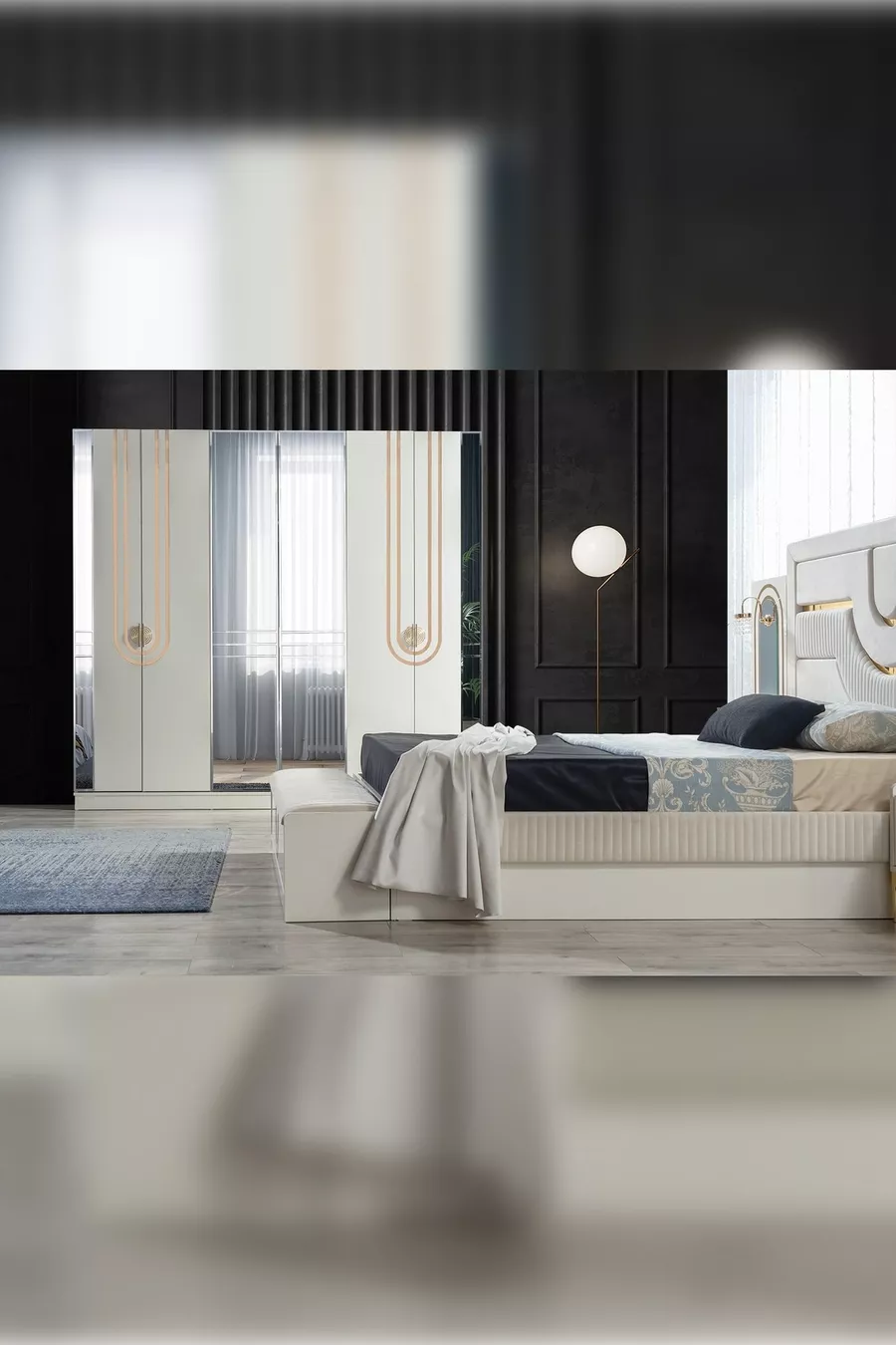 Set Contents: Bed + 2 Nightstands + Dresser + Wardrobe + Mirror