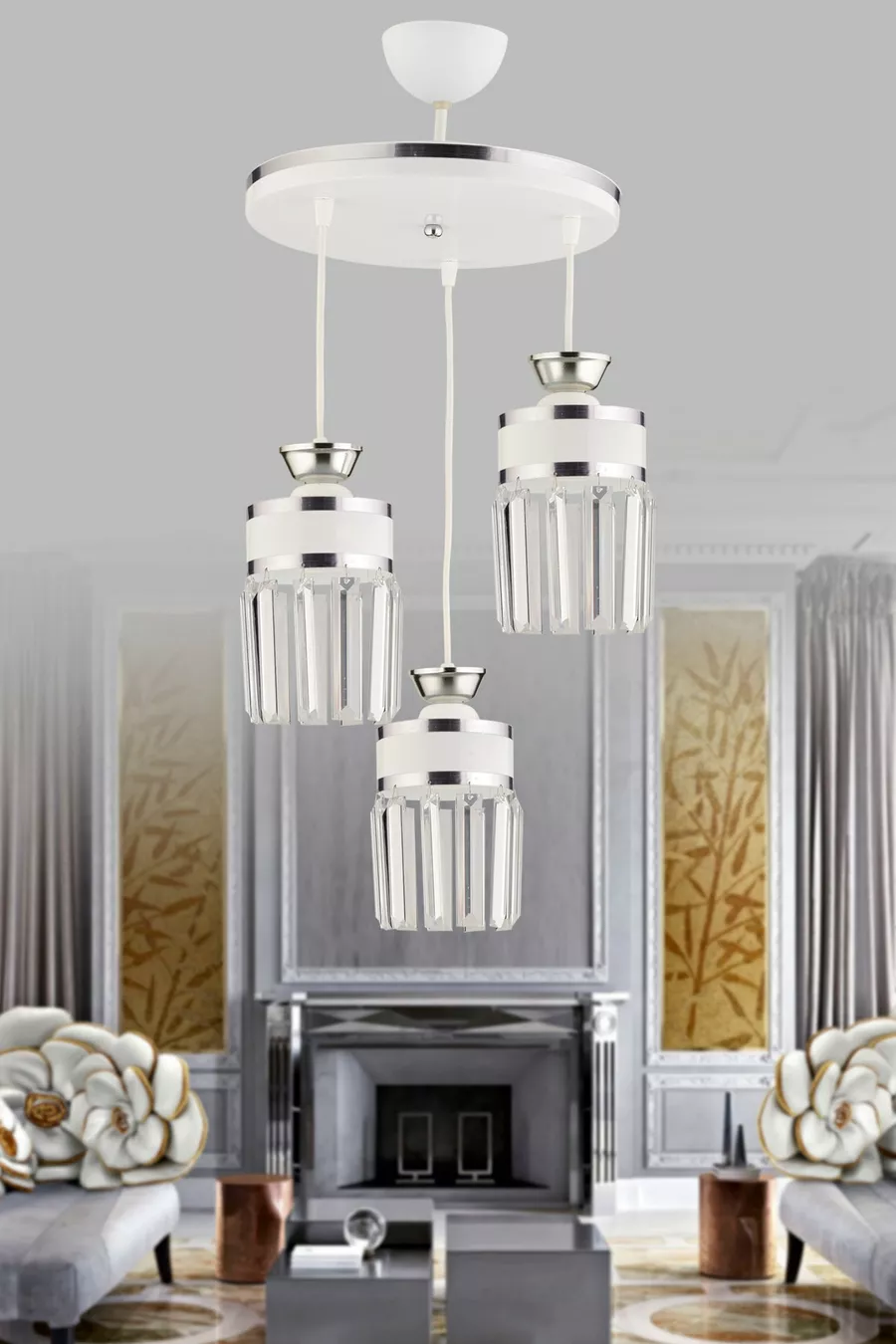 Material: Chrome Model: With Stones Socket Type: E27 Number of Bulb Sockets: 3 Color: White Size/Dimension: 30 x 60 Height: 51 - 60 cm Usage Area: Living Room Origin: TR Feature: Air