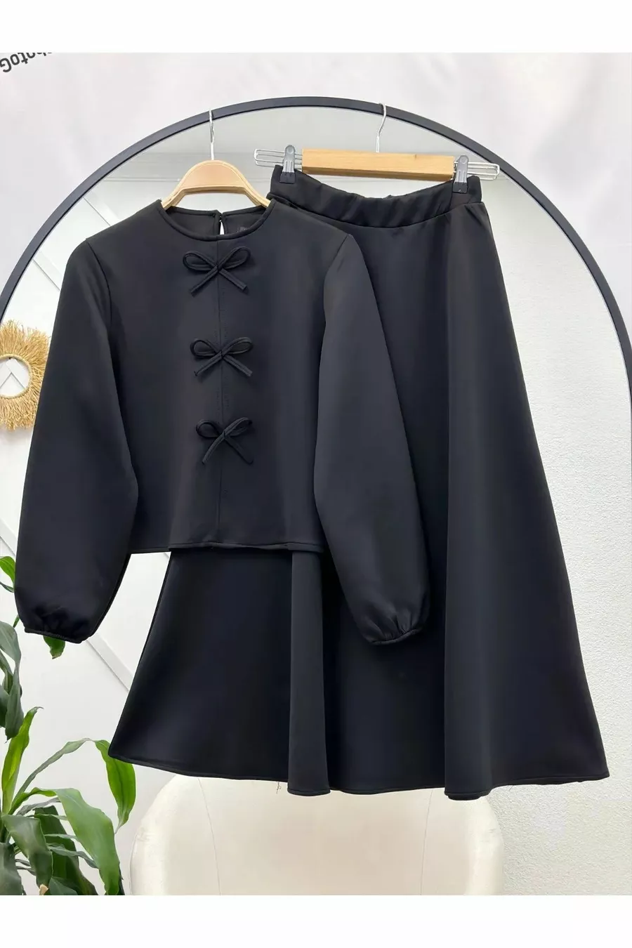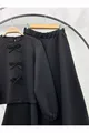 Silhouette: Regular Weave Type: Double Face Pattern: Plain Fit: Regular Neckline Type: Crew Neck Fabric Type: Woven Material: Polyester Color: Black Pocket: No Pockets Product Detail: Bow Detail Sleeve Length: Long Collection: Design Set: Tunic-Skirt Additional Feature: Elastic Waist Sleeve Type: Standard Sleeve Sustainability Detail: Yes Closure Type: Buttoned Length: Long Belt/Strap: Without Belt Persona: Office Occasion: Daily Waist: Regular Waist Lining: Unlined Thickness: Medium Washing Instructions: Type 1 Cuff Type: Regular Package Contents: Single Season: All Seasons Origin: TR Box Condition: No Box Number of Pieces: 2