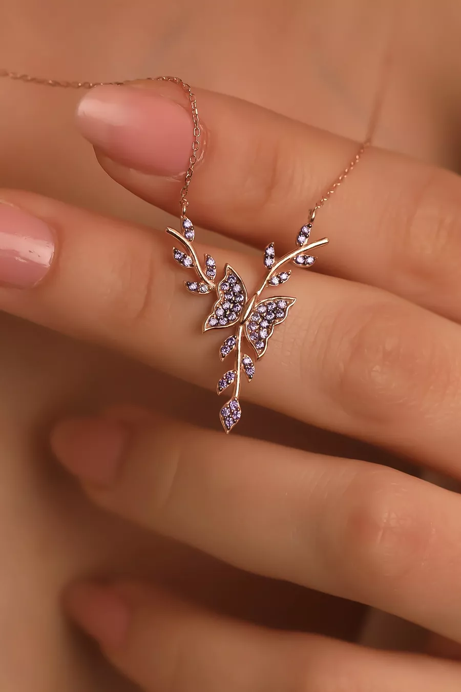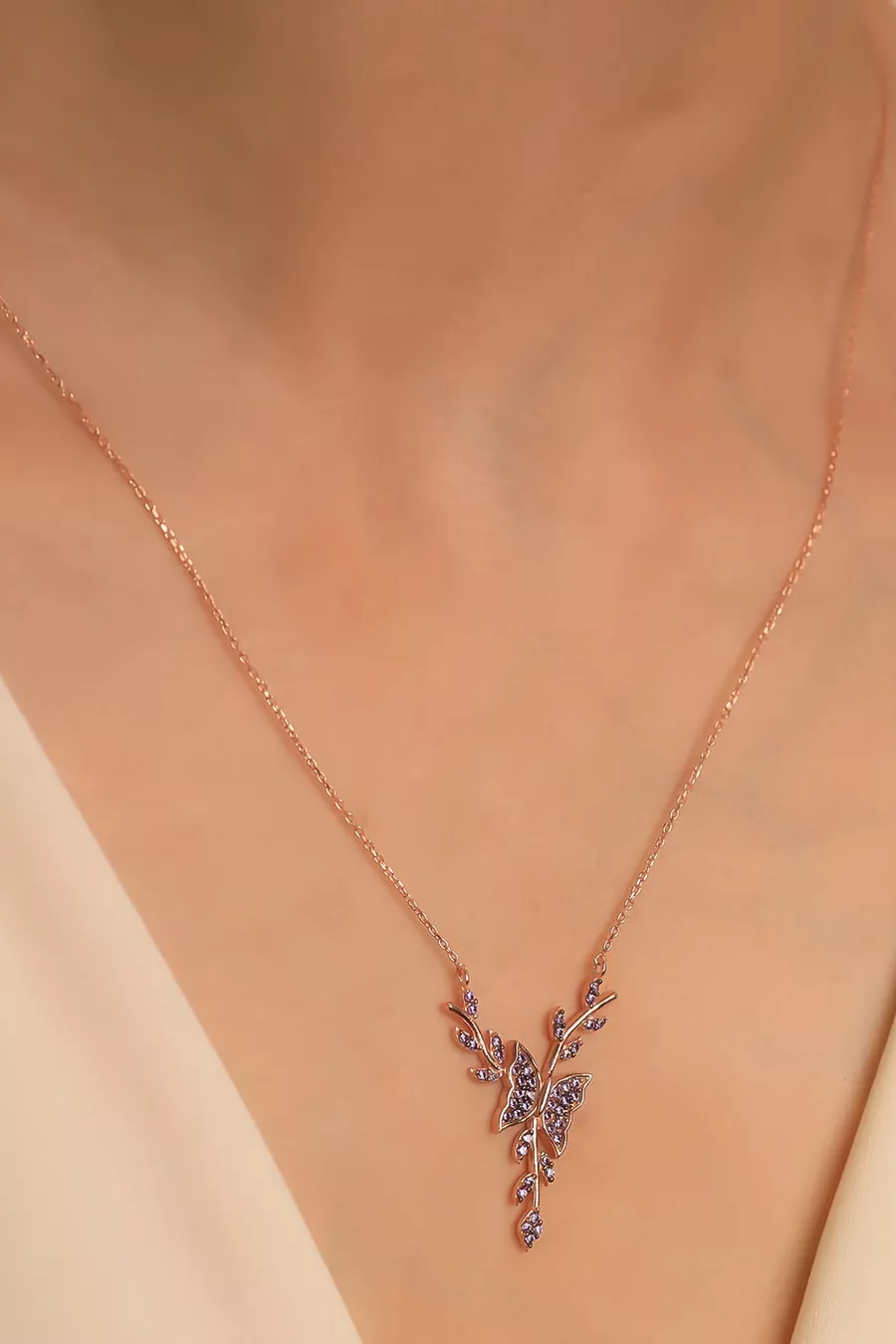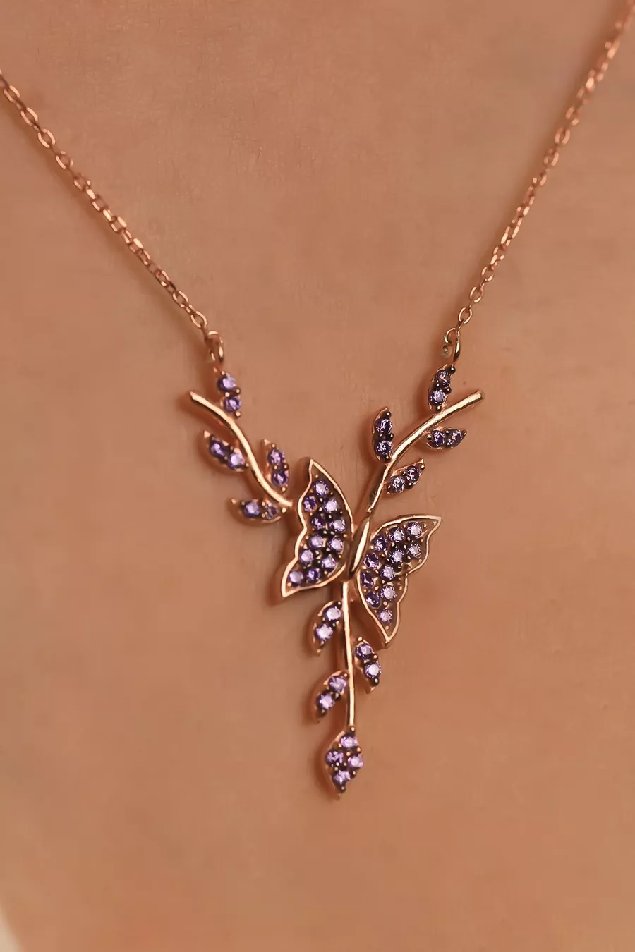 Setting Silver Amethyst Stone Bud Butterfly Necklace