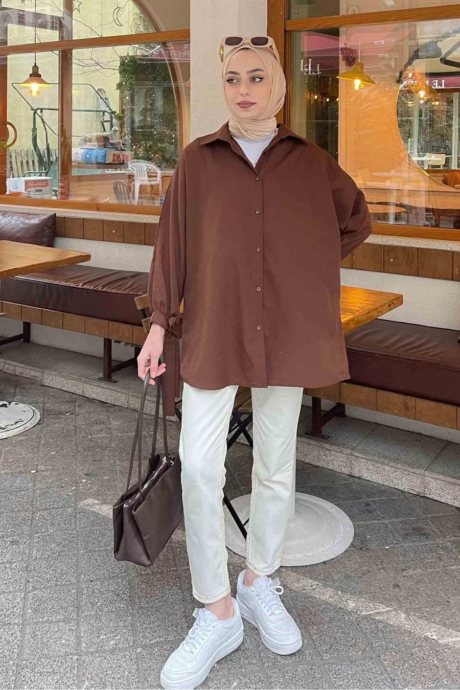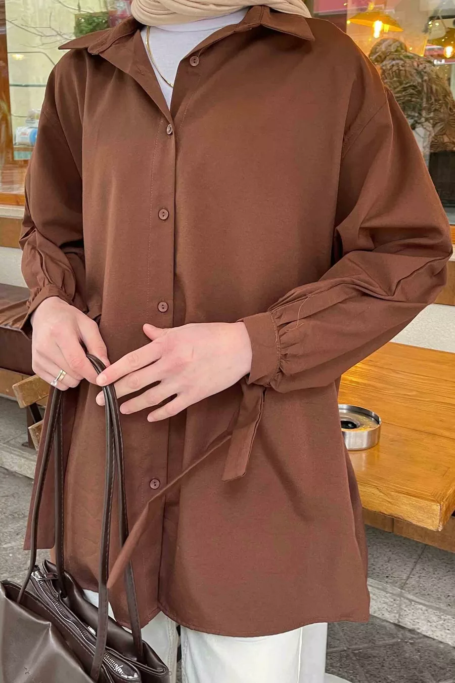 Shirt with Sleeve Details Oversized Shirt Dark Brown