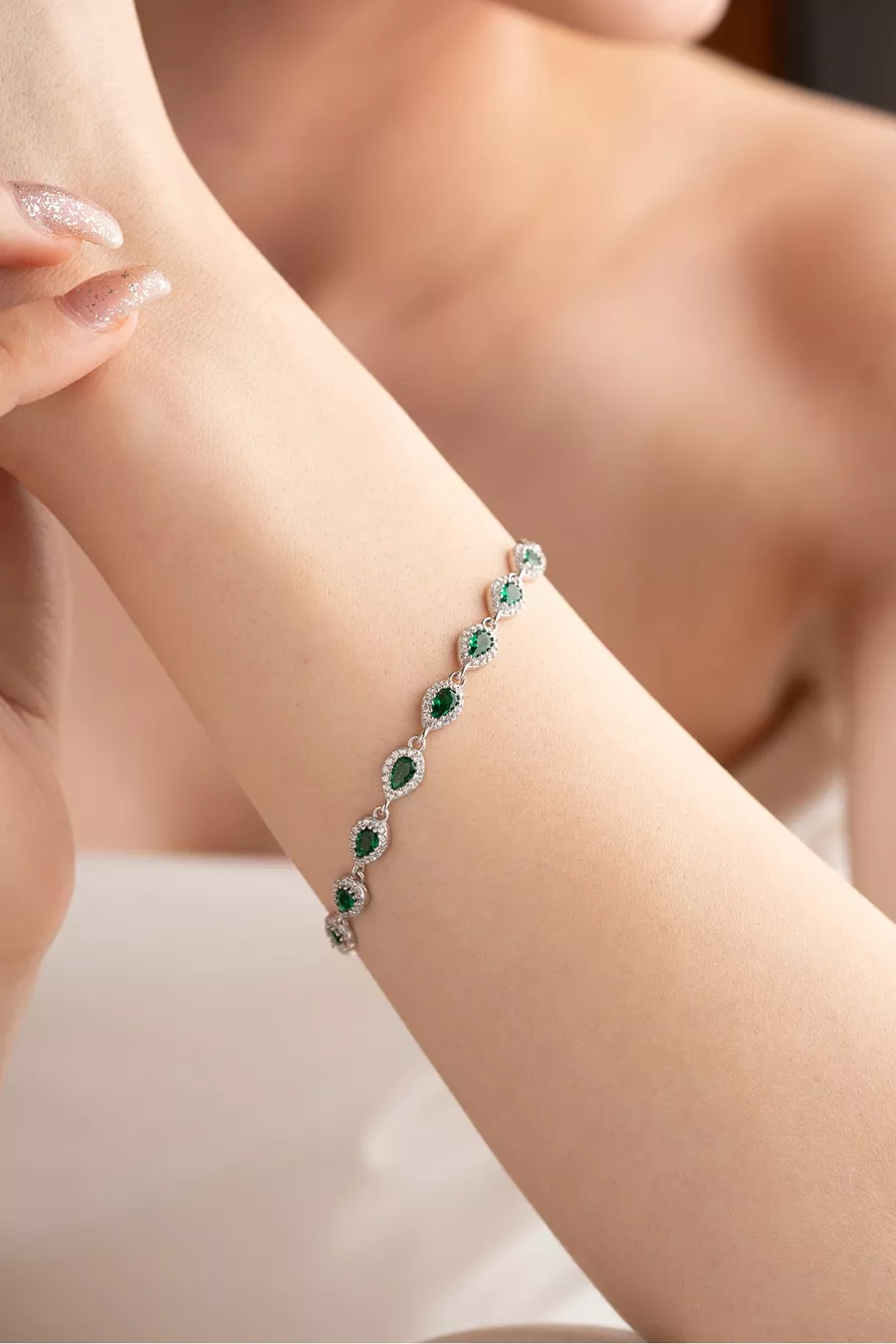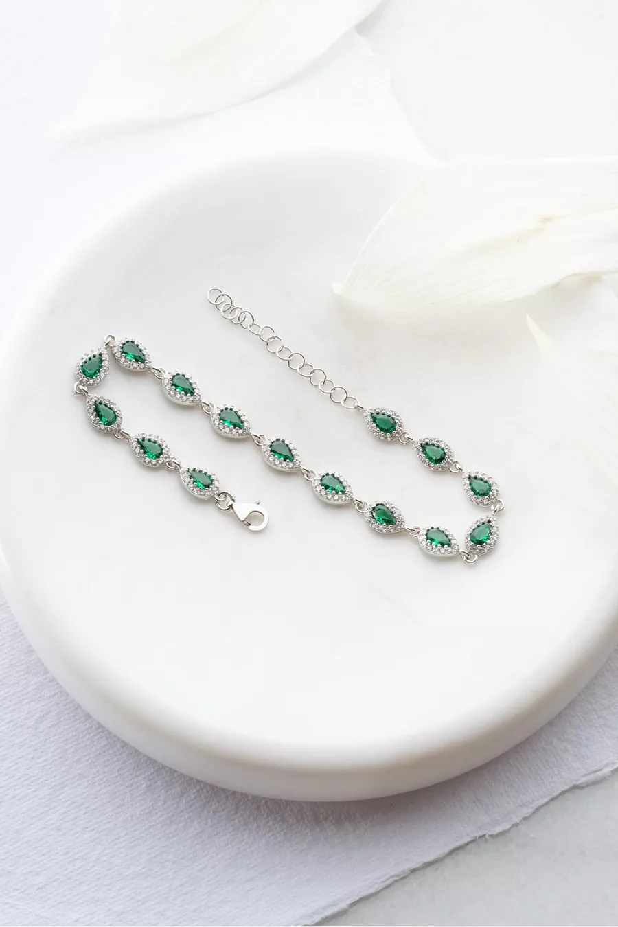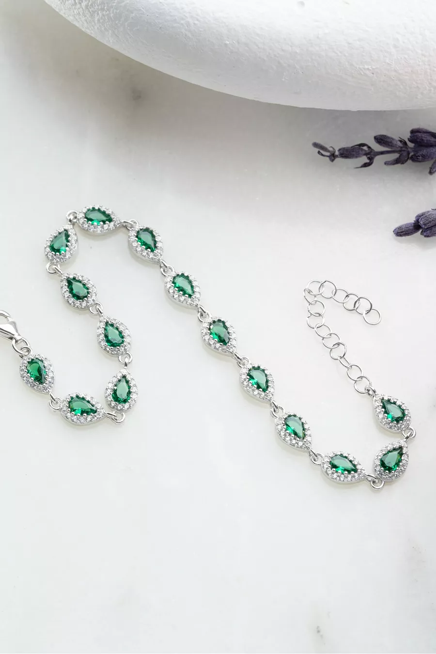 Silver Plated Rhodium Bracelet with Sequential Green Drop Zircon Stones