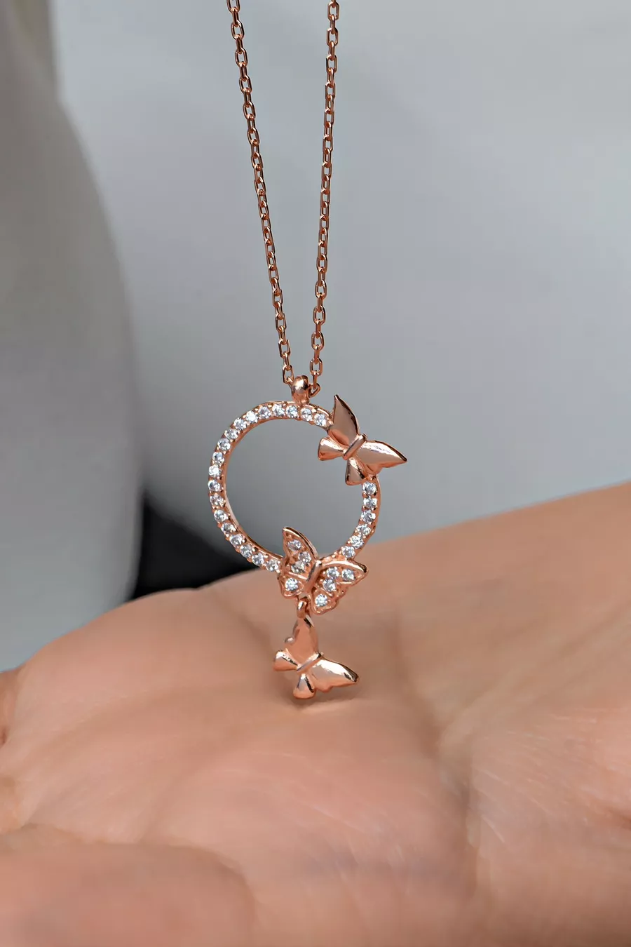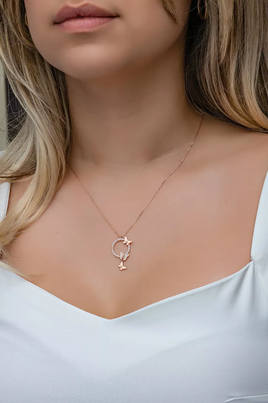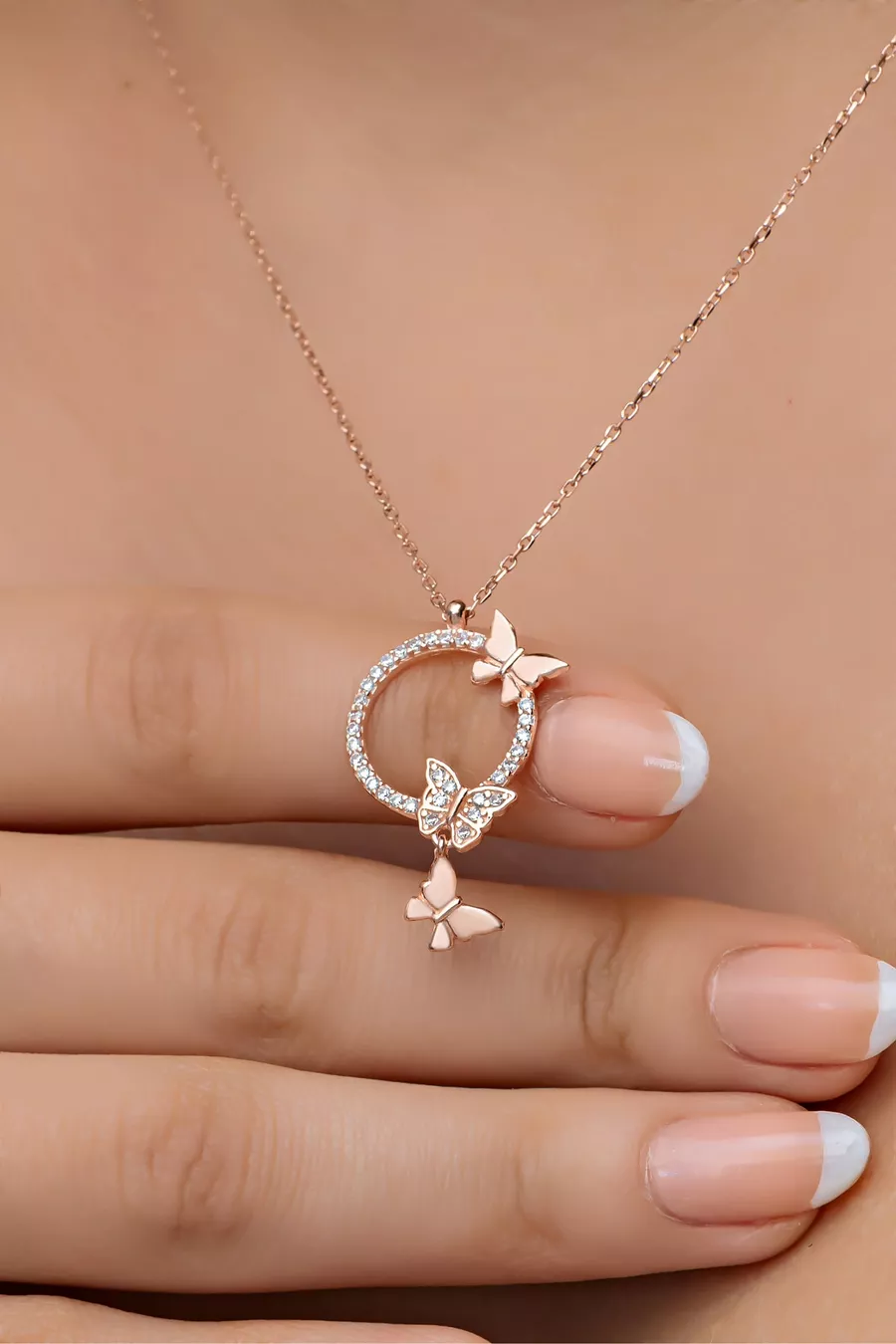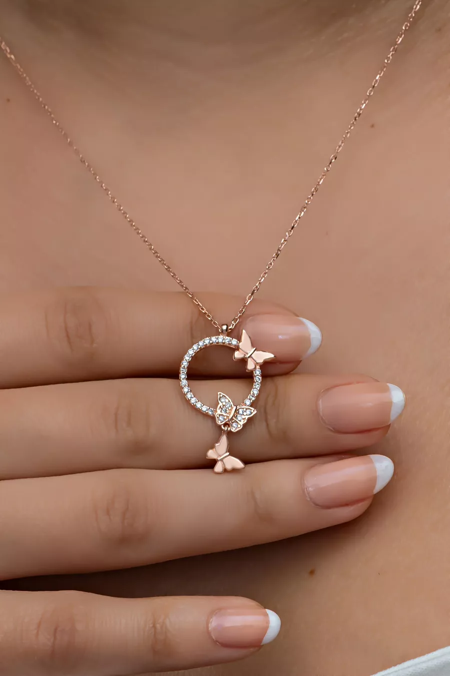 Silver Setting Circle Design Flying Love Butterflies Necklace
