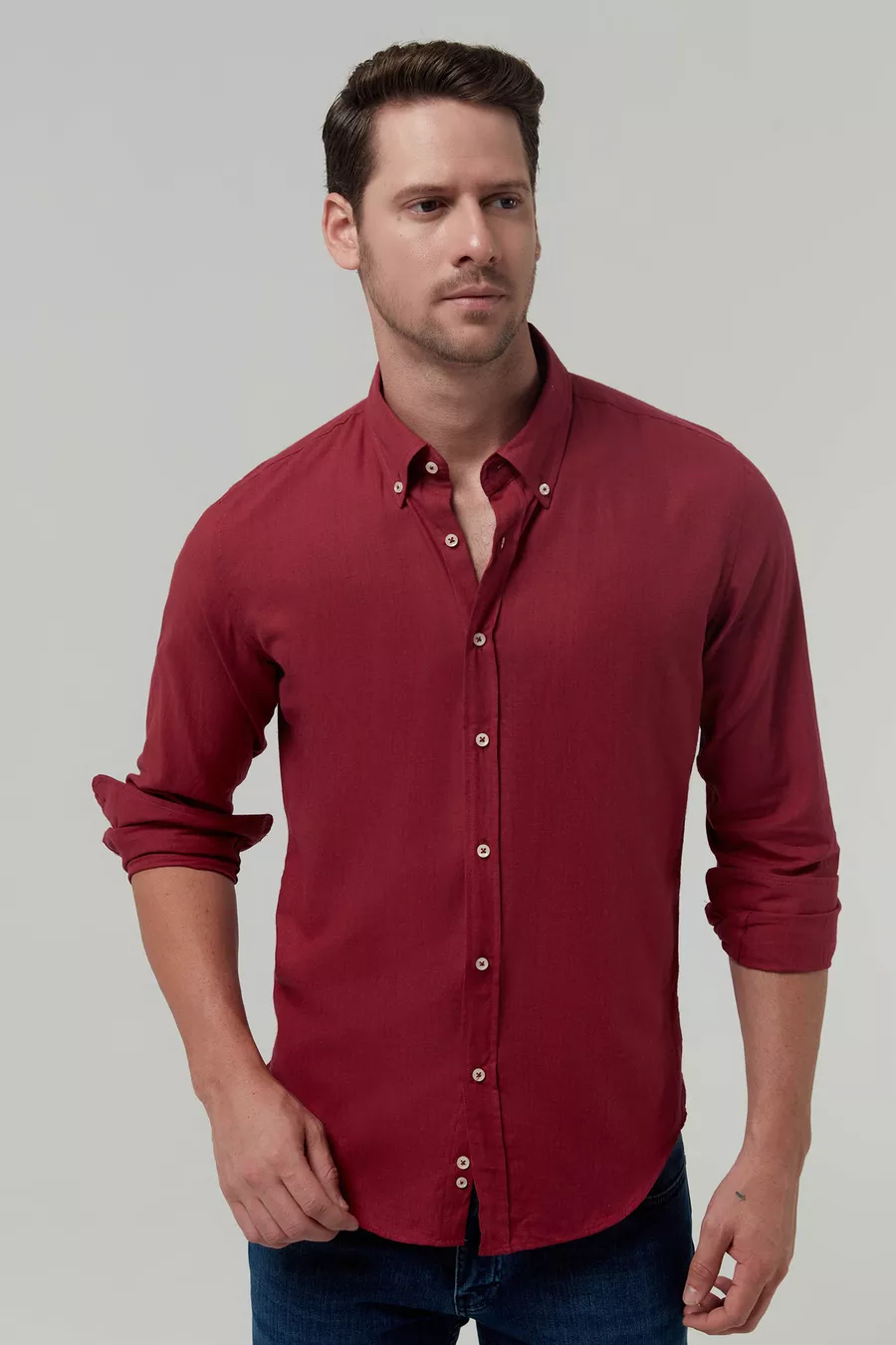 Slim Fit Red Plain Cotton Shirt