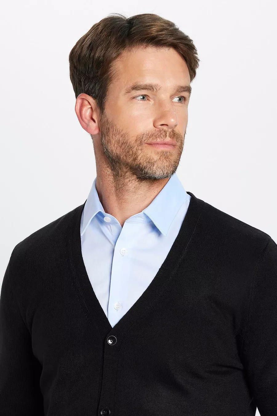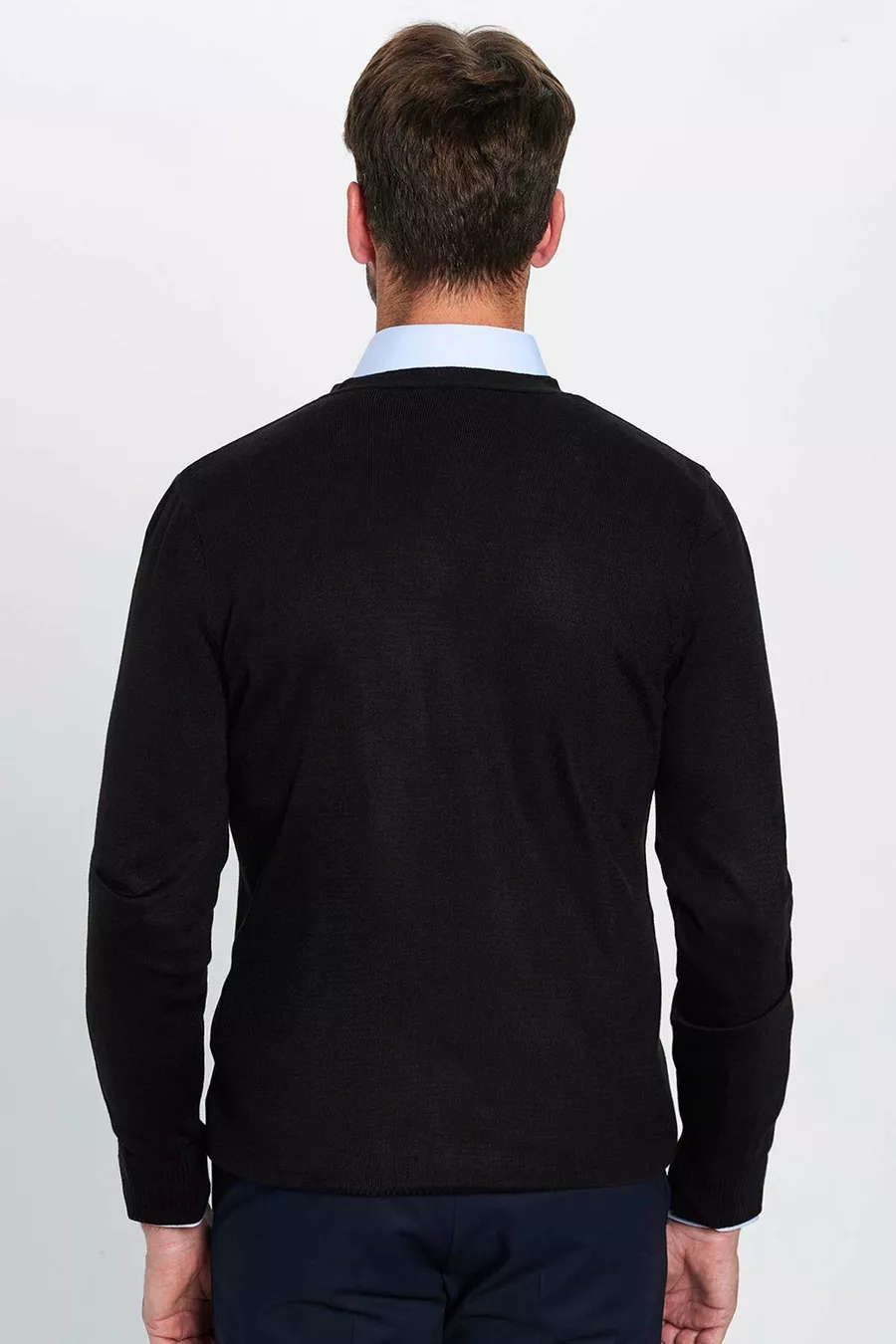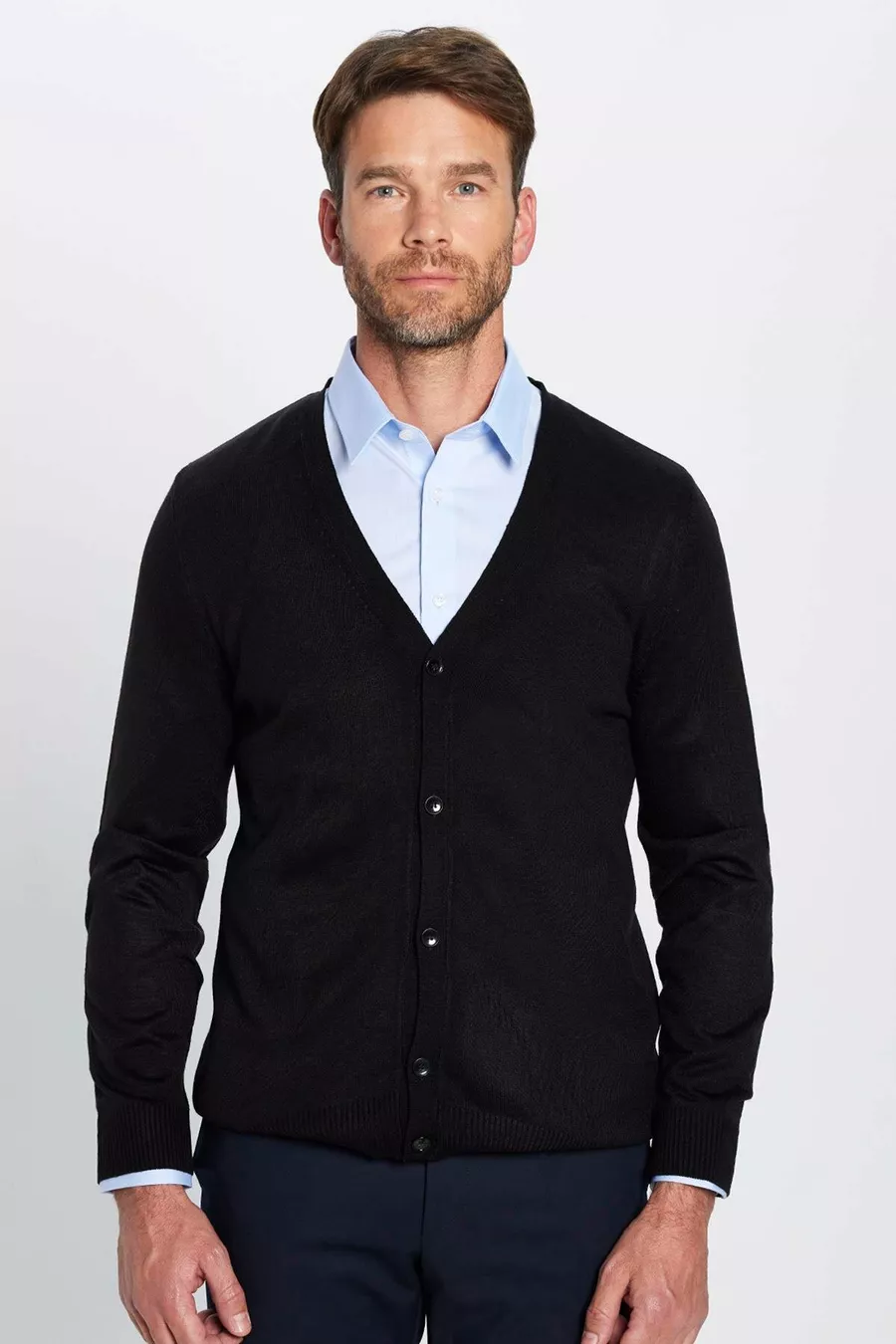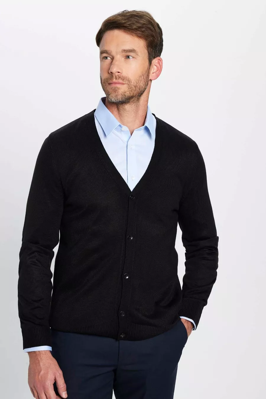 Material: Polyester Blend Sleeve Type: Long Sleeve Pattern: Plain Fit: Slim Fit Fabric Type: Woven Color: Black Neck Type: V-Neck Product Detail: Buttoned Product Type: Plain Pocket: No Pockets Sleeve Length: Long Collection: Menswear Thickness: Medium Length: Regular Silhouette: Slim Occasion: Casual/Daily Additional Feature: No Additional Feature Print/Embroidery Technique: No Print Closure Type: Buttoned Number of Pieces: 1 Persona: None Sustainability Detail: No Weave Type: Knit-look Belt/Strap Status: No Belt Material Composition: 100% Acrylic Washing Instructions: Type 1 Season: Winter Origin: TR Box Status: No Box