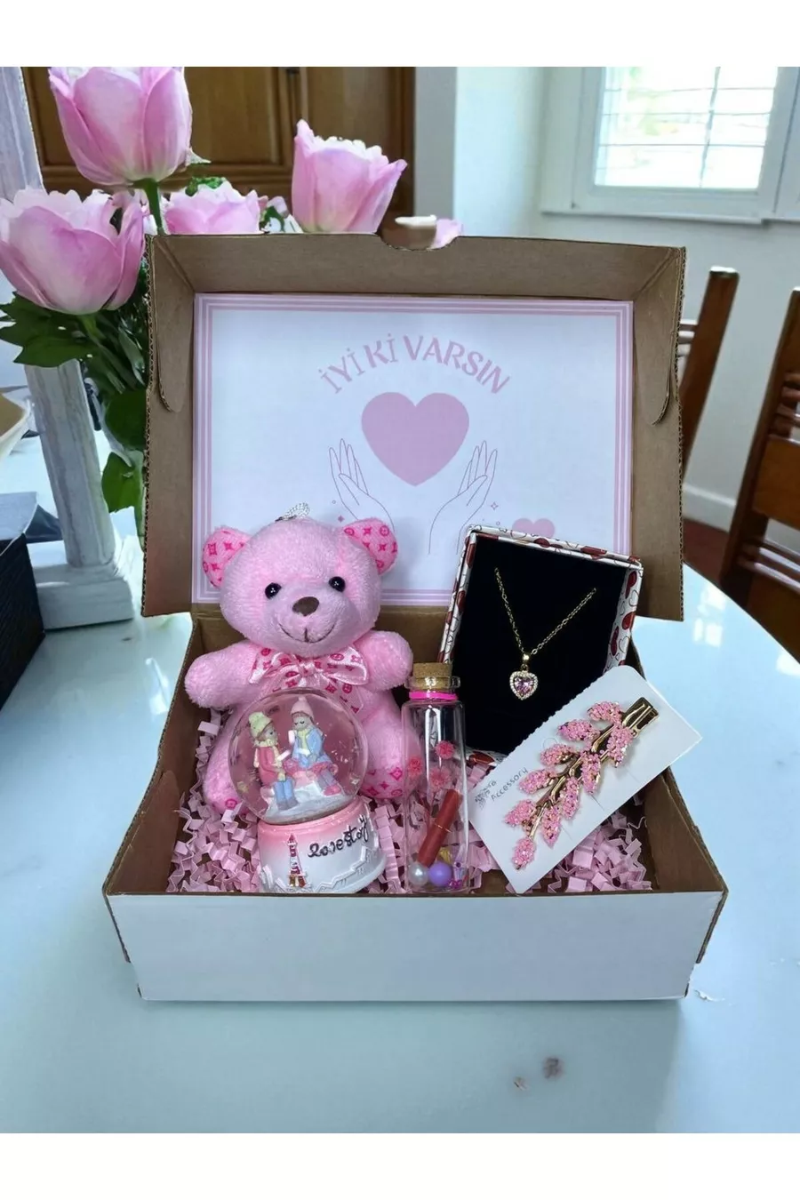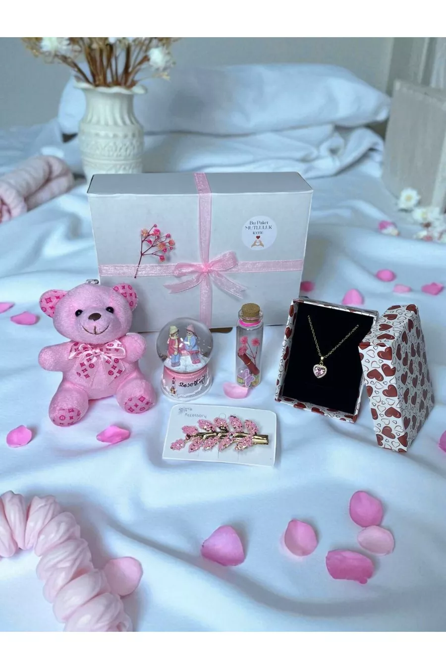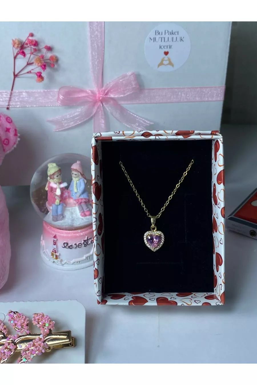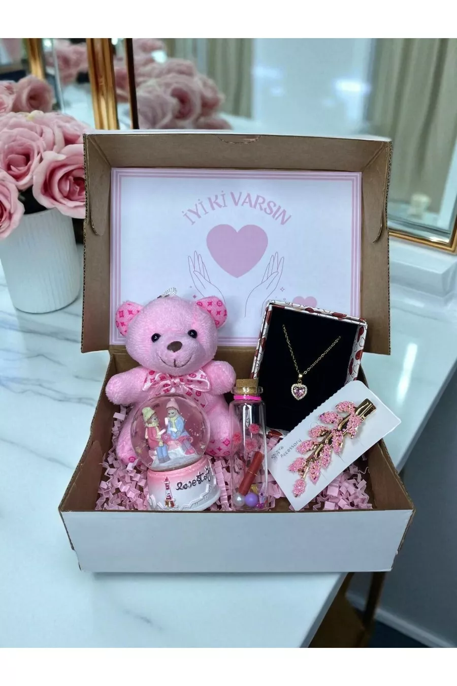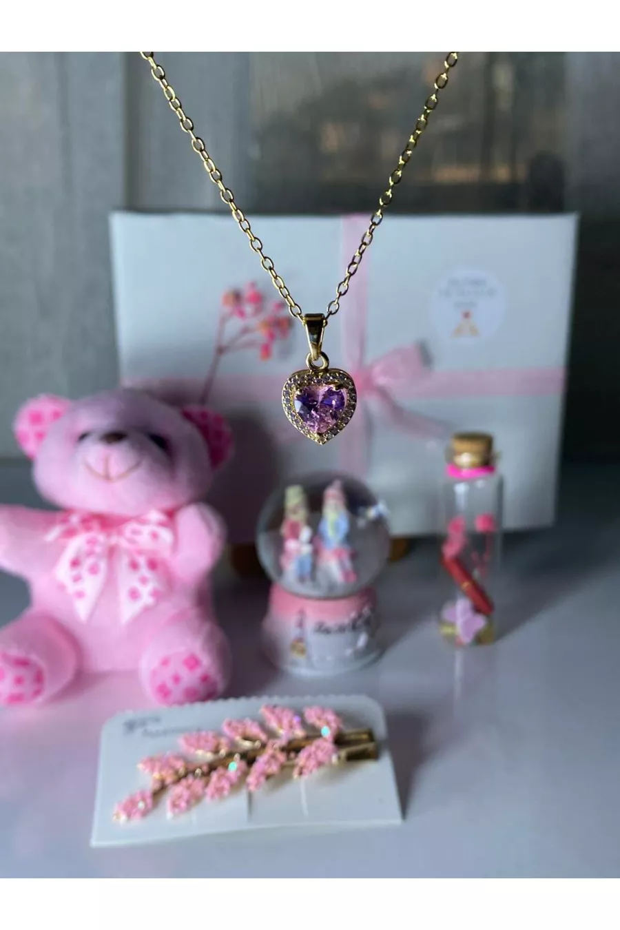 Other Features: A meaningful gift box for special occasions with a plush teddy bear, heart necklace, light-up snow globe, hair clip, and wish bottle. Origin: TR