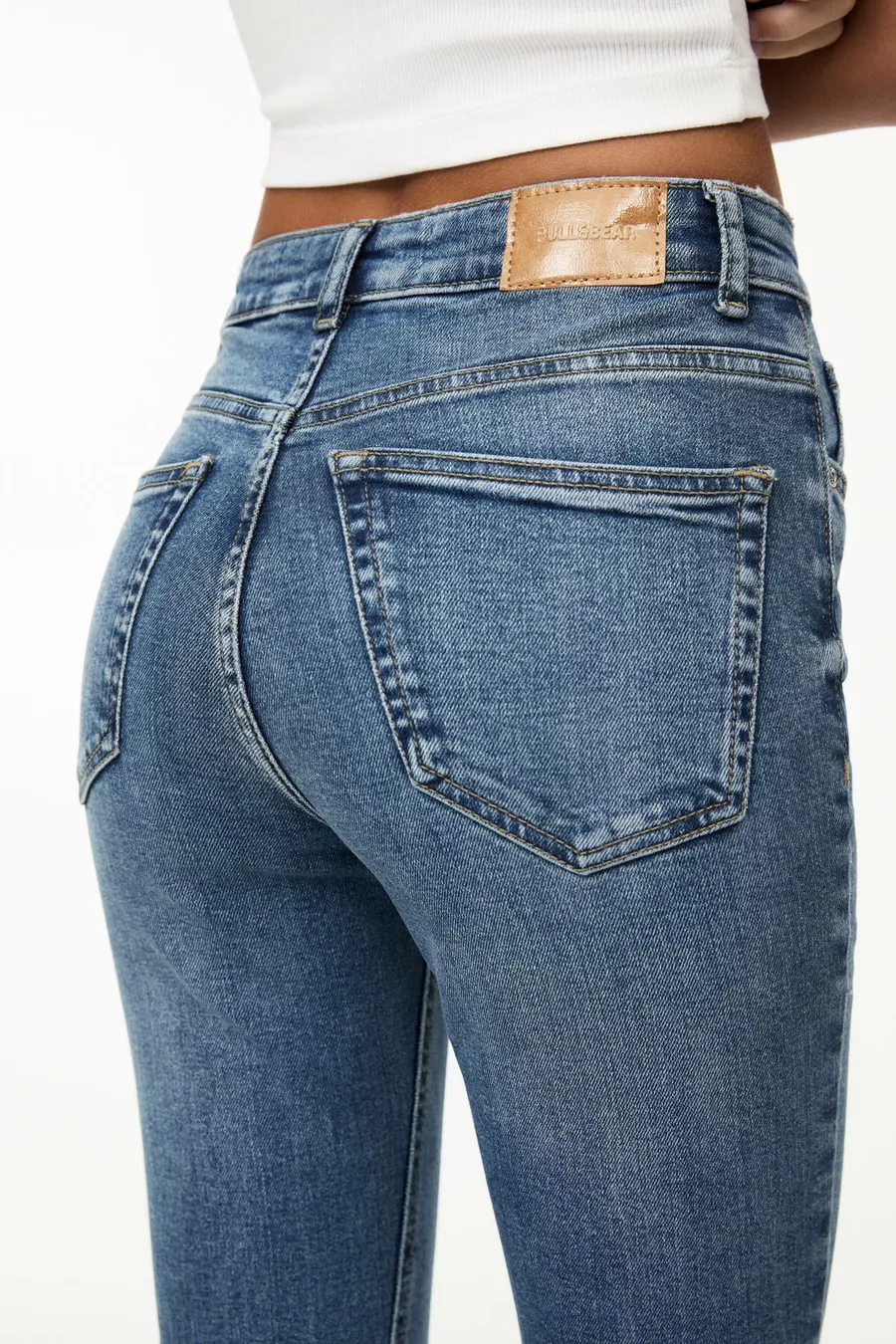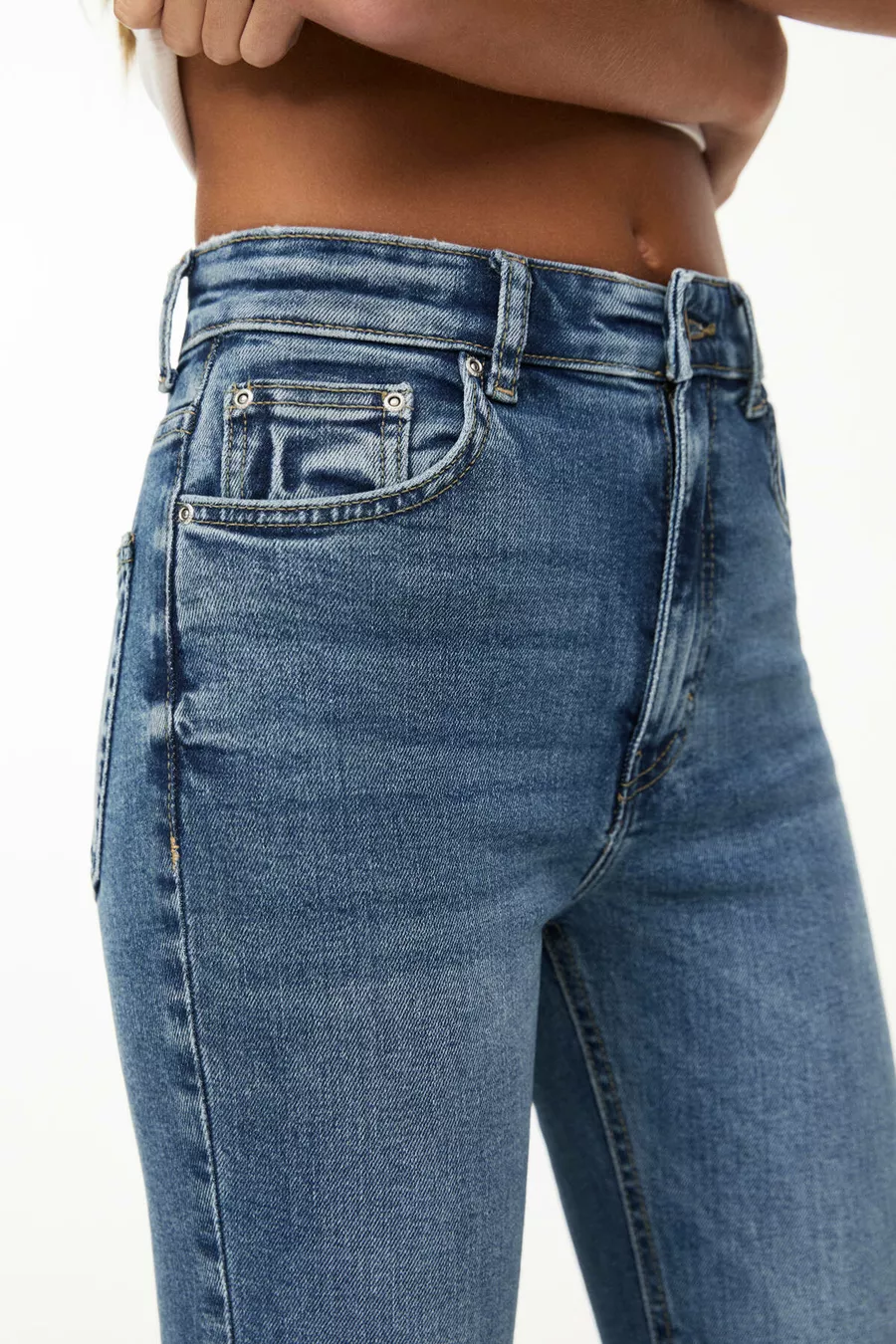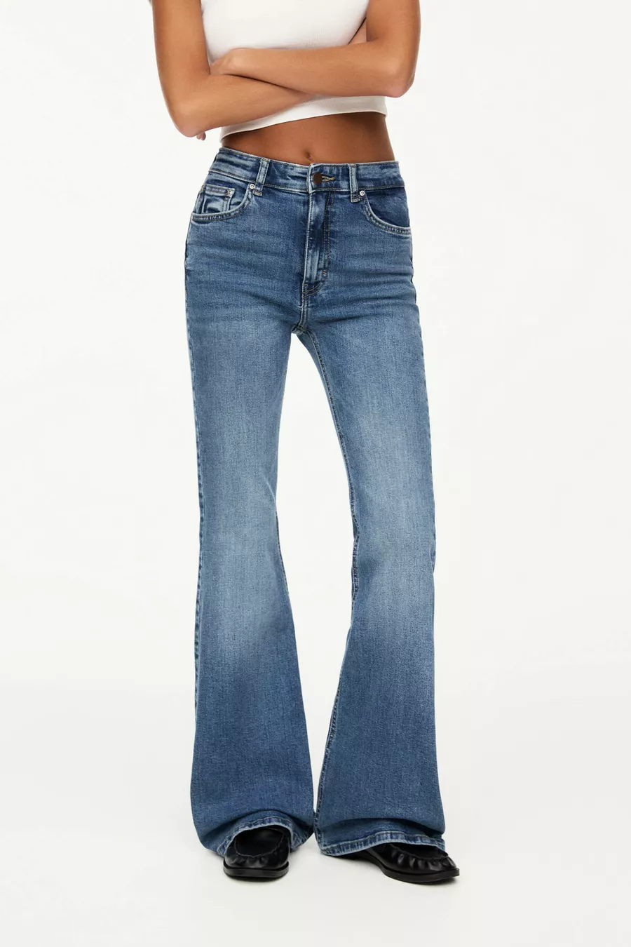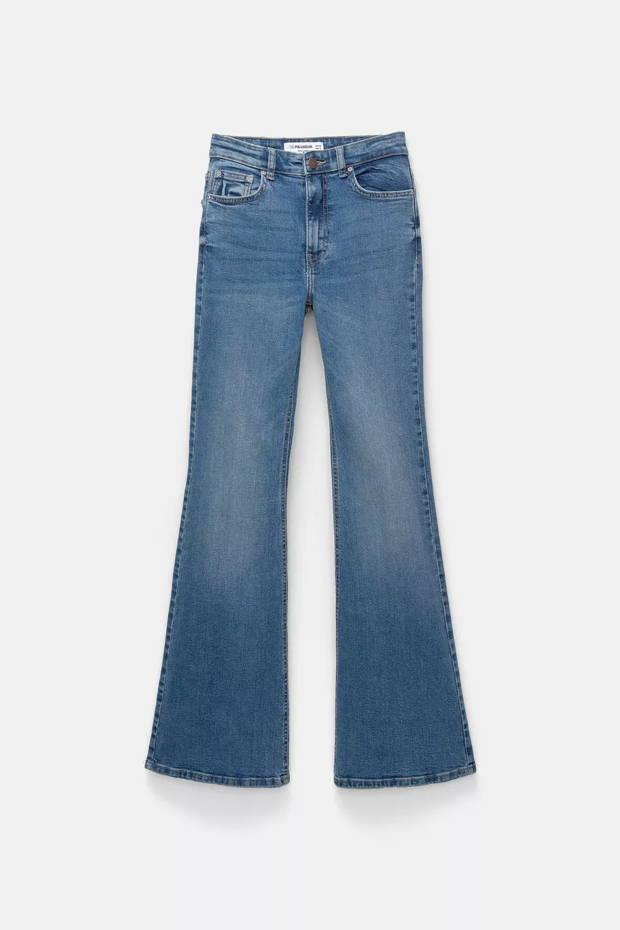 Leg Type: Flared Belt/Buckle: With Belt Waist: High Waist Color: Blue Material: Cotton Pockets: 5 Pockets Product Type: Plain Collection: Basic Length: Regular Fabric Type: Denim Silhouette: Basic Occasion: Casual/Daily Fit: Regular Pattern: Plain Additional Feature: Washed Closure Type: Button + Zipper Weave Type: Denim Sustainability Detail: No Persona: Cool & Comfort Washing Instructions: Type 1 Season: All Seasons Origin: PK Box Condition: No Box